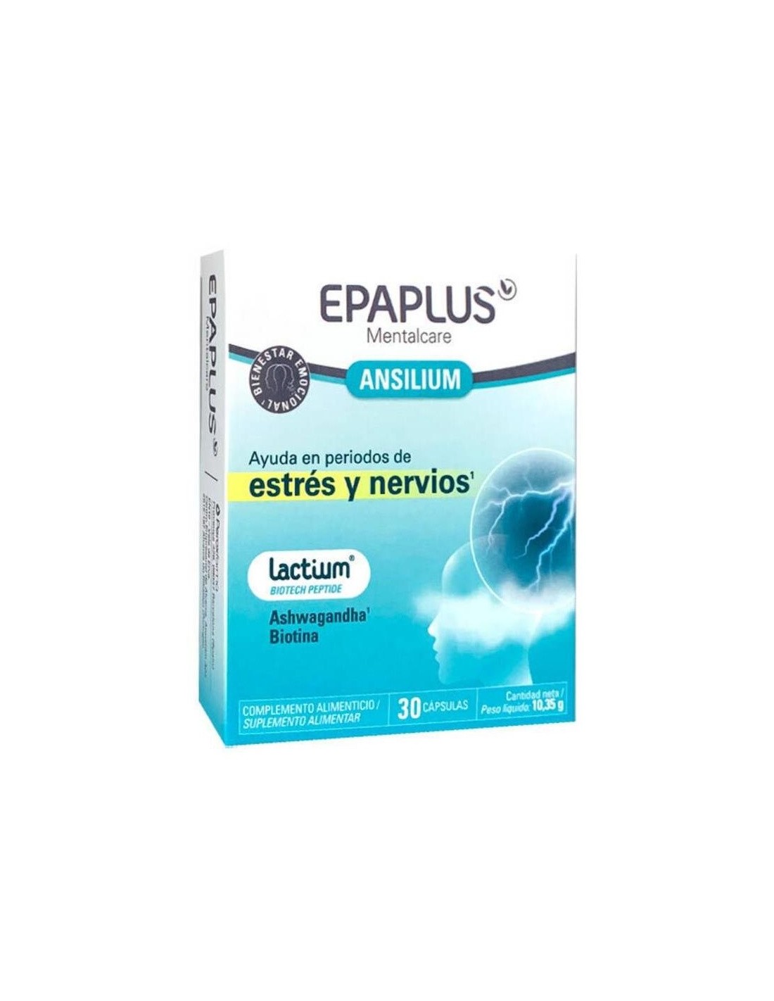 EPA PLUSEpaplus Mentalcare Ansilium es un complemento alimenticio que ayuda en periodos de estrés y nervios ya que contiene Lactium® (proteína extraída de la leche), ashwagandha y biotina. La ashwagandha ayuda a mantener el balance emocional y al organismo a lidiar con el estrés. La biotina contribuye a mantener la función psicológica normal.