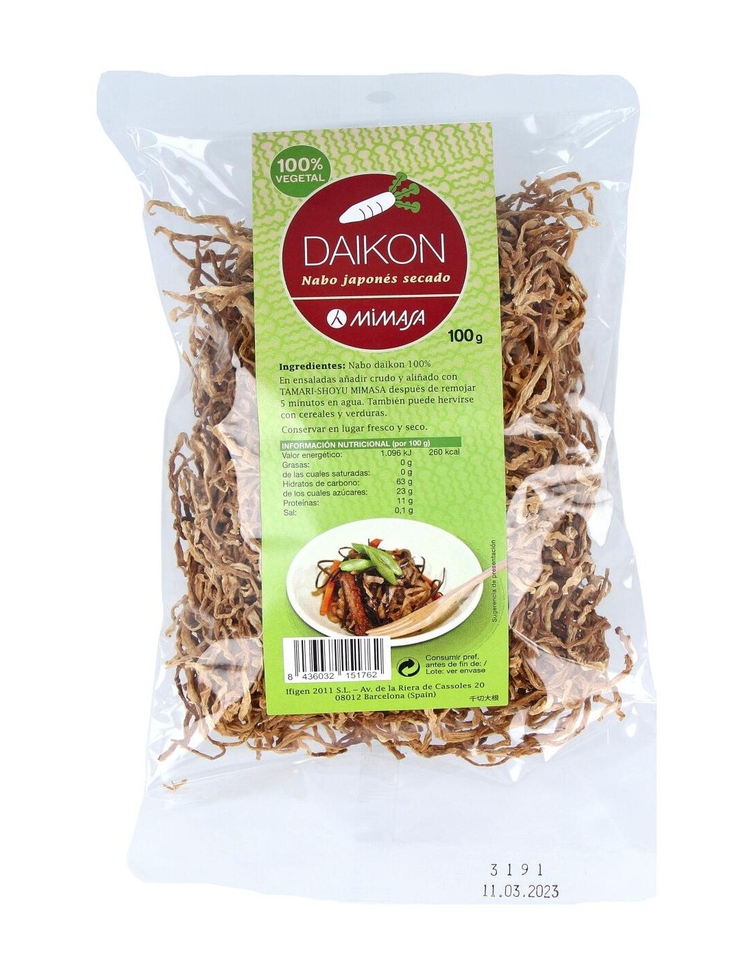 El Daikon de Mimasa está cuidadosamente seleccionado para mantener su frescura y características naturales. Su presentación en paquete de 100 gramos facilita su almacenamiento y uso en la cocina cotidiana, adaptándose a diversas preparaciones culinarias.