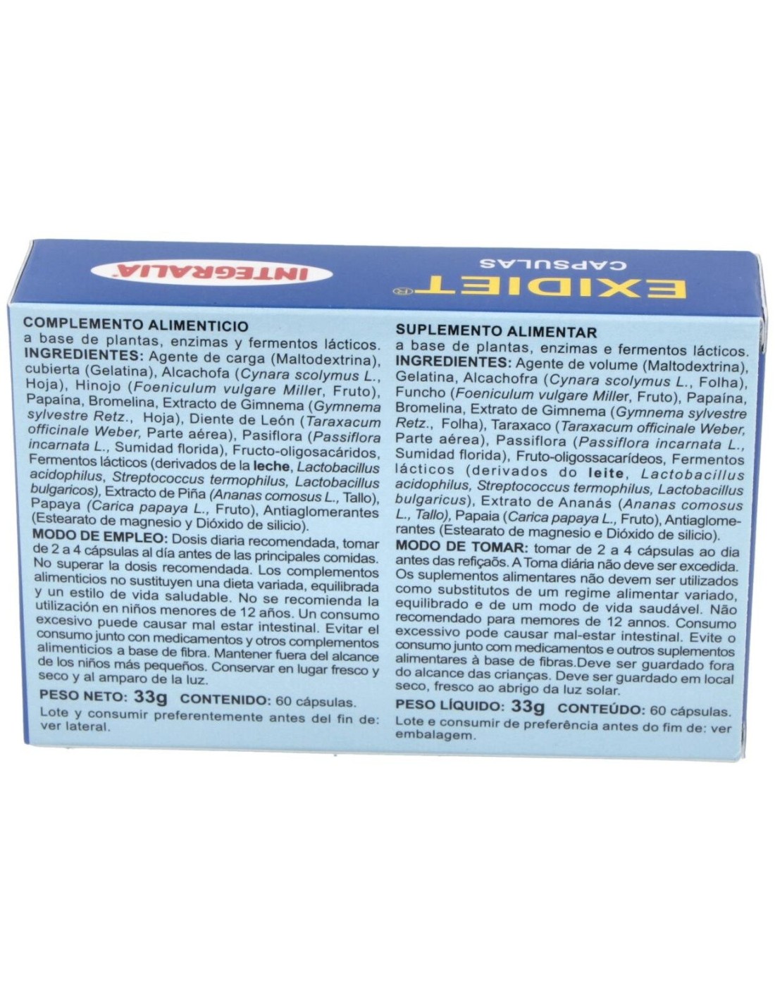 Exidiet Vientre Plano 60Cap. de Integralia es un complemento alimenticio para personas que buscan apoyar la reducción de la sensación de hinchazón, formulado con ingredientes que contribuyen al bienestar digestivo.