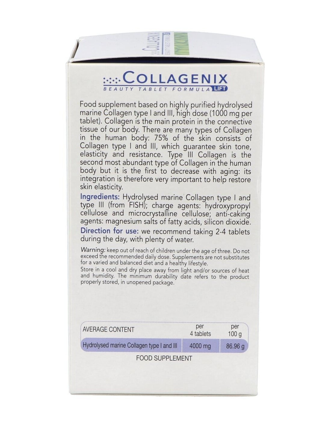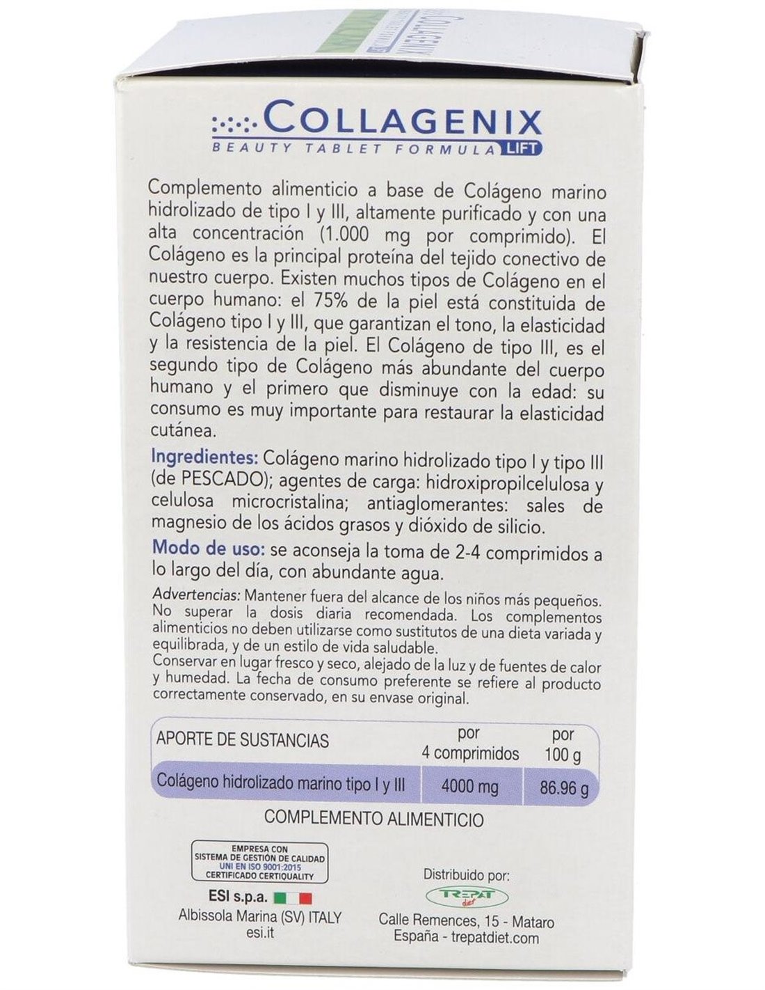 Colágeno marino tipo I y III (de pescado), Agentes de carga: hidroxipropilcelulosa y celulosa microcristalina: antiaglomerantes: sales de magnesio de los ácidos grasos y dióxido de silicio.