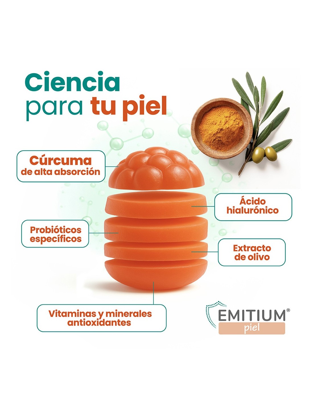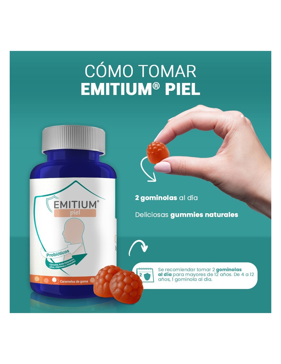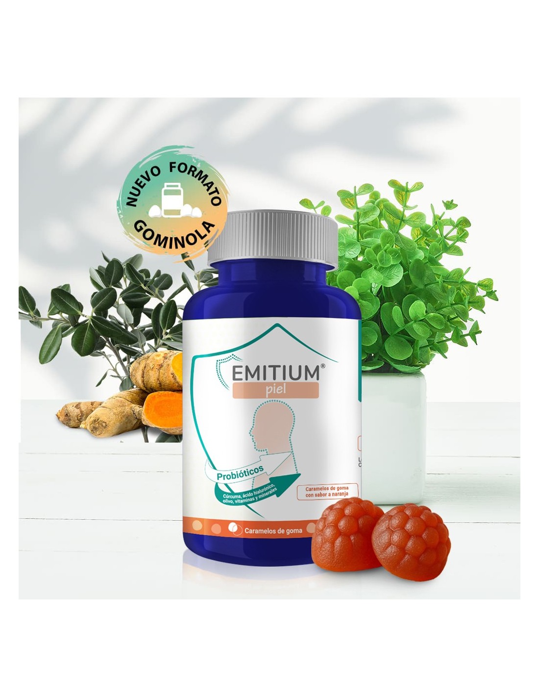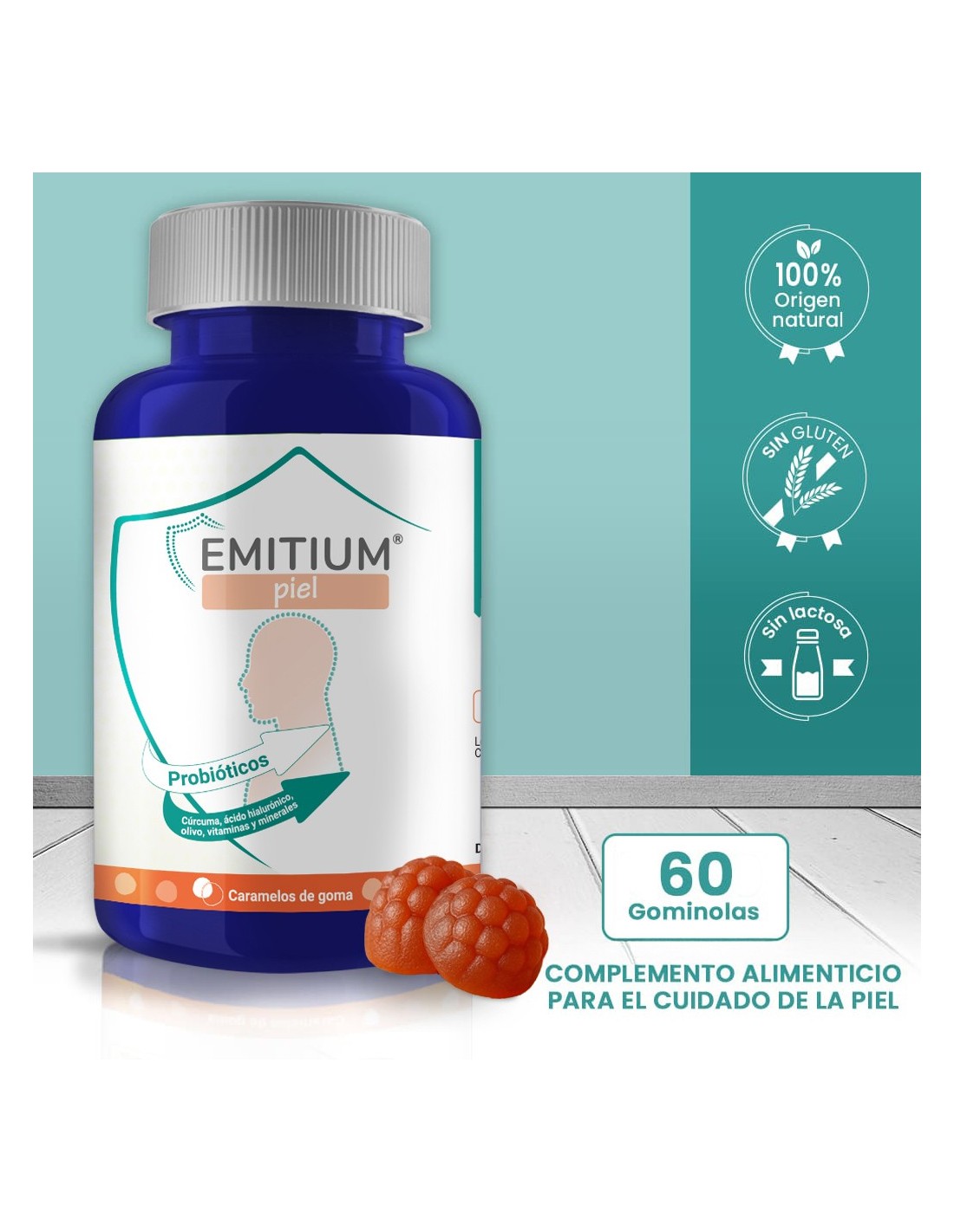 EMITIUM® Piel es un complemento alimenticio en formato gominola con sabor a naranja formulado específicamente para cuidar la piel desde el interior, ya que contiene ácido hialurónico y Vitaminas A, C, D, E, biotina, Cobre, Selenio y Zinc, con beneficios adicionales para la nutrición de la piel. También aporta extracto de olivo, rico en polifenoles como el hidroxitirosol, de propiedades antioxidantes.