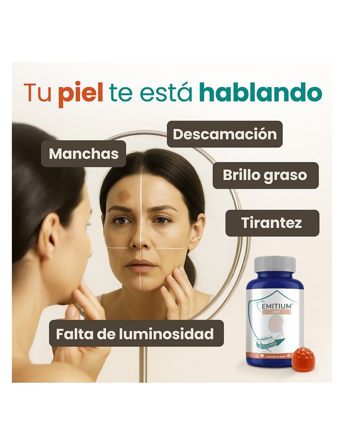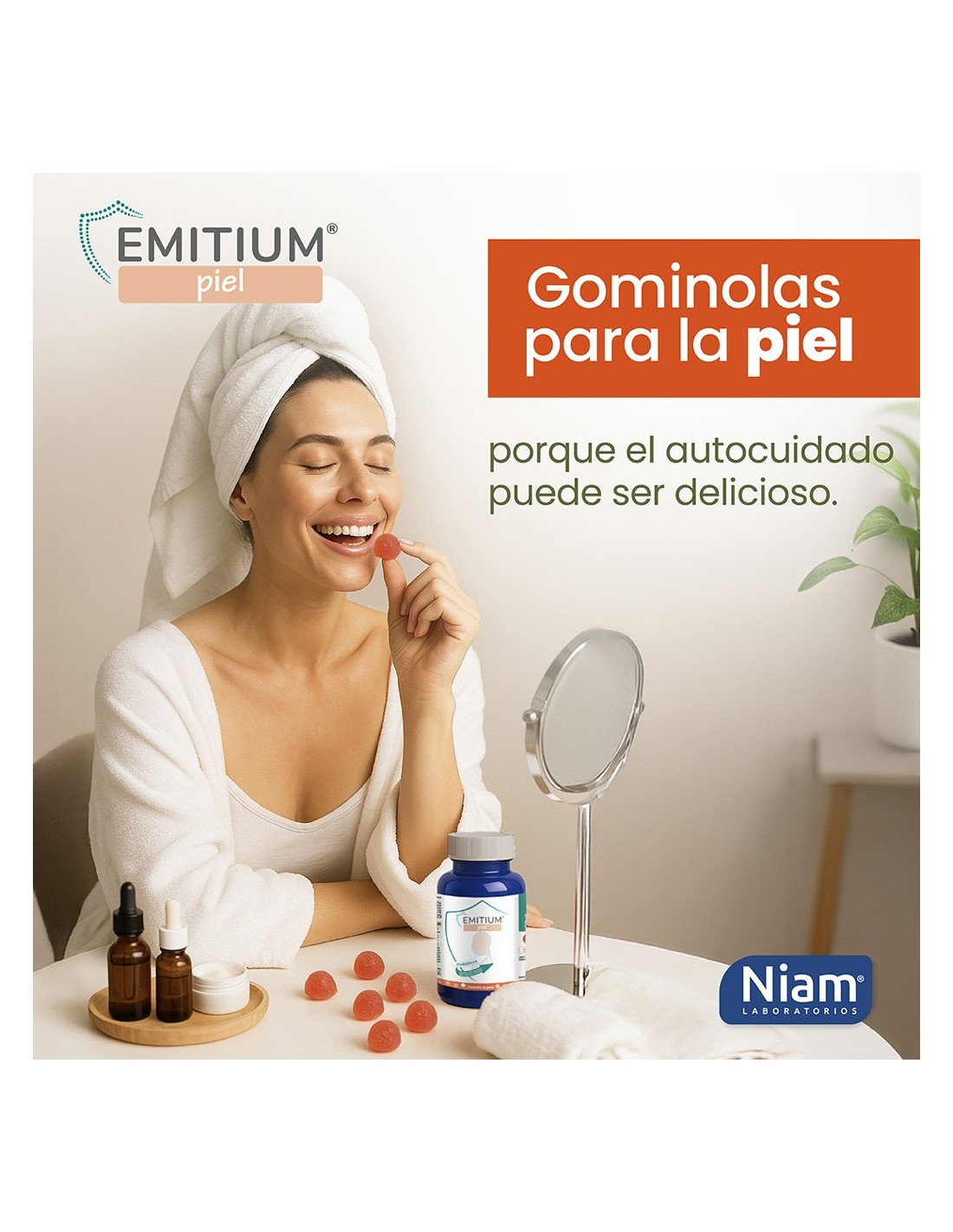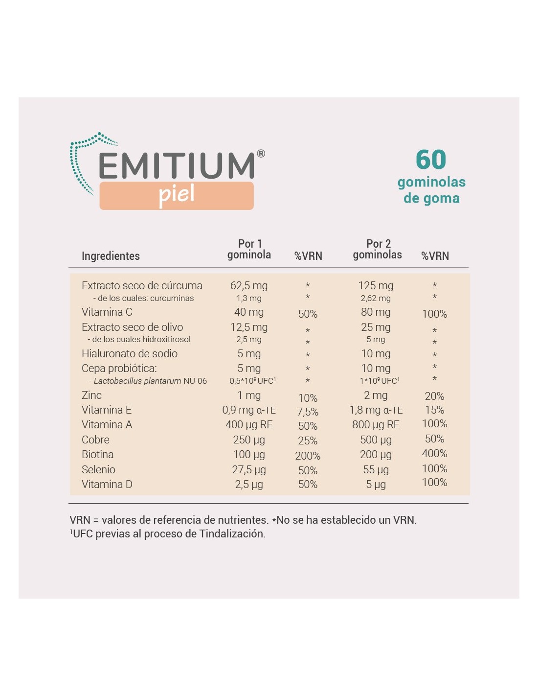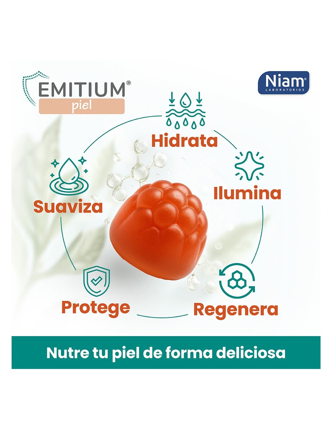 EMITIUM® Piel es un complemento alimenticio en formato gominola con sabor a naranja formulado específicamente para cuidar la piel desde el interior, ya que contiene ácido hialurónico y Vitaminas A, C, D, E, biotina, Cobre, Selenio y Zinc, con beneficios adicionales para la nutrición de la piel. También aporta extracto de olivo, rico en polifenoles como el hidroxitirosol, de propiedades antioxidantes.