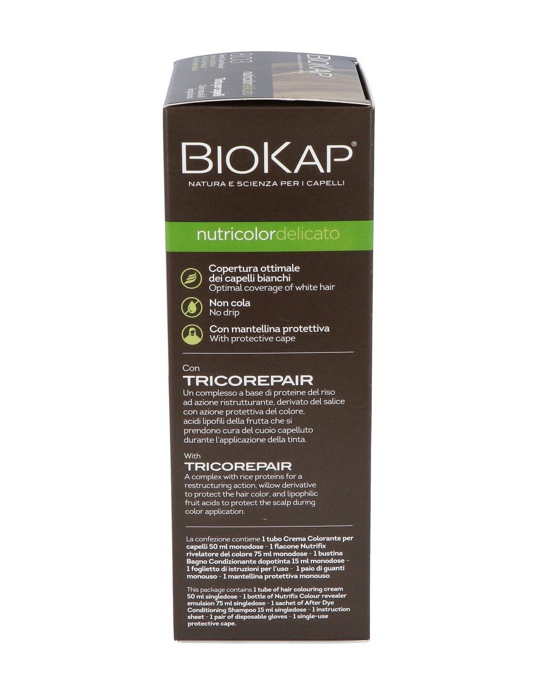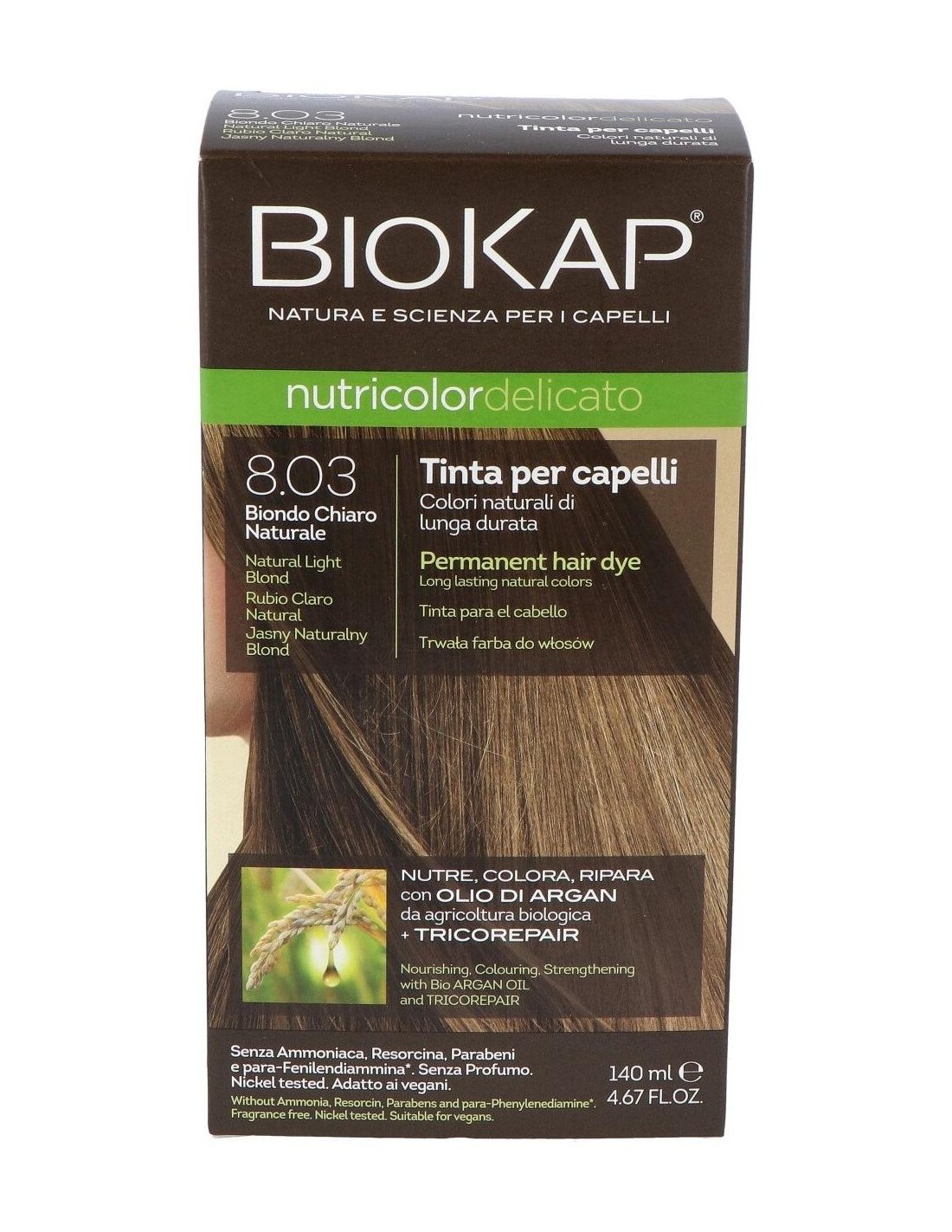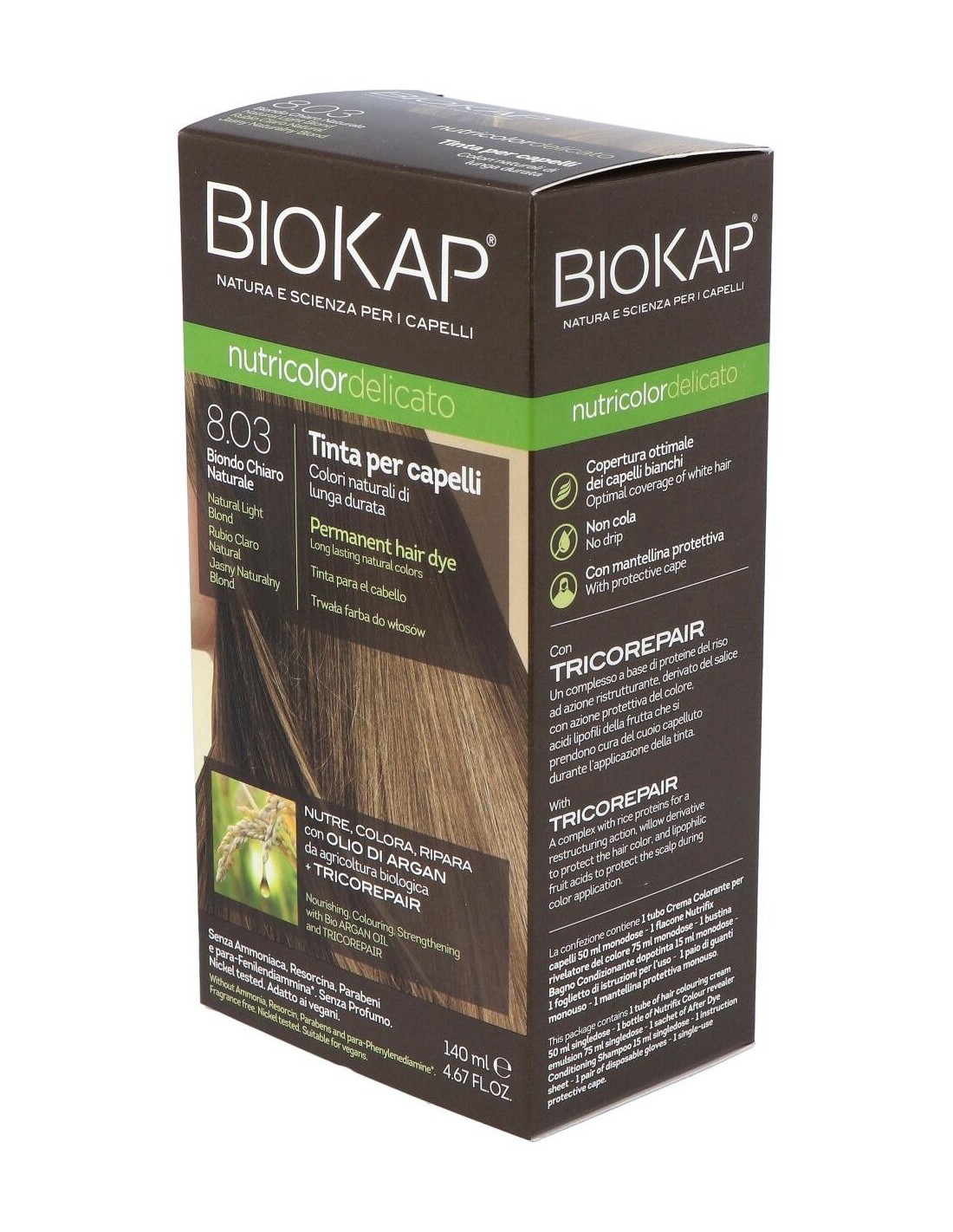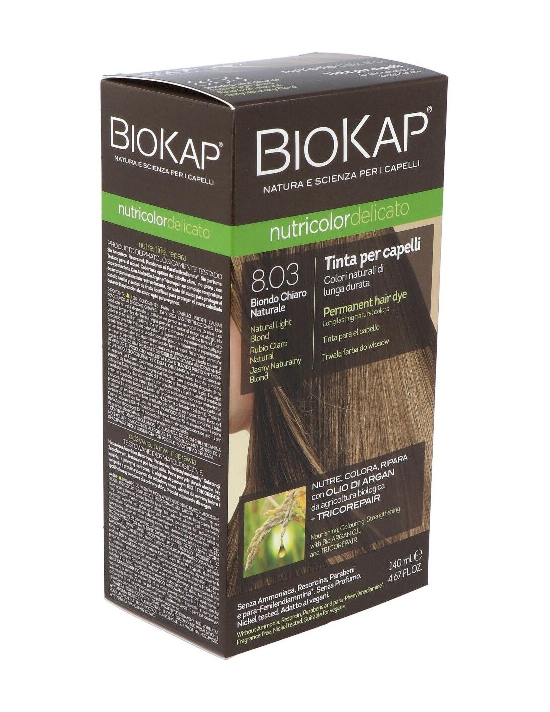 El Delicato 8.03 Rubio Claro Natural 140 ml de Biokap es un tinte capilar para quienes buscan un color rubio claro natural, formulado para ofrecer una cobertura uniforme y un acabado suave.