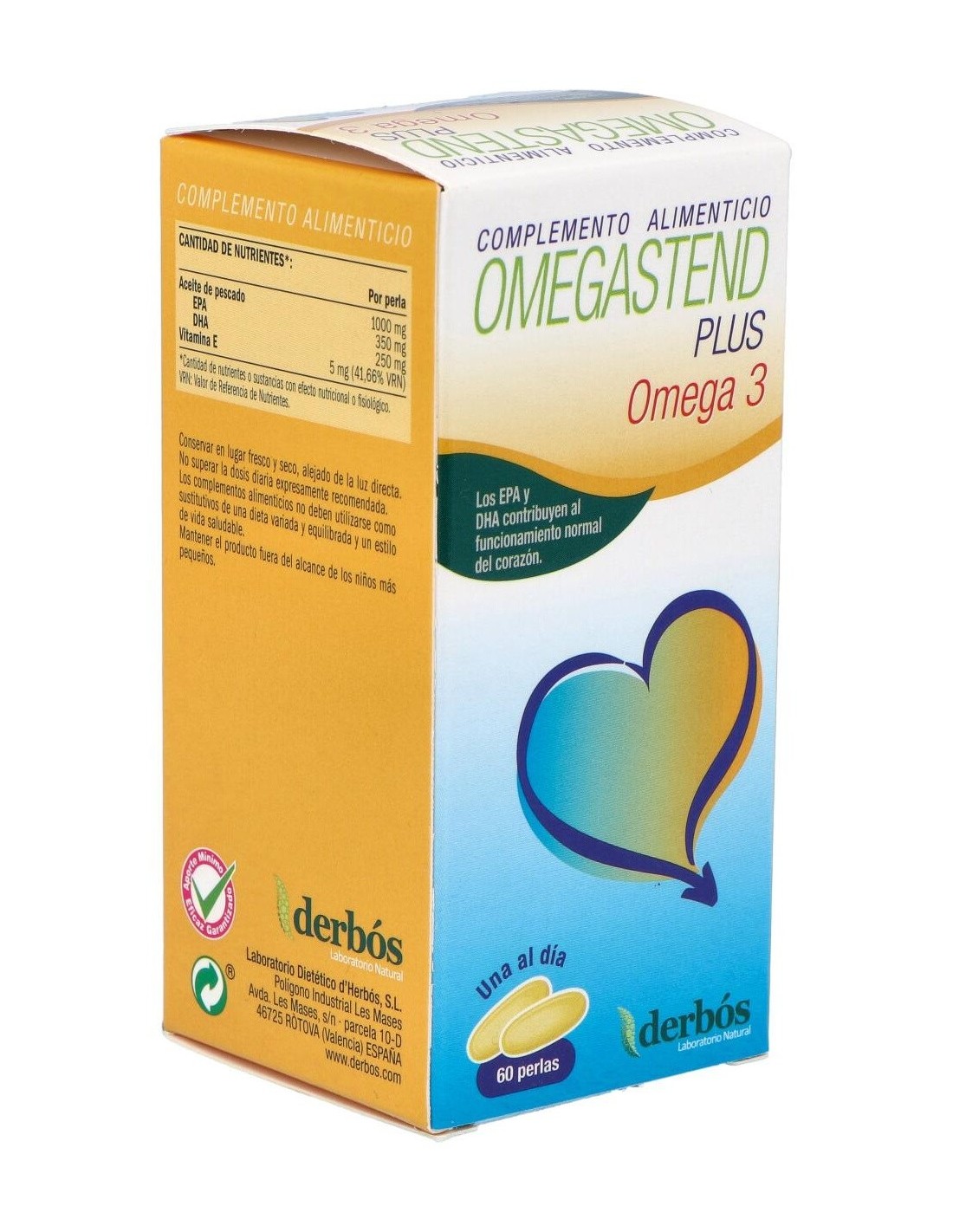 El Omegastend Plus 60Perlas de Derbos es un suplemento nutricional para adultos que contribuye al bienestar general mediante una fórmula equilibrada de ácidos grasos esenciales y nutrientes clave.