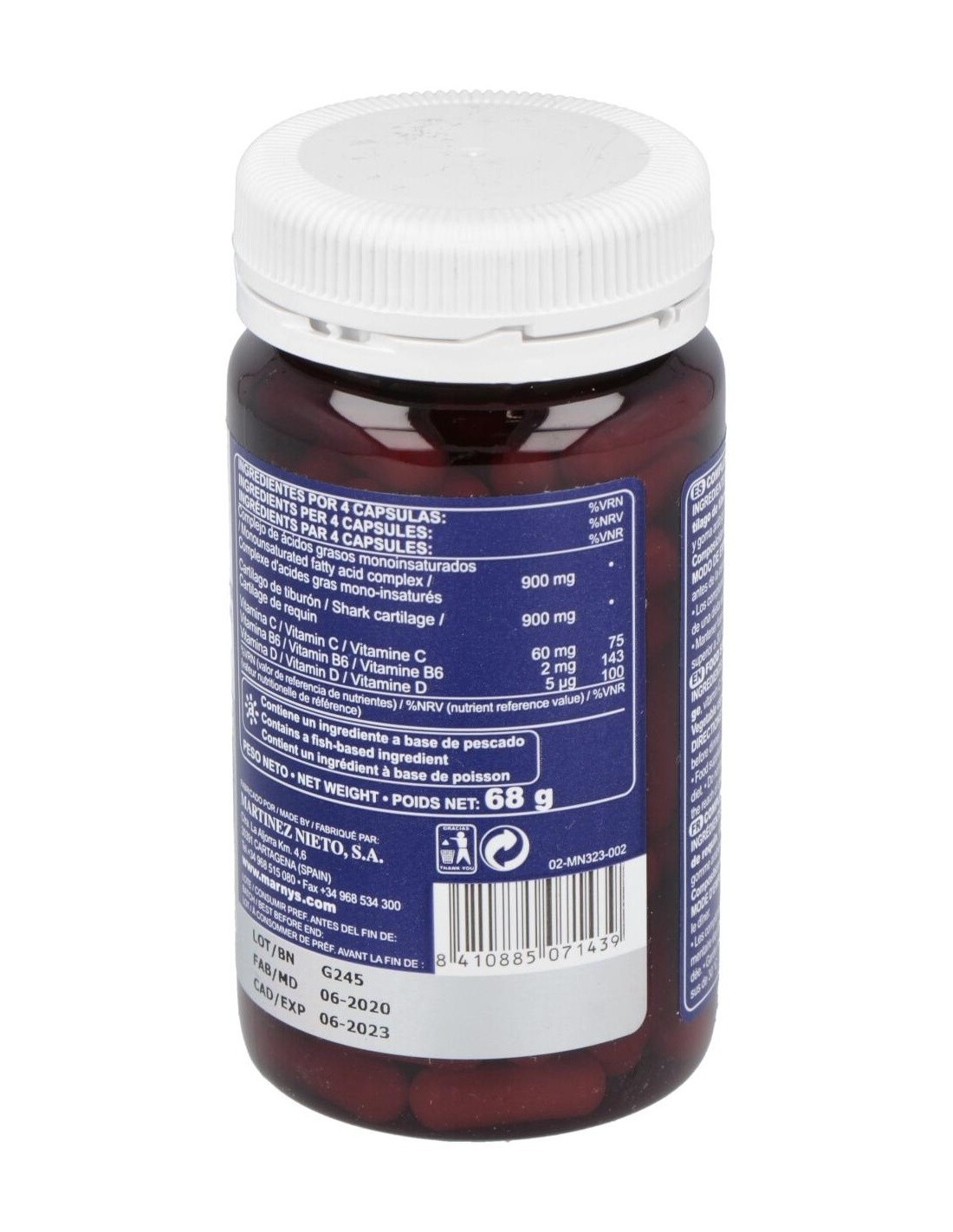 Contiene Cartílago de Tiburón, un complejo de Ácidos Grasos Monoinsaturados y Vitaminas C, B6 y D. Contribuye al bienestar de las articulaciones.