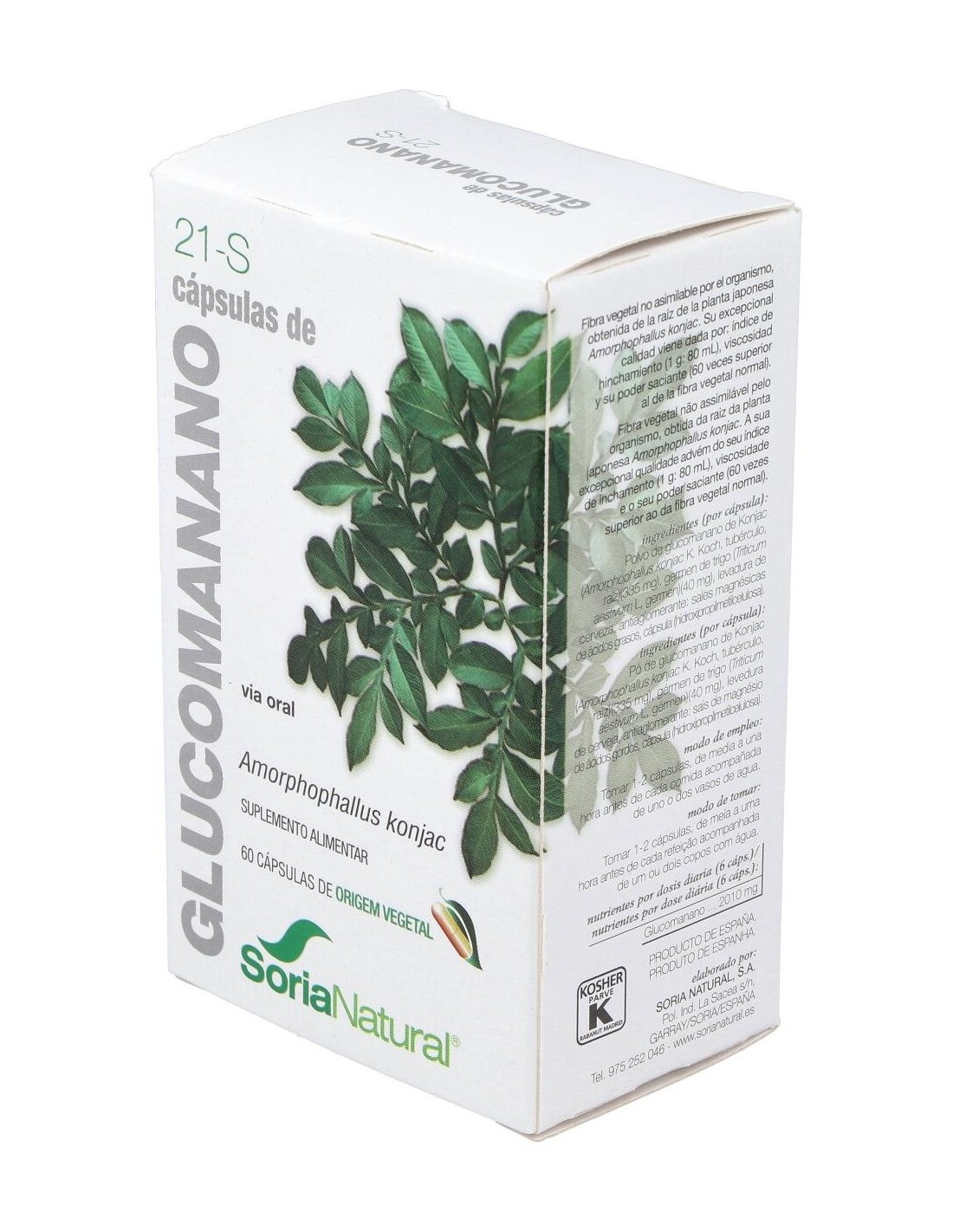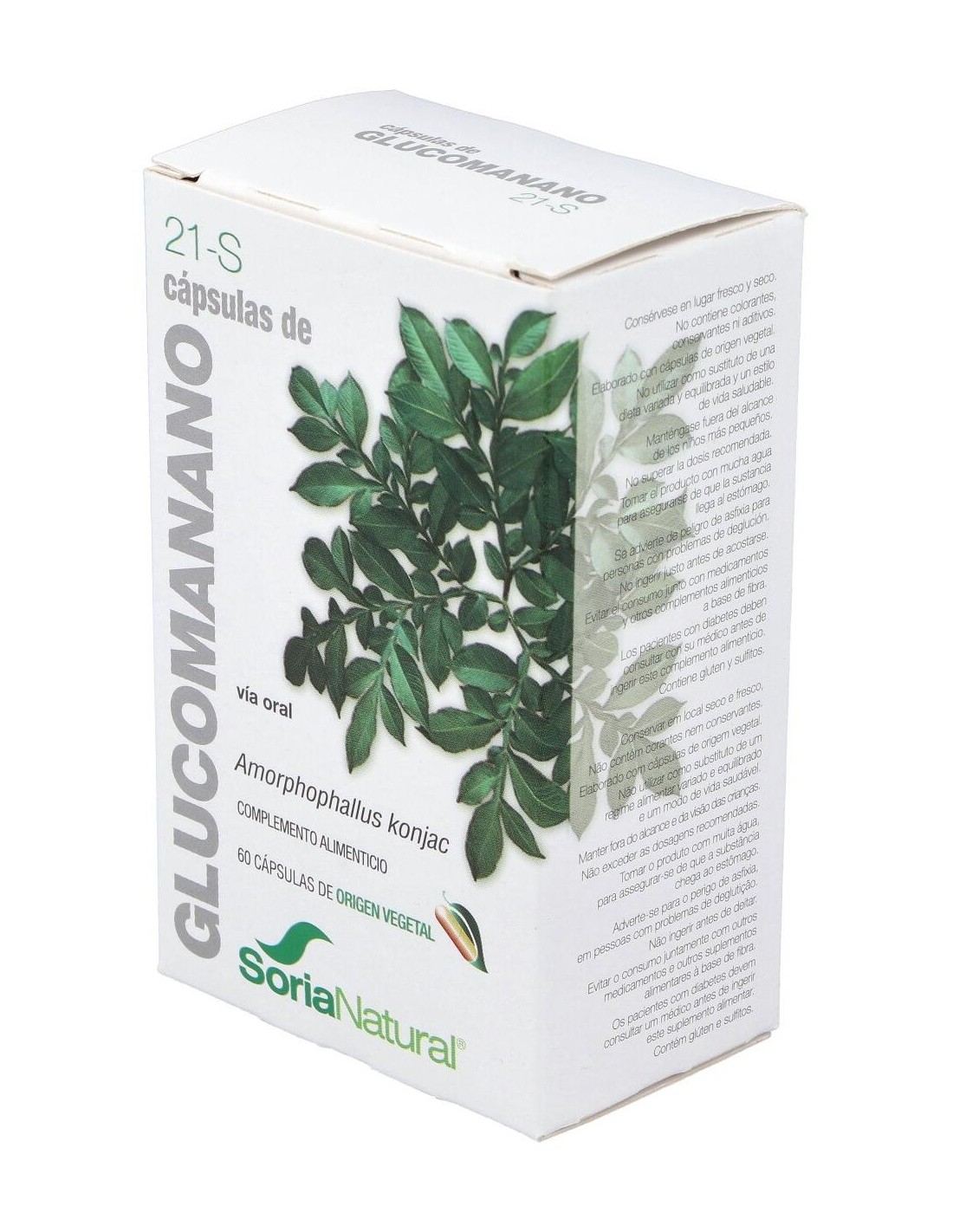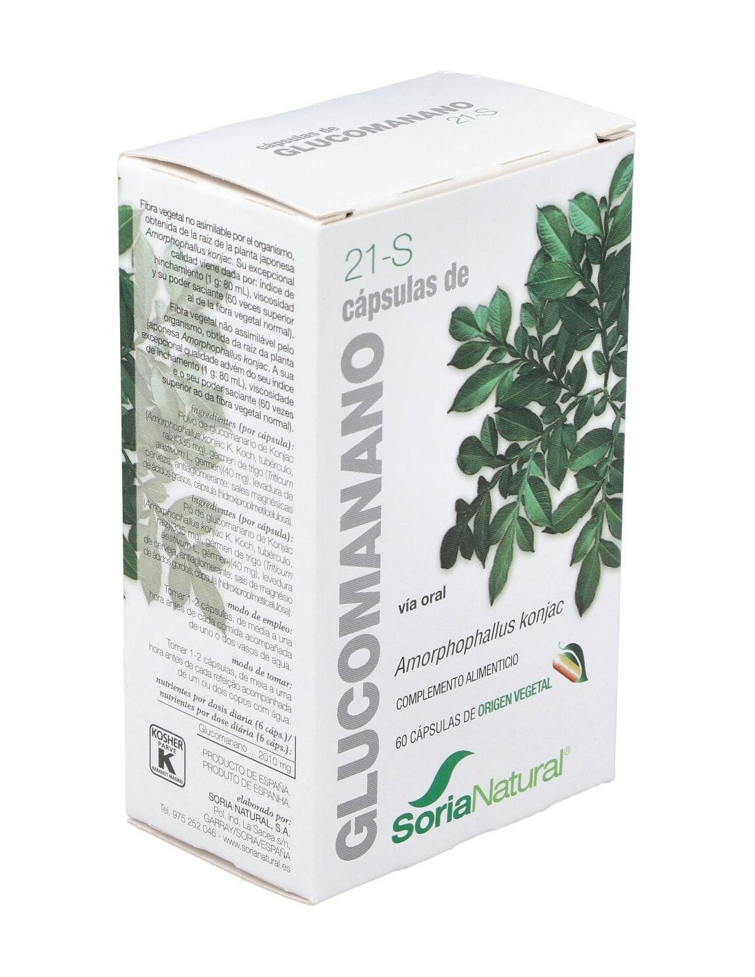 21-S Glucomanano de Soria Natural es un complemento alimenticio con fibra vegetal no asimilable por el organismo, obtenida de la raíz de la planta jap
