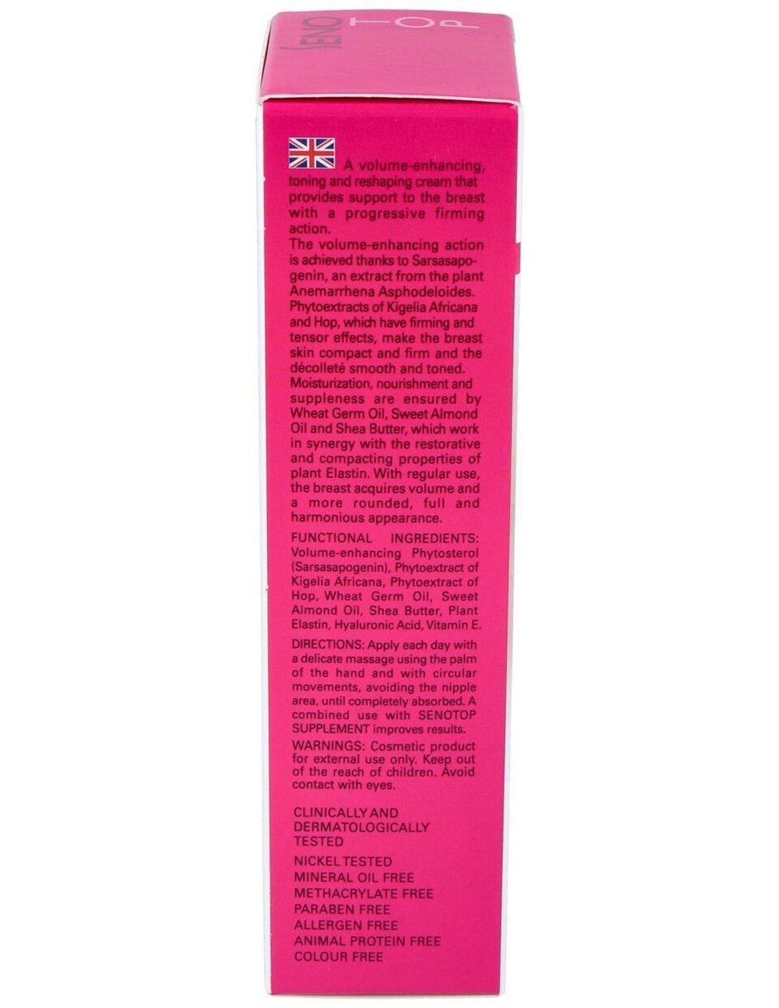 Tiene una textura suave y ligera que penetra fácilmente dando una inmediata sensación de hidratación intensa. Con el uso regular y constante sus componentes aportan al seno propiedades de volumen y un aspecto más redondo, pleno y armonioso. Dermatológicamente y clínicamente probado. Níquel probado. Sin: Petrolato, Metacrilato, Parabenos, Alergénos, Proteína animales ni Colorantes.