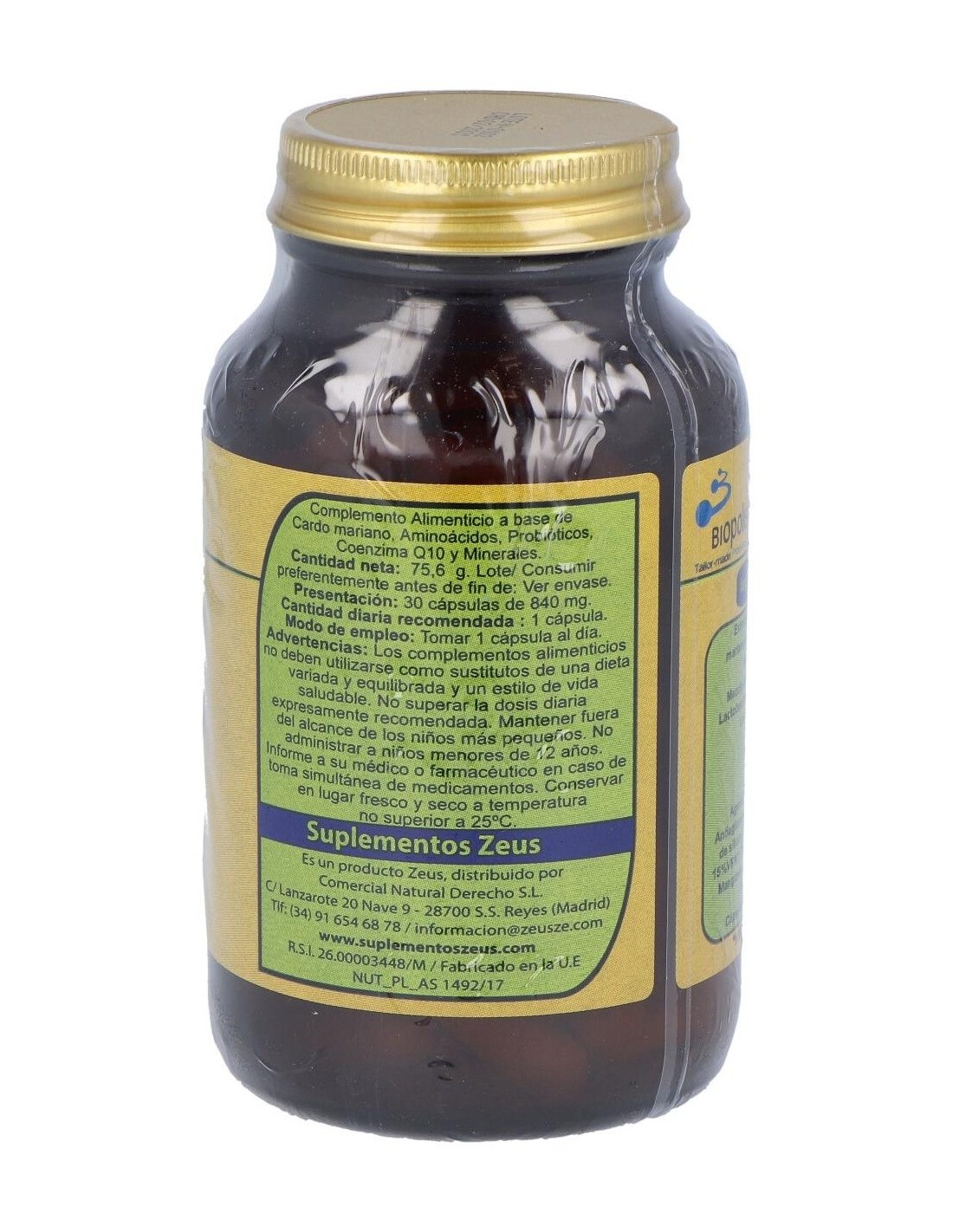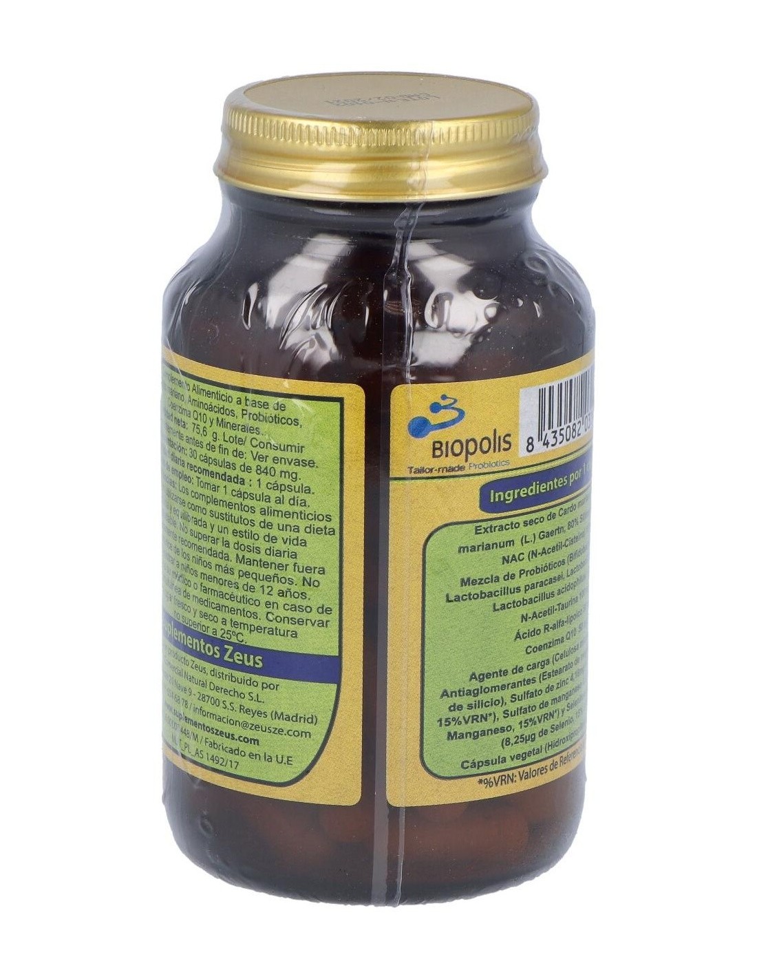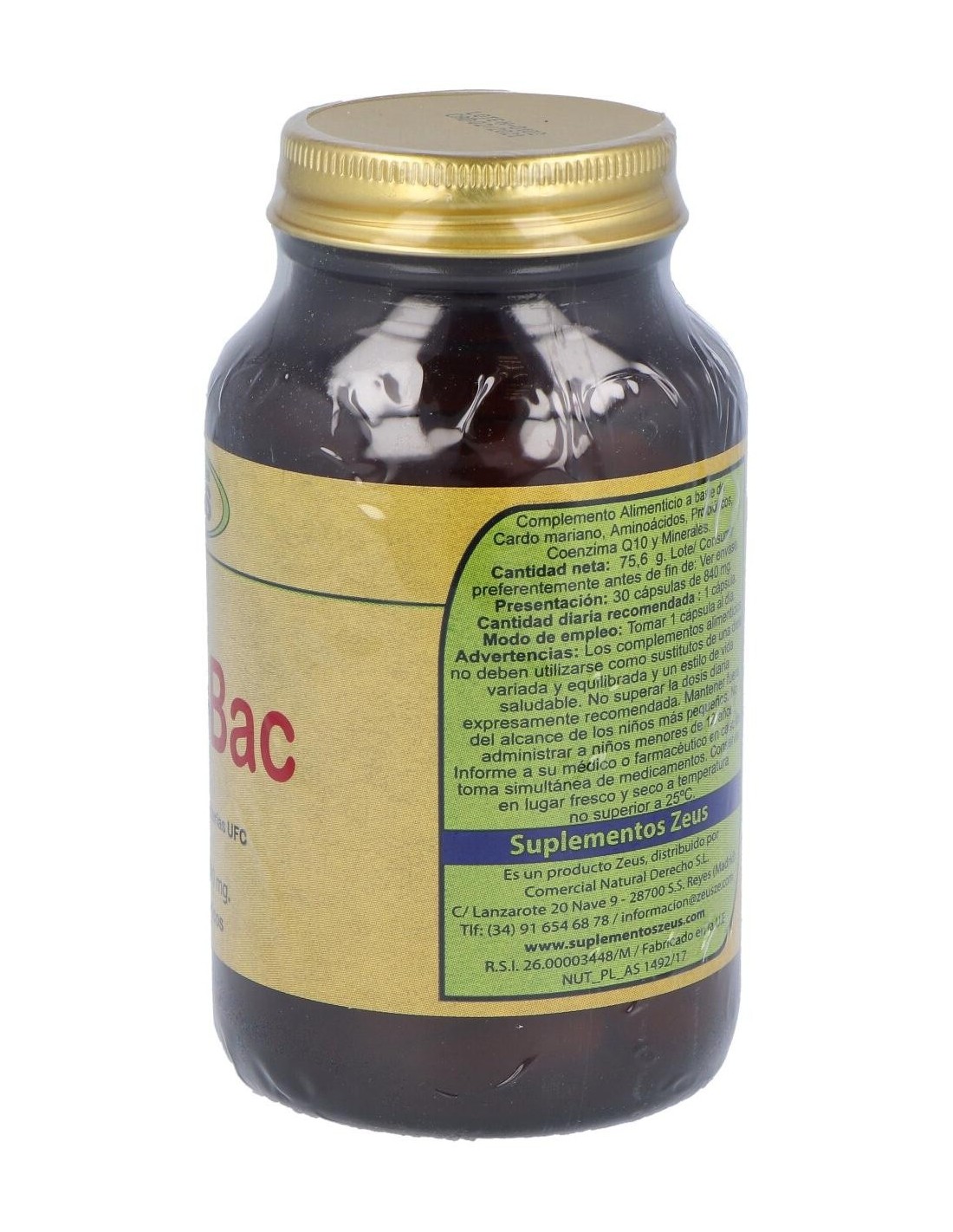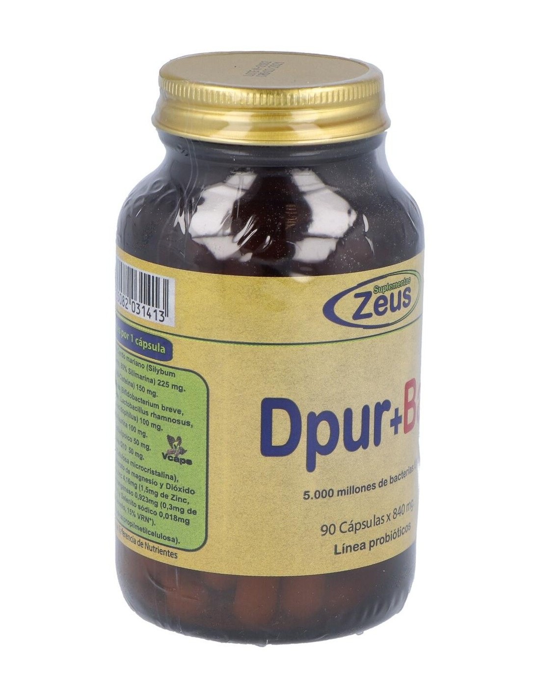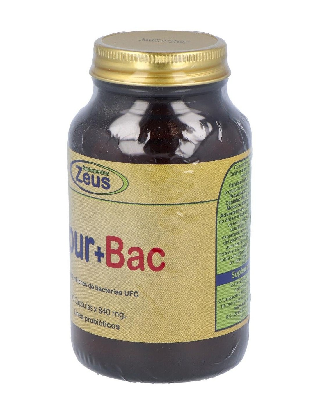 Complemento alimenticio Zeus. El envase posee 90 unidades en su interior. Aporta grandes cantidades de Lactobacillus Acidophilus, Lactobacillus paracasei y Bifidobacterium que benefician el correcto funcionamiento del microbiota intestinal. Estimula el tránsito intestinal para facilitar la expulsión de toxinas por vías naturales. Contribuye a la regulación progresiva de los niveles de colesterol en la sangre. Contiene propiedades antioxidantes que actúan positivamente sobre el desempeño de distintas funciones orgánicas.