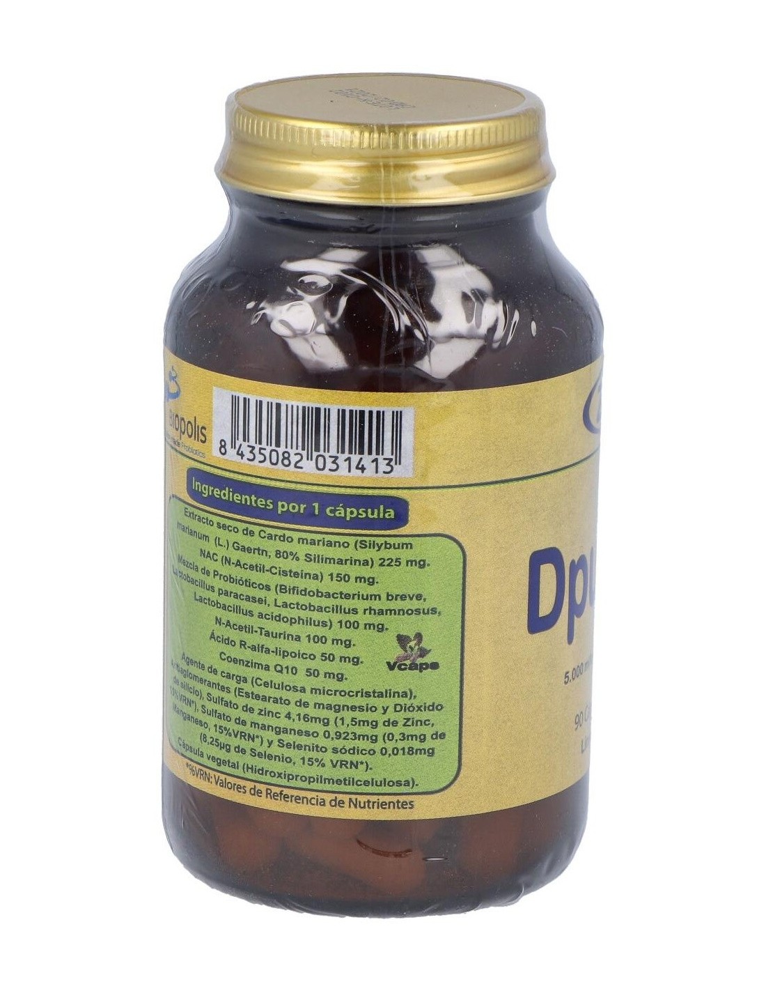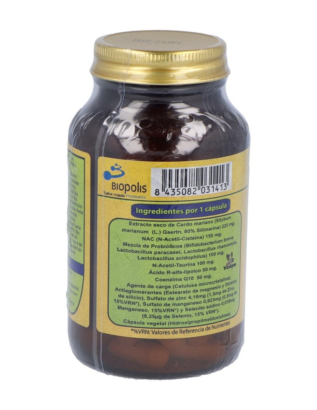 Extracto seco de Cardo Mariano (225 mg), N-Acetil Cisteína (150 mg), N-Acetil Taurina (100 mg), Ácido R-Alfa-Lipoico (50 mg), Coenzima Q10 Kaneka (50 mg), Sulfato de Zinc (4.16 mg), Sulfato de Manganeso (0.923 mg), Selenito Sódico (0.018 mg), Hidroxipropilmetilcelulosa, Lactobacillus Rhamnosus, Celulosa microcristalina, Lactobacillus Acidophilus, Lactobacillus paracasei, Bifidobacterium breve, Antiaglomerantes.