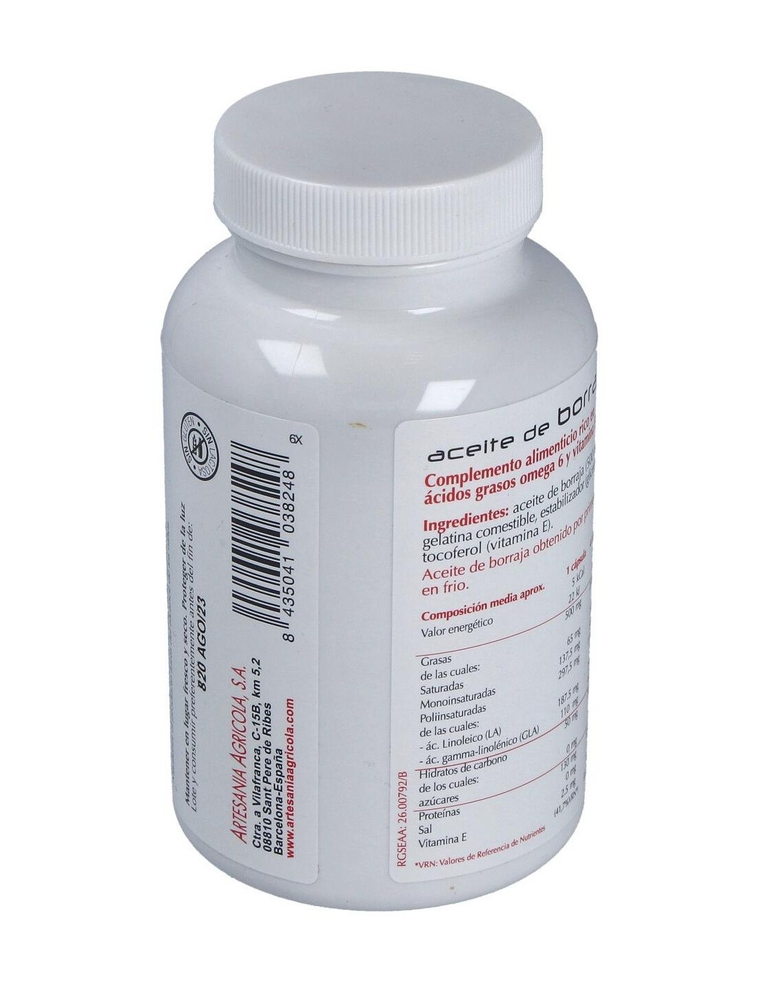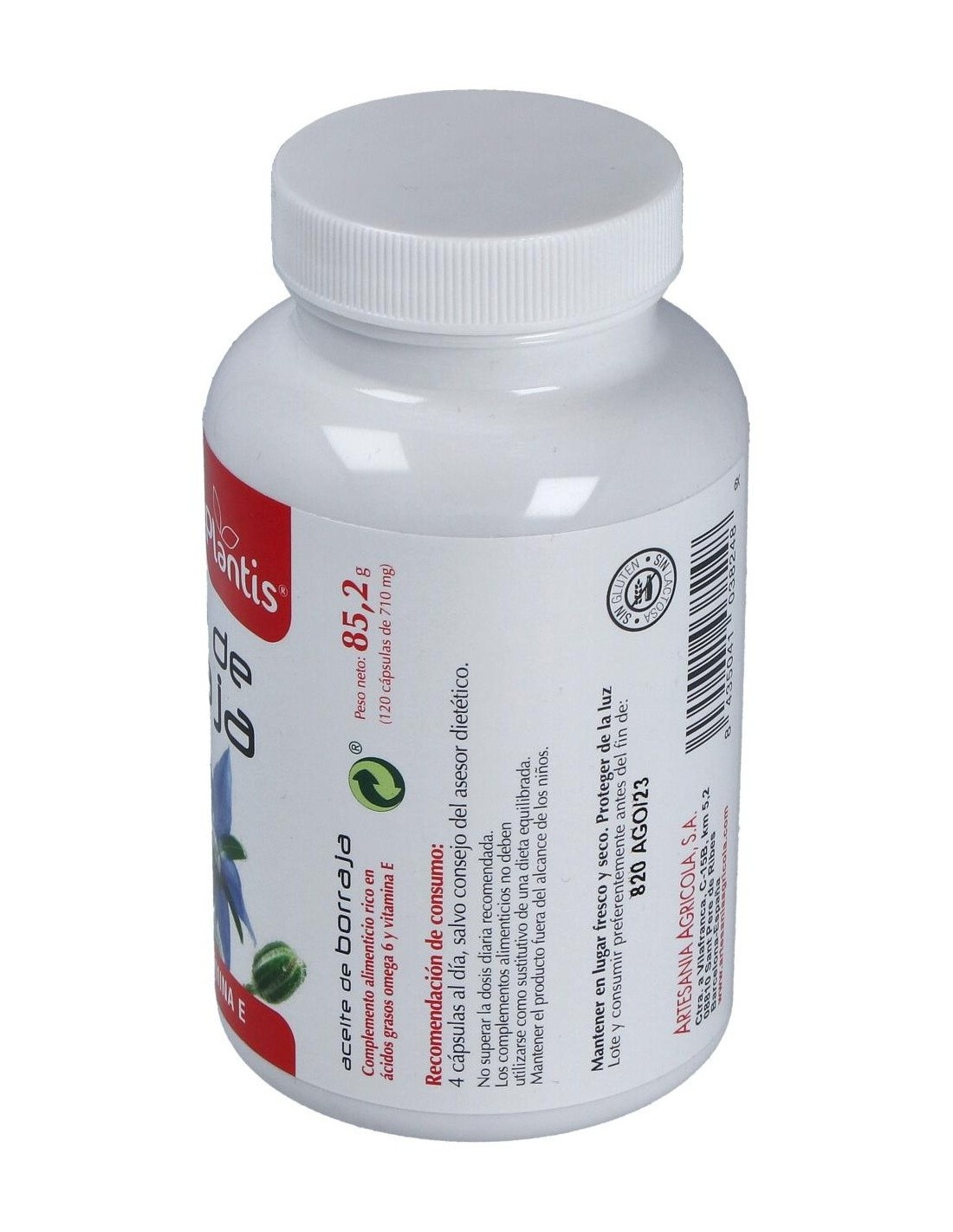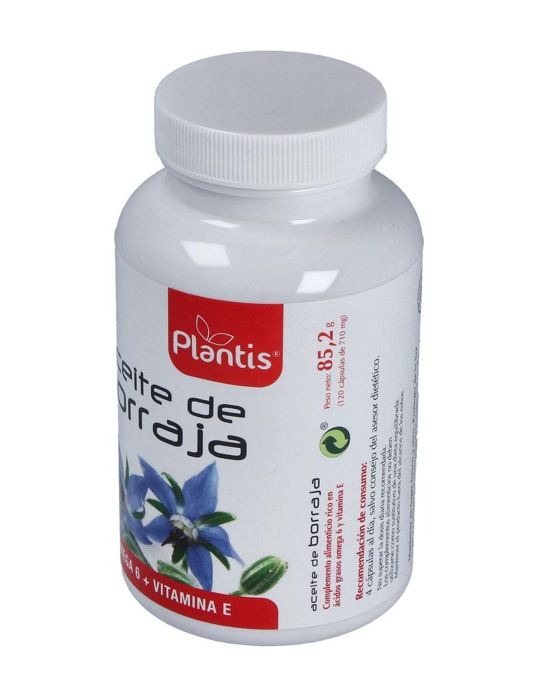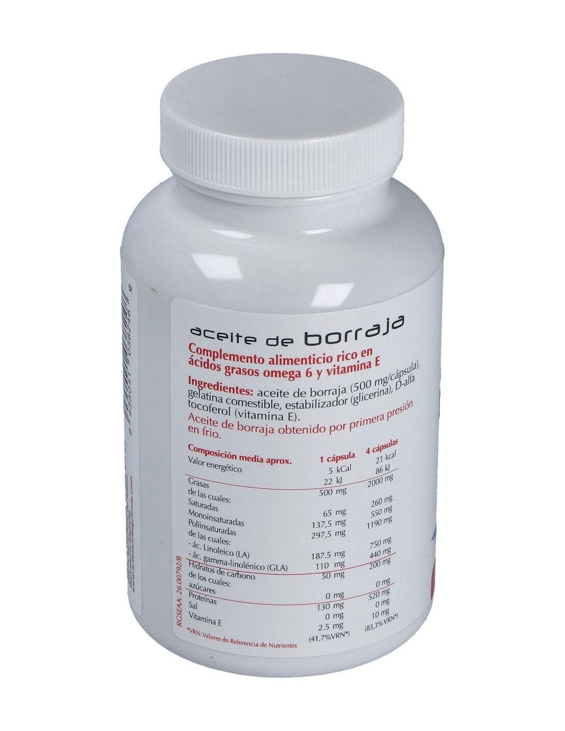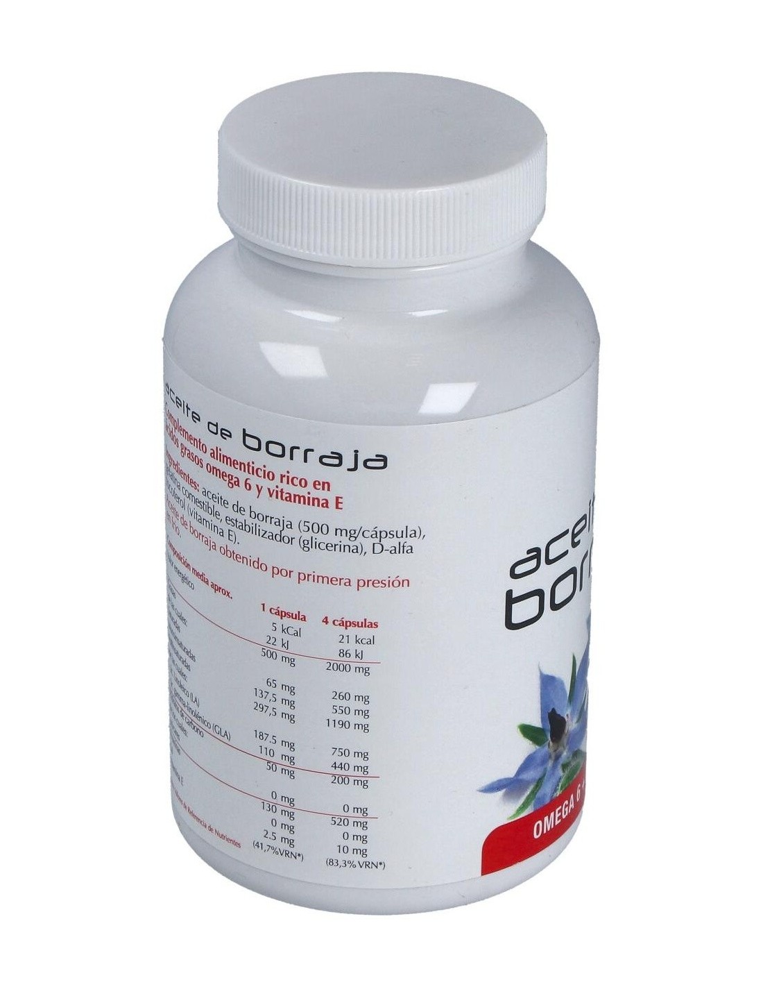 Ingredientes:Aceite de borraja (500 mg/cápsula), gelatina comestible, estabilizador (glicerina), vitamina E. Aceite de borraja obtenido por primera presión en frio.Modo de empleo:Tomar 4 cápsulas al día.Presentación:Envase de 120 cápsulas.