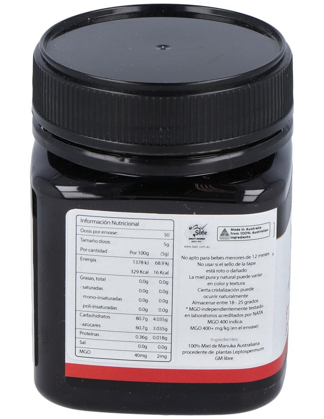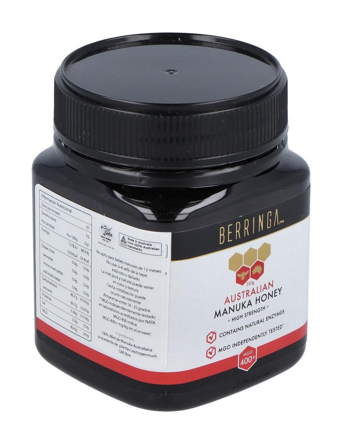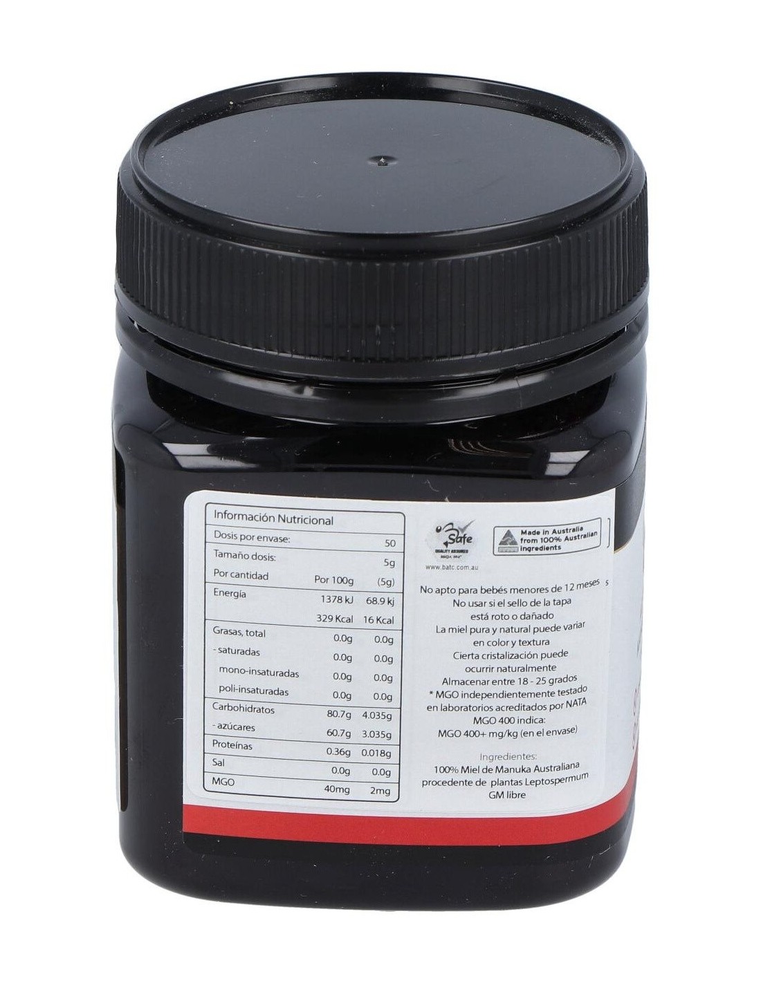 - Contiene 400 MGO (metilglioxal), un compuesto que contribuye a la singularidad de esta miel y su perfil distintivo.