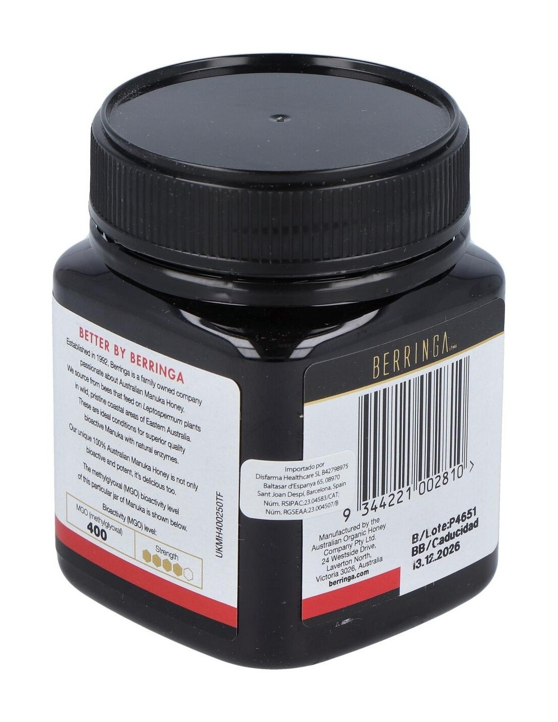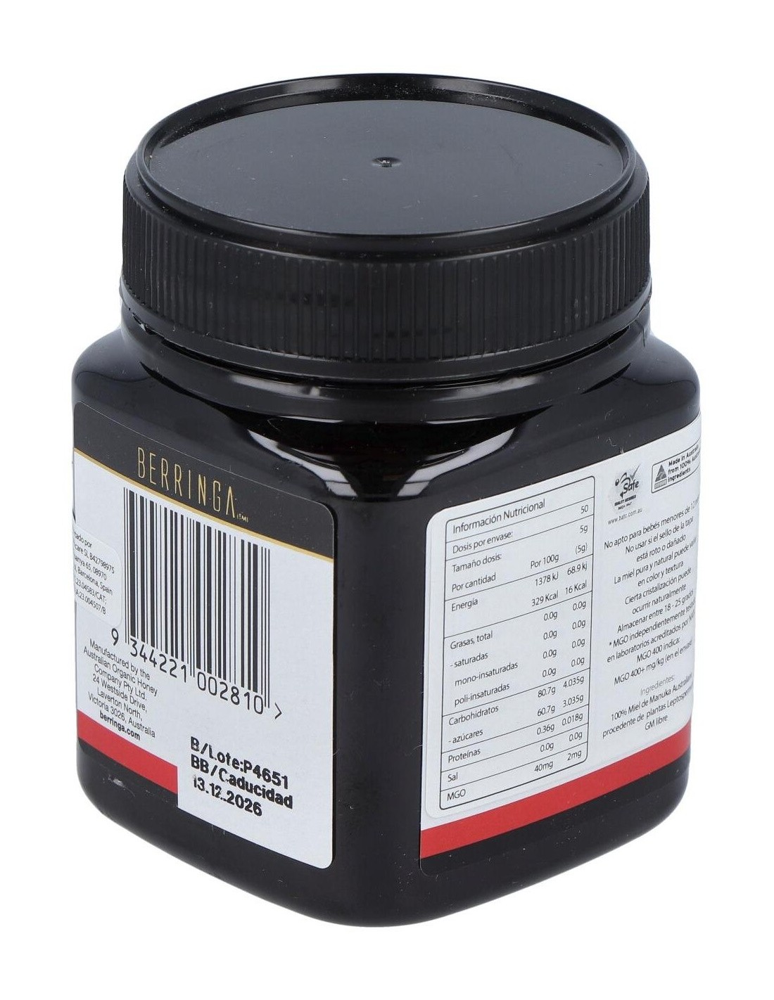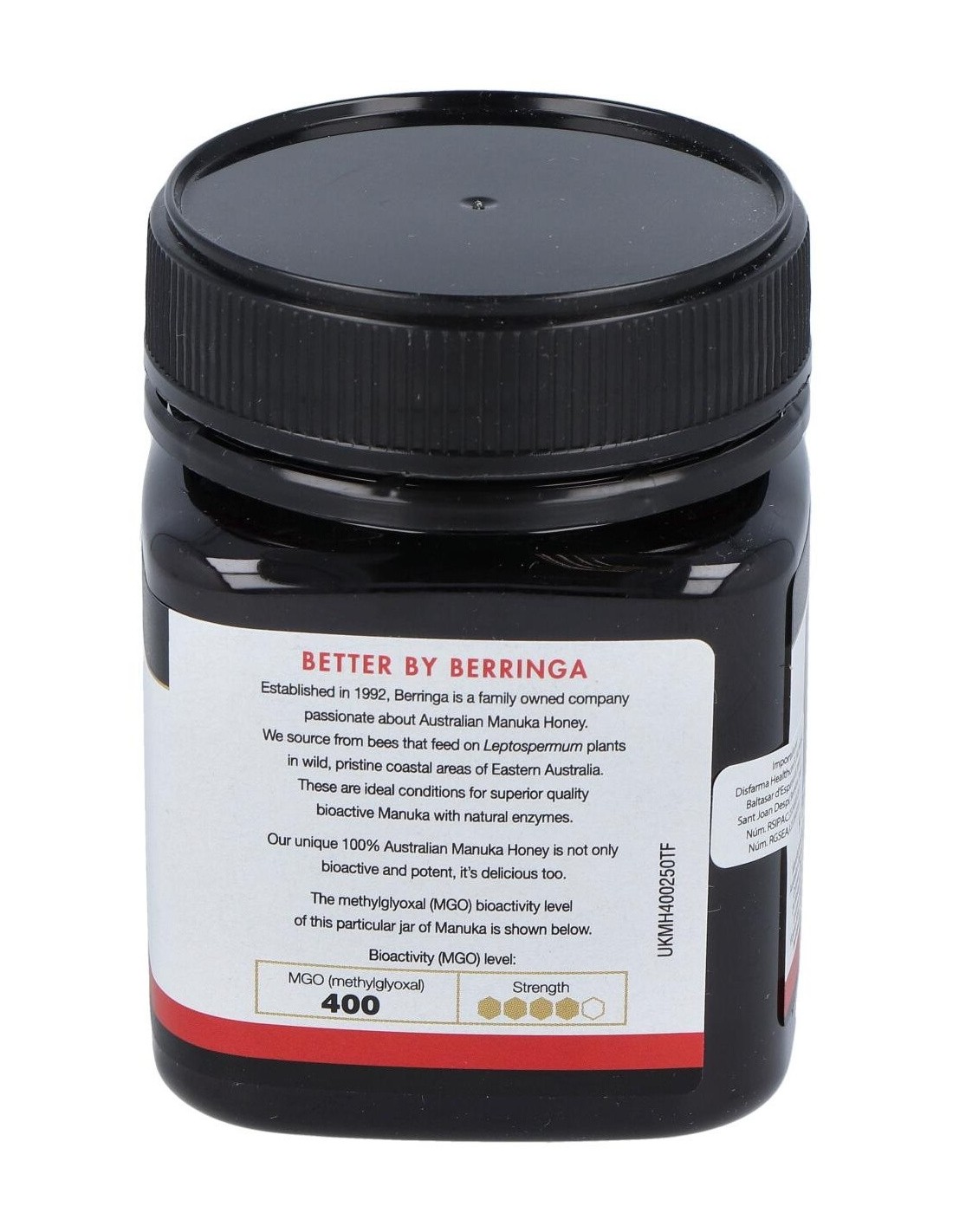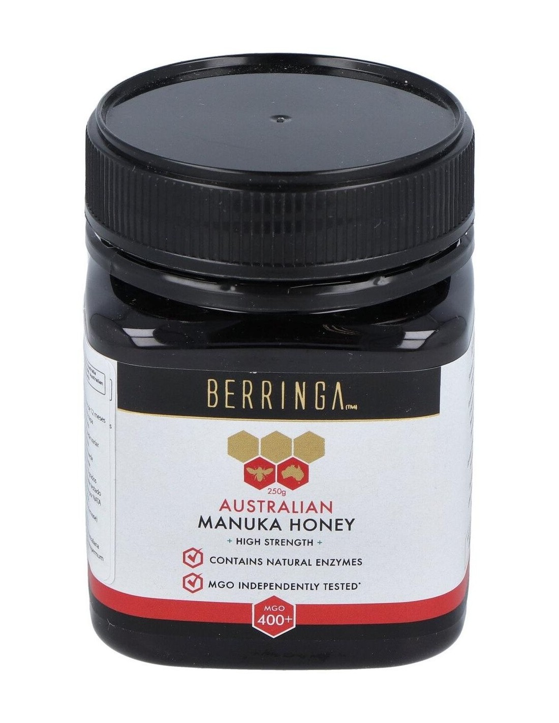 - Contiene 400 MGO (metilglioxal), un compuesto que contribuye a la singularidad de esta miel y su perfil distintivo.