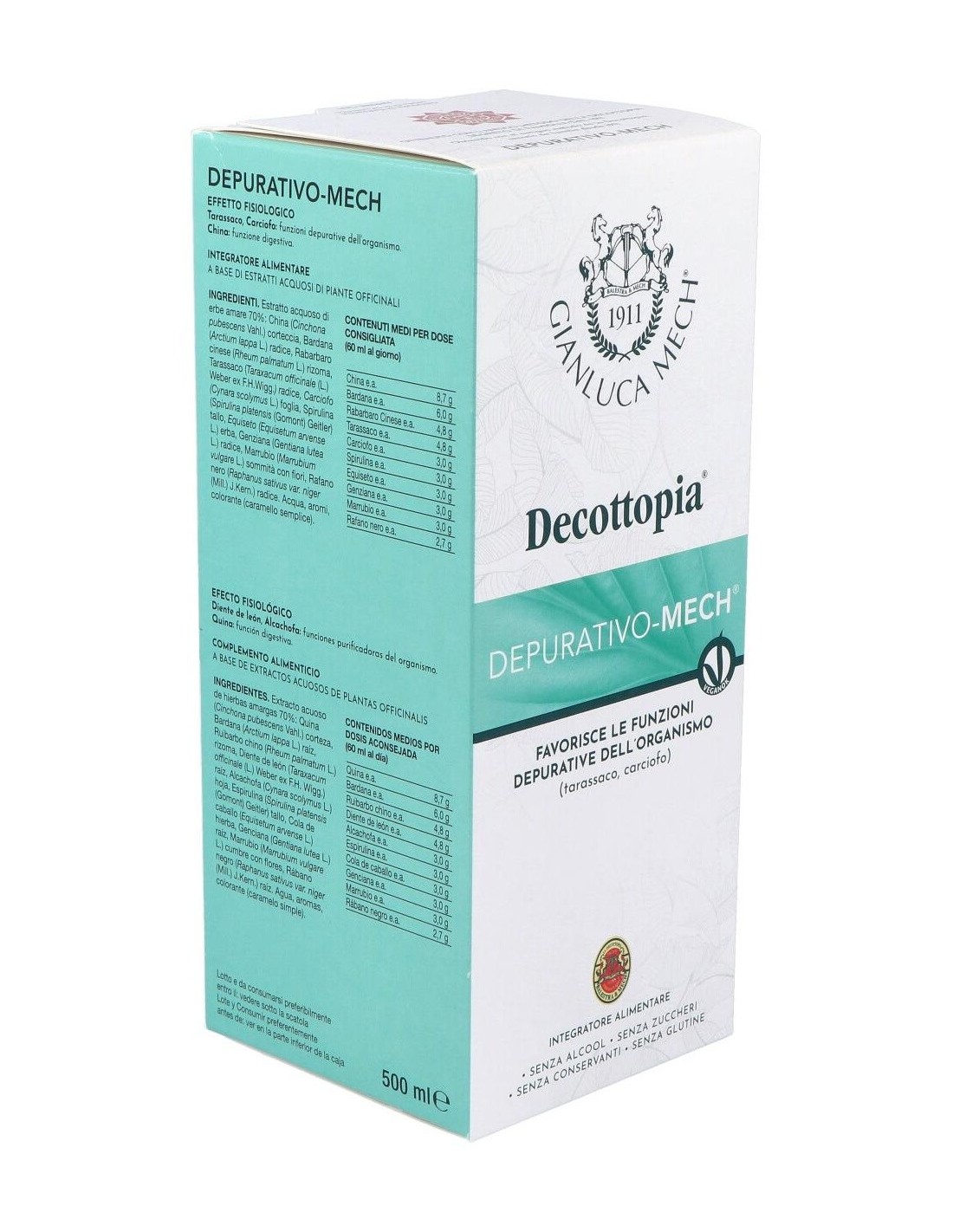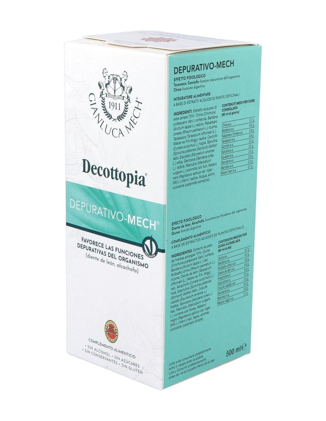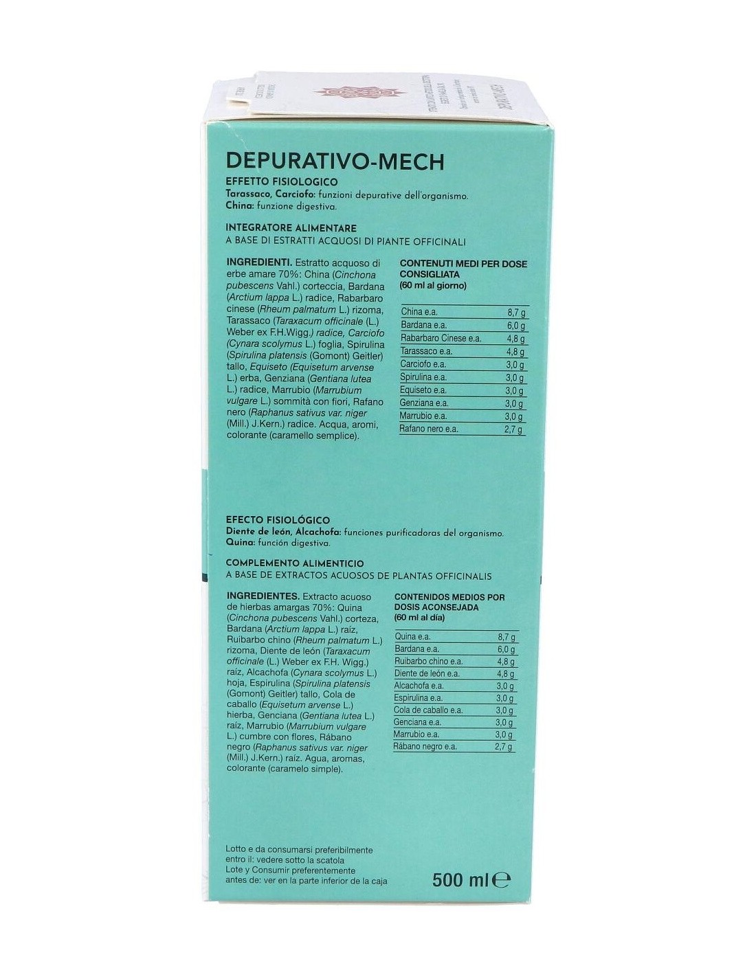 Ingredientes:Extracto acuoso de hierbas amargas 70%: Quina (Cinchona succirubra Pav.) corteza, Bardana (Arctium lappa L.) raíz, Ruibarbo (Rheum palmatum var. tagunticum Maxim.) rizoma, Diente de león (Taraxacum officinale (D.C.) Web.) raíz, Alcachofa (Cynara scolymus L.) hoja, Espirulina (Spirulina platensis) tallo, Cola de caballo (Equisetum arvense L.) hierba, Genciana (Gentiana lutea L.) raíz, Marrubio (Marrubium vulgare L.) hierba, Rábano negro (Raphanus sativus L. var. niger Miller) raíz. Agua, aromas, colorante (caramelo natural).Modo de empleo:Se recomienda ingerir de 30 a 60 ml al día, diluidos en medio vaso de agua, por las mañanas en ayunas y después de las dos comidas principales. Presentación:Frasco de 500 ml.
