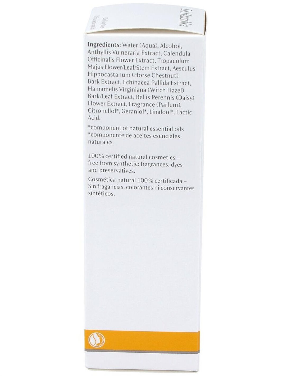 Aqua, Alcohol, Anthyllis Vulneraria Extract, Calendula Officinalis Flower Extract, Tropaeolum Majus Flower/Leaf/Stem Extract, Aesculus Hippocastanum Bark Extract, Echinacea Pallida Extract, Hamamelis Virginiana Bark/Leaf Extract, Bellis Perennis Flower Extract, Parfum*, Citronellol*, Geraniol*, Linalool*, Lactic Acid.