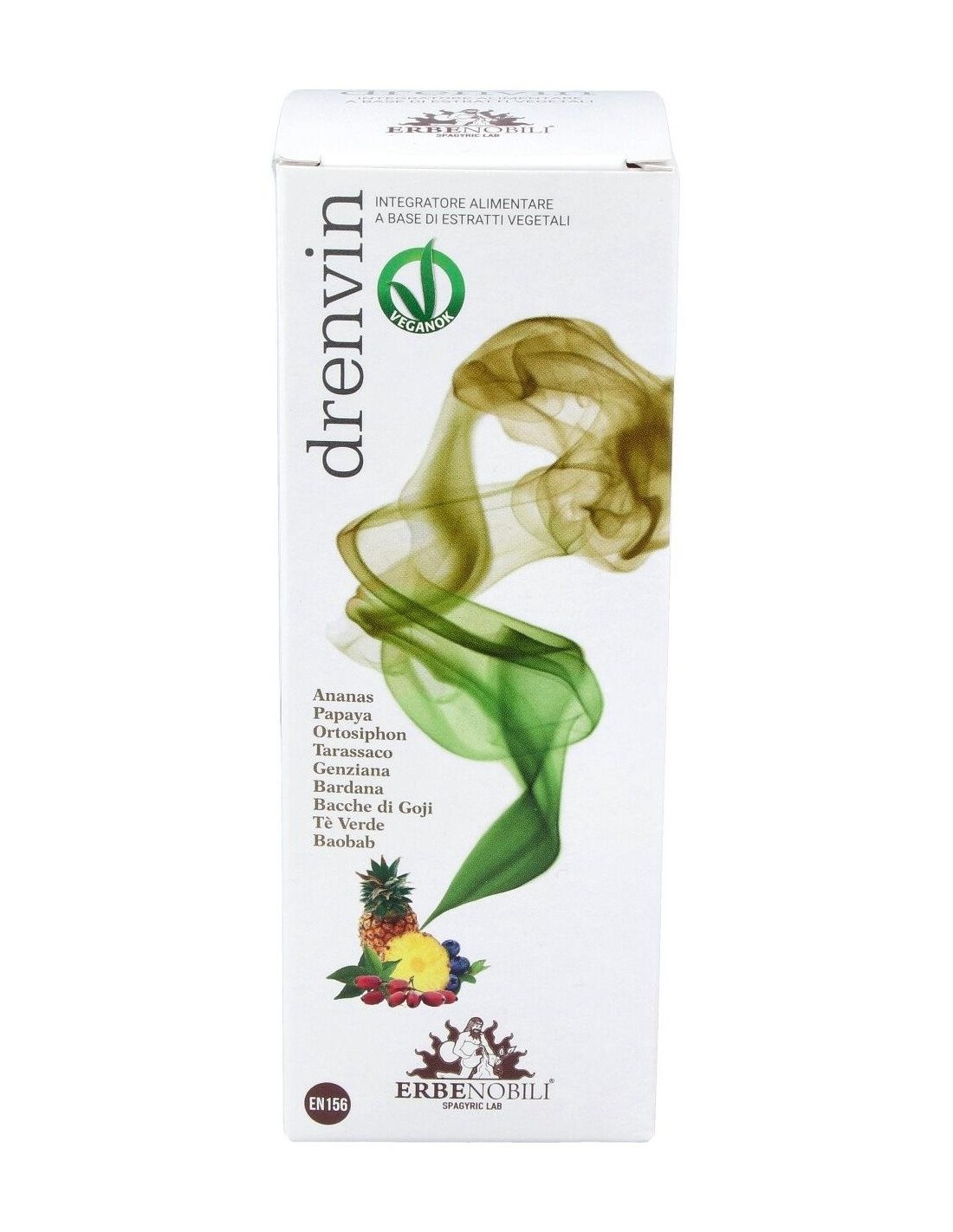 Agua: estabilizador: glicerina vegetal: Piña (Ananas comosus (L.) Merr) tallo extracto seco tit. al 0,3% en bromelina, Papaya (Carica papaya L.) fruto fermentado extracto seco, Ortosiphon (Ortosifón stamineus Benth.) hojas extracto seco tit. al 0,1 sinensetina, Diente de león (Taraxacum officinale Weber) raíz extracto seco, Genciana (Gentiana lutea L.) raíz extracto seco, aroma piña, Bardana (Arctium lappa L.) raíz extracto seco tit. 2% en inulina, Bayas de Goji (Lycium barbarum L.) frutos extracto seco, Té verde (Camellia sinensis L. Kuntze) hojas extracto seco, Baobab (Adansonia digitata L.) fruto extracto seco, conservante: sorbato de potasio.