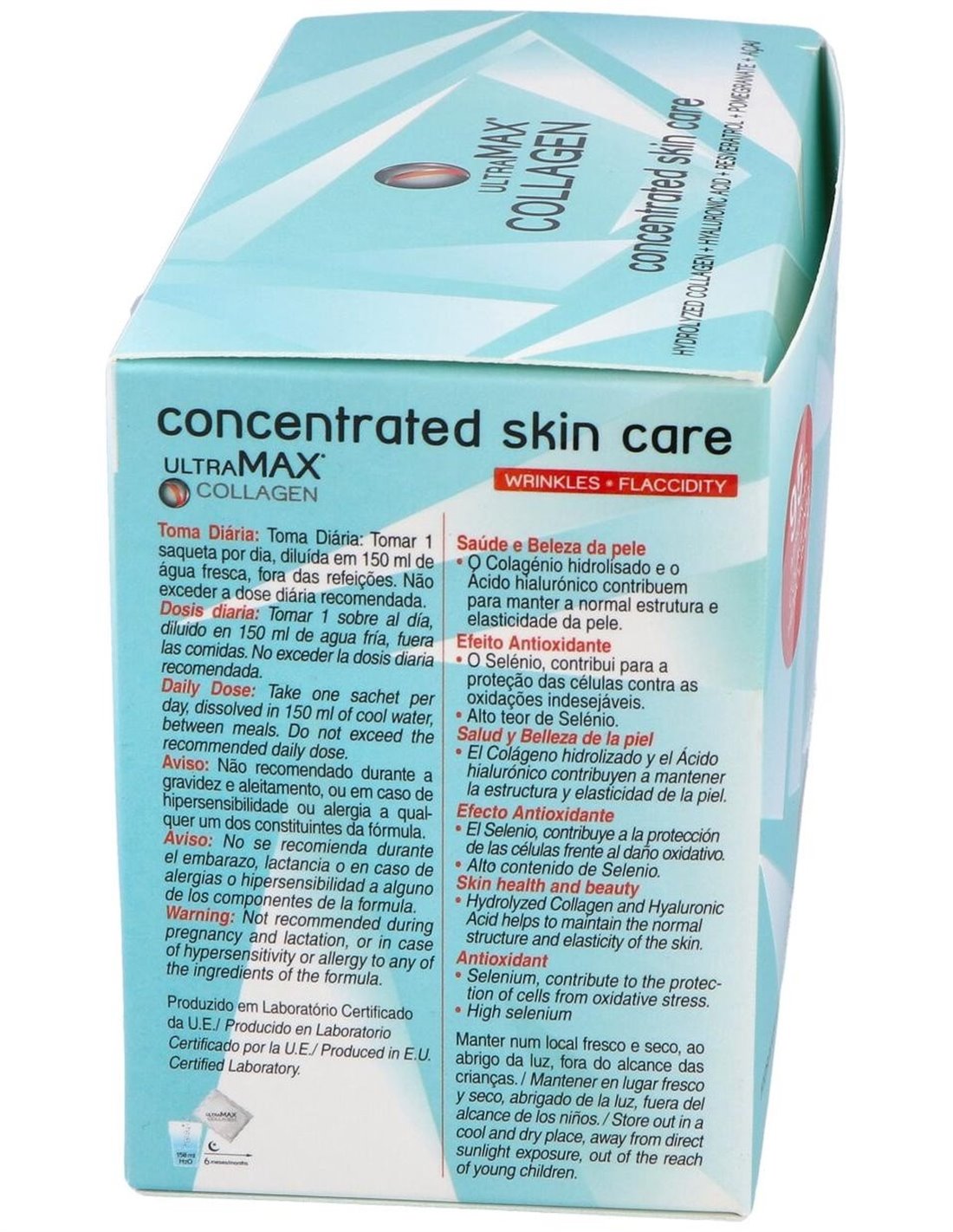 Colágeno hidrolizado (81%), Aroma de frutos rojos, Corrector de acidez (ácido cítrico monohidratado), Extracto seco de açaí (2,43%), Colorante (rojo remolacha), Agente de carga (maltodextrina), Extracto de granada (0,81%), Colorante (enocianidina), Exudado seco de bambu tabashir - 70% silicio orgánico (0,41%), Edulcorante (sucralosa), Hialuronato sódico (0,16%), Extracto seco de raíz de Poligonum cuspidatum - 25% resveratrol (0,16%), Extracto seco de semilla de uva (0,16%), Selenito sódico.
