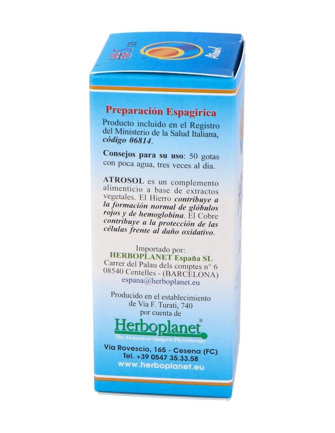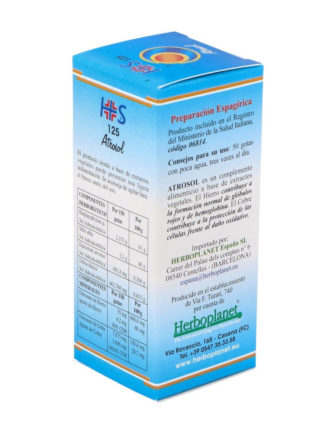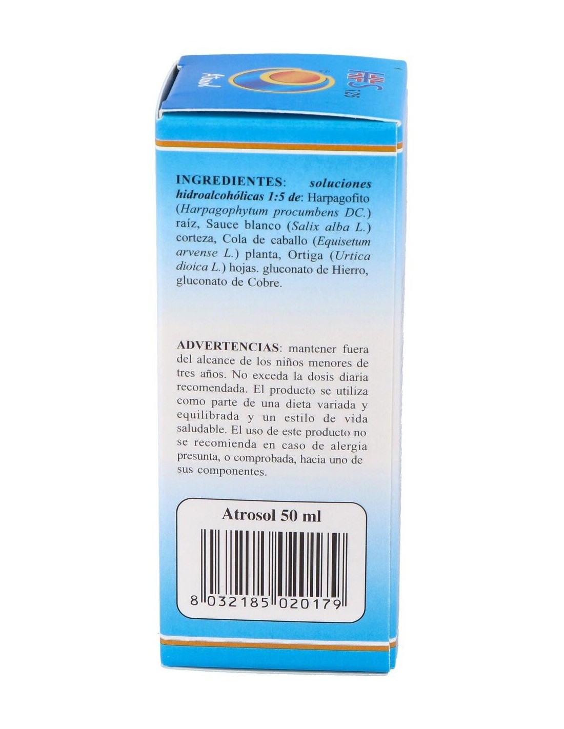 Atrosol es un complemento alimenticio a base de Hierro, Cobre y principios vegetales. El harpagofito y la ortiga contribuyen a la función normal de las articulaciones. El sauce blanco contribuye a la funcionalidad articular normal y es útil en la lucha contra los estados localizadas de tensión. El hierro contribuye a la formación normal de los glóbulos rojos y hemoglobina. El cobre contribuye a la protección de las células del estrés oxidativo.Atrosol de Herboplanet estas indicado para en casos de dolores reumáticos, artrosis, artritis, artrosis, mialgia, ciática, cefalea tensional (cefalea por contracción muscular).Ingredientes:Soluciones hidroalcohólicas 1:5 de: Harpagofito (Harpagophytum procumbens DC.) raíz, Sauce blanco (Salix alba L.) corteza, Cola de caballo (Equisetum arvense L.) planta, Ortiga (Urtica dioica L.) hojas. gluconato de Hierro, gluconato de Cobre.Alcohol 50% vol.Modo de empleo:Tomar 50 gotas con poca cantidad de agua, 3 veces al día.Presentación:Envase de 50 ml.