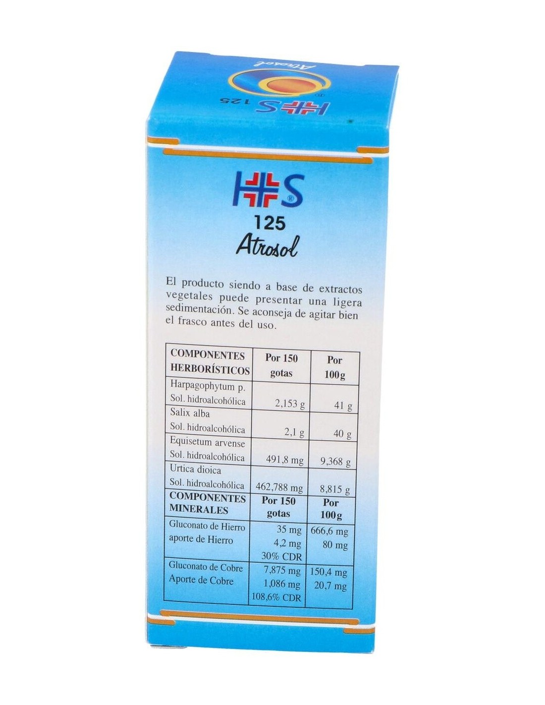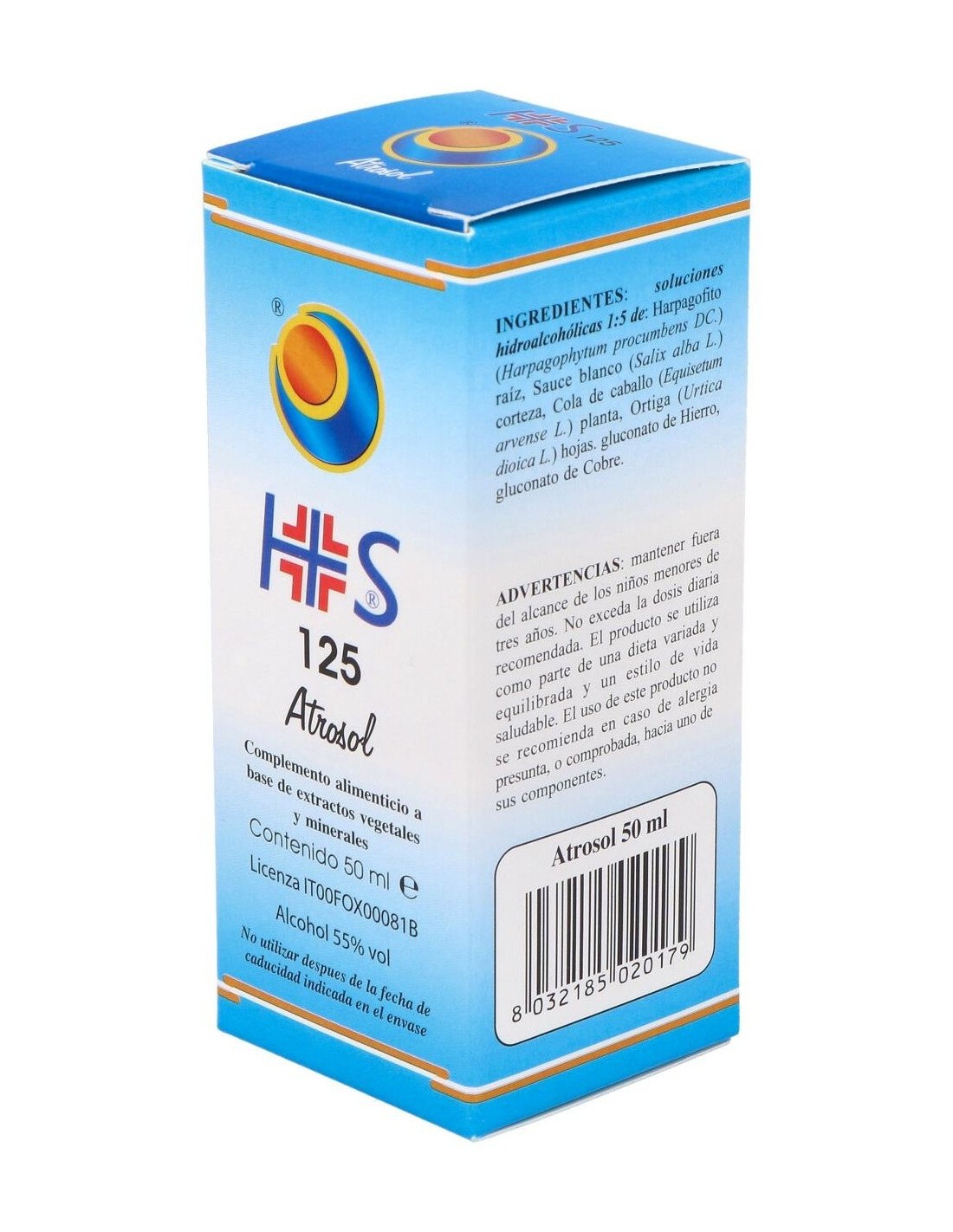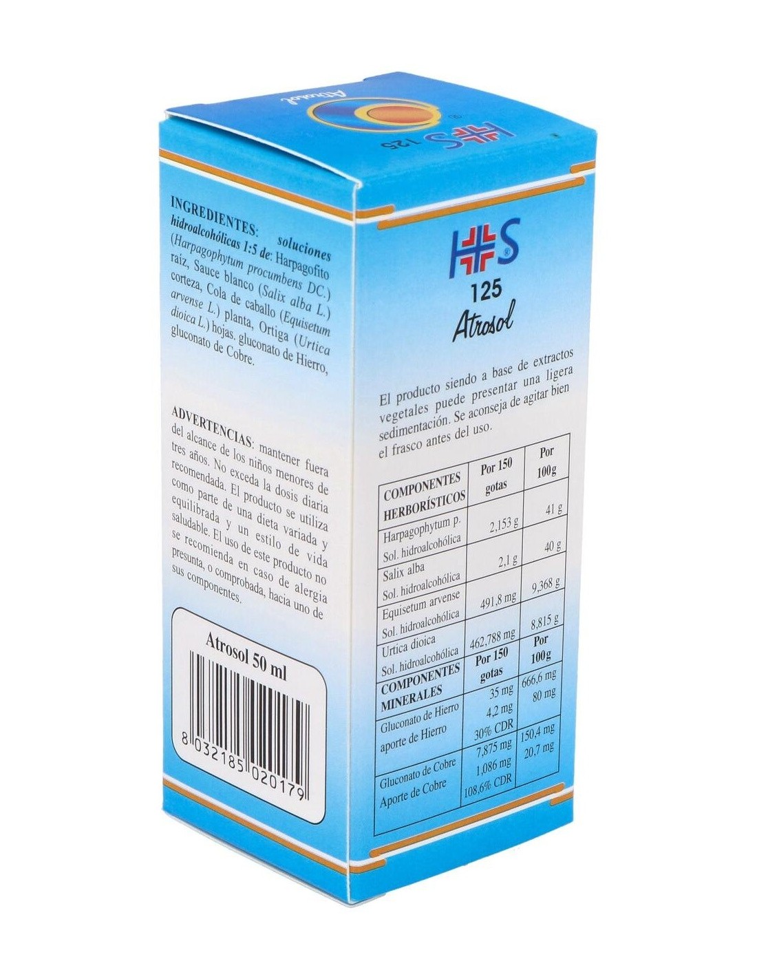 Atrosol es un complemento alimenticio a base de Hierro, Cobre y principios vegetales. El harpagofito y la ortiga contribuyen a la función normal de las articulaciones. El sauce blanco contribuye a la funcionalidad articular normal y es útil en la lucha contra los estados localizadas de tensión. El hierro contribuye a la formación normal de los glóbulos rojos y hemoglobina. El cobre contribuye a la protección de las células del estrés oxidativo.Atrosol de Herboplanet estas indicado para en casos de dolores reumáticos, artrosis, artritis, artrosis, mialgia, ciática, cefalea tensional (cefalea por contracción muscular).Ingredientes:Soluciones hidroalcohólicas 1:5 de: Harpagofito (Harpagophytum procumbens DC.) raíz, Sauce blanco (Salix alba L.) corteza, Cola de caballo (Equisetum arvense L.) planta, Ortiga (Urtica dioica L.) hojas. gluconato de Hierro, gluconato de Cobre.Alcohol 50% vol.Modo de empleo:Tomar 50 gotas con poca cantidad de agua, 3 veces al día.Presentación:Envase de 50 ml.