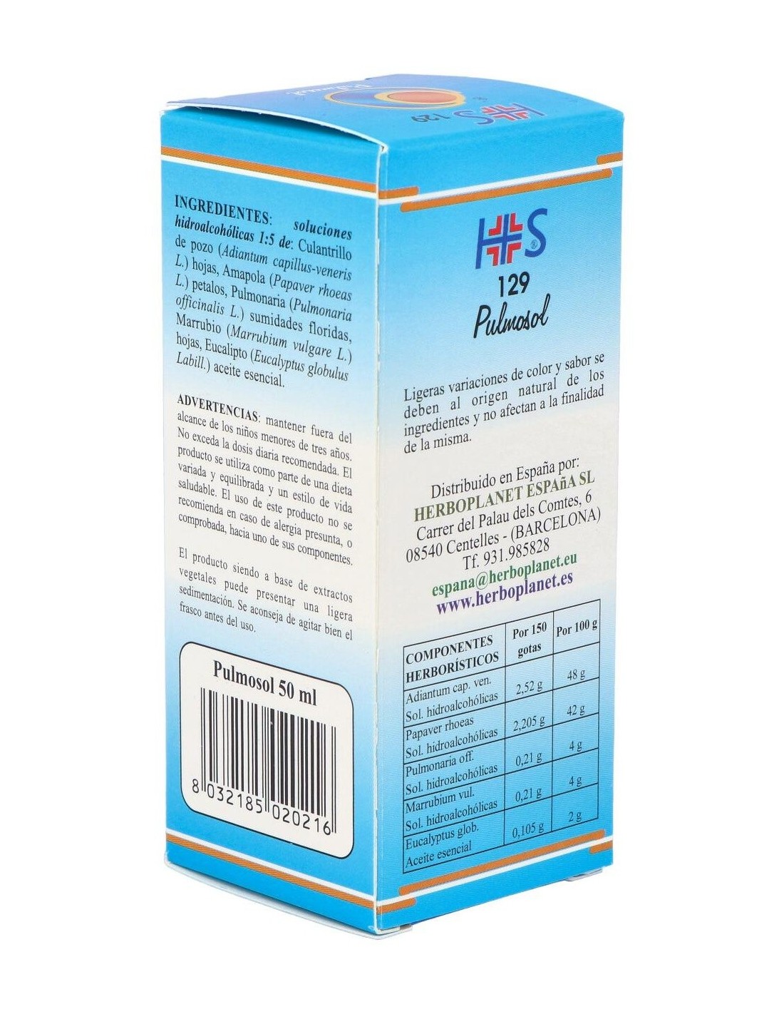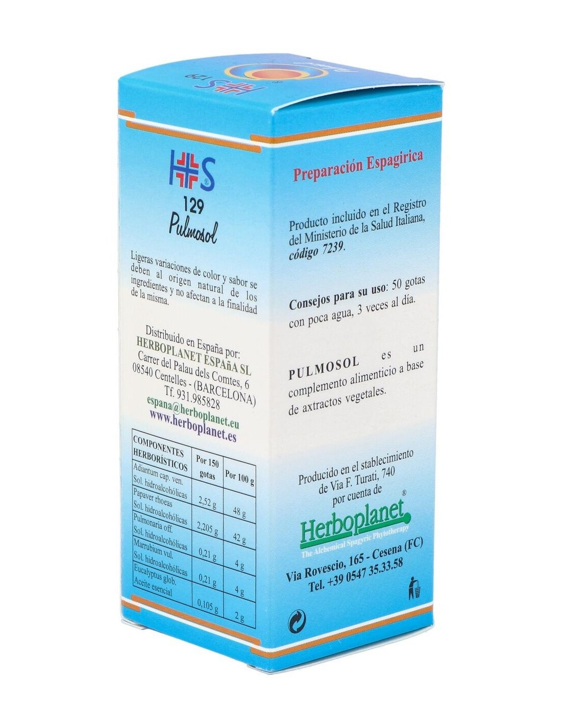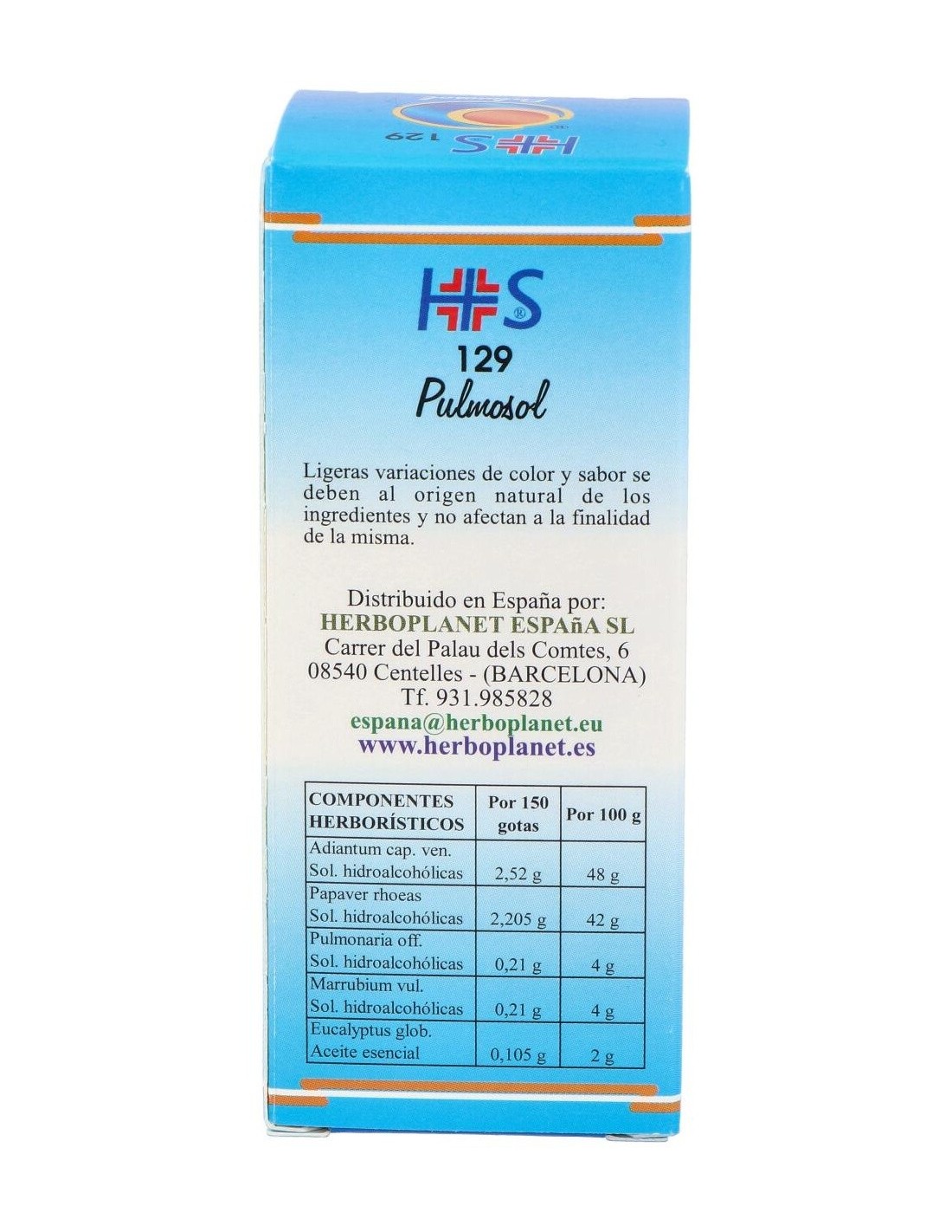 Pulmosol de Herboplanet es un complemento alimenticio a base de extractos vegetales que contribuye a la funcionalidad de la mucosa del sistema respiratorio, a la funcionalidad de las vías respiratorias superiores. Promueve el bienestar de la garganta. El MARRUBIO favorece la fluidez de las secreciones bronquiales y a la acción emoliente y calmante (funcionalidad de la mucosa orofaríngea y del tono de la voz).Pulmosol esta recomendado en casos de asma, fibrosis pulmonar, enfisema pulmonar, alergias, toses espasmódicas y nerviosas.Principios activos: