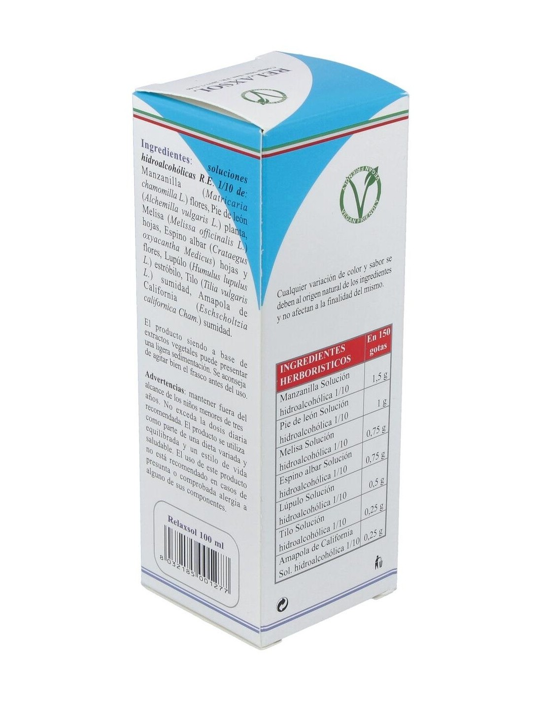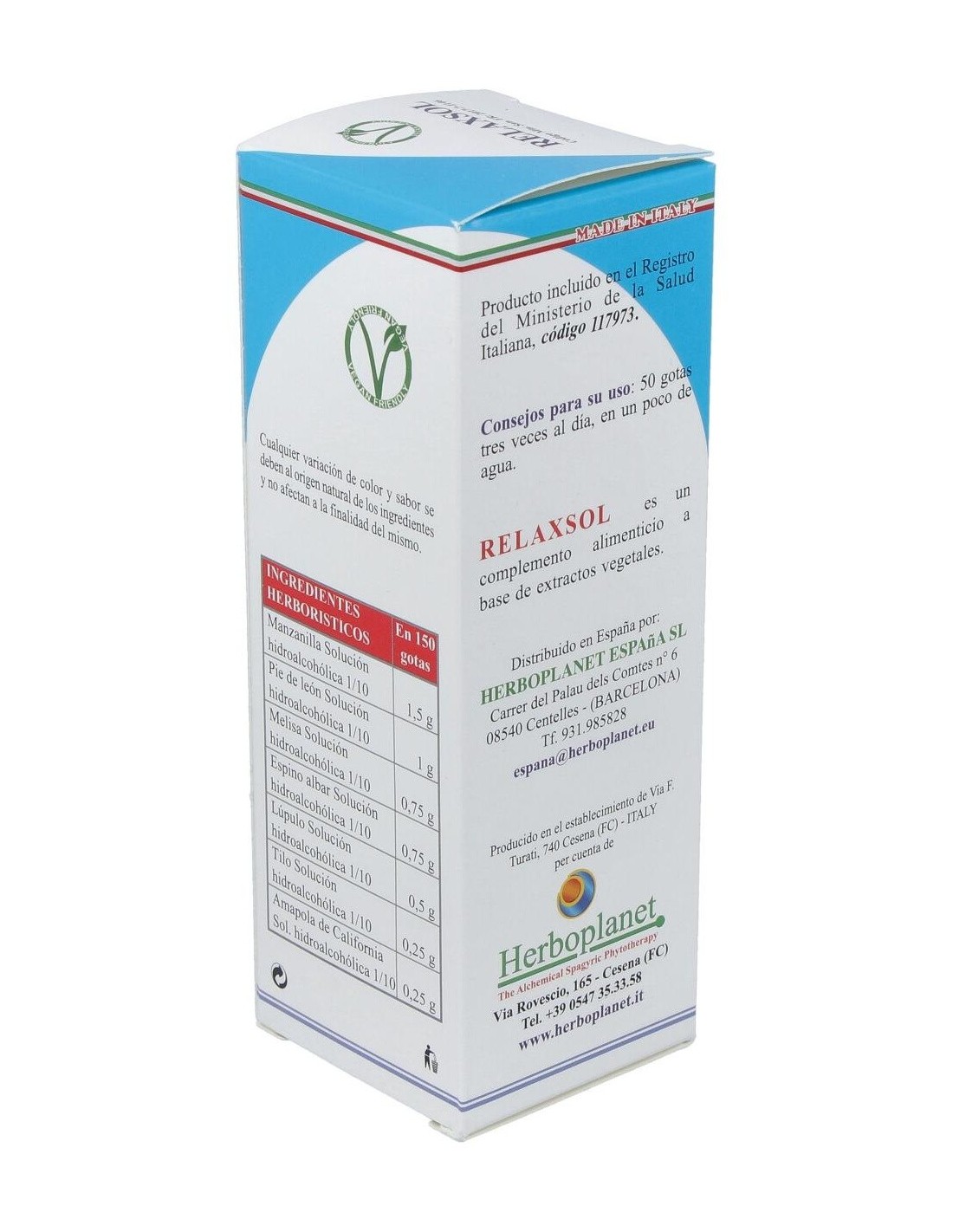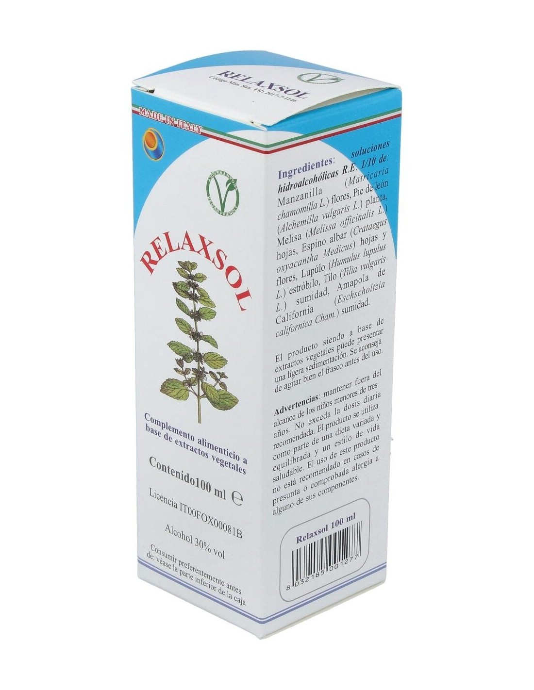Relaxsol es un complemento alimenticio a base de ingredientes vegetales que promueve la relajación, el sueño y el bienestar mental. Además de ser un antioxidante, promueve la función digestiva y la eliminación de los gases. Útil para la relajación y el bienestar mental, así como para recuperar el estado de ánimo normal. El lúpulo, el tilo y la amapola de california promueven el sueño y la relajación en caso de estrés. El espino albar contribuye a la regularidad de la presión arterial.Principios activos: