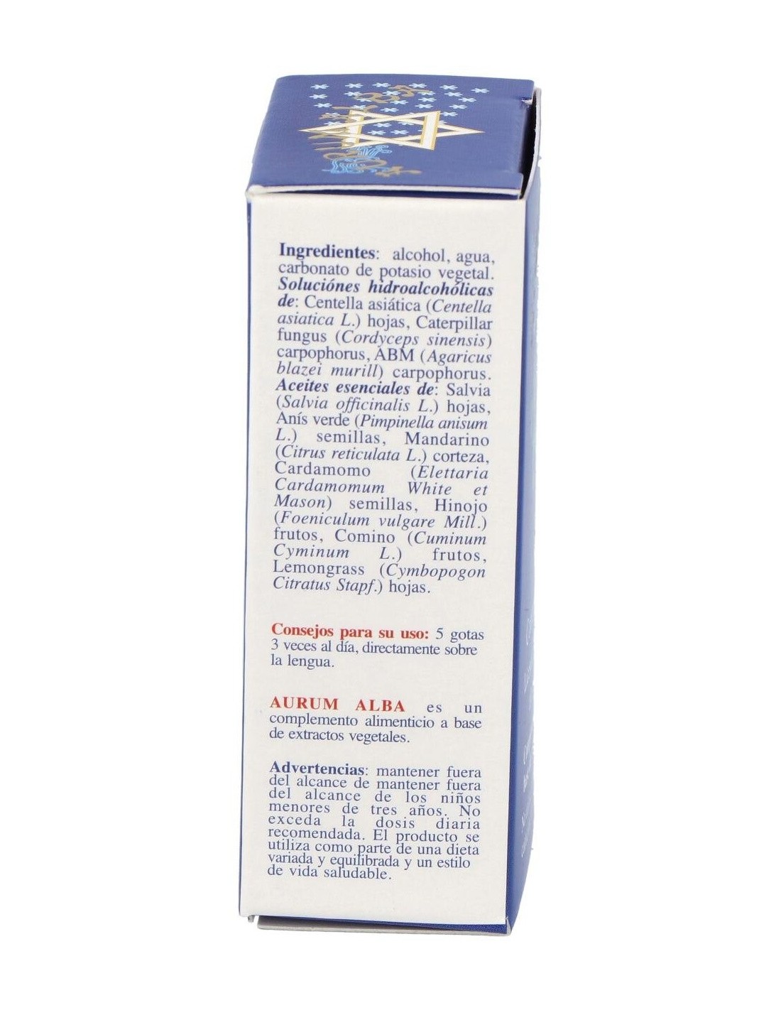 Aurum Alba es un complemento alimenticio a base de extractos vegetales. La centella asiática contribuye a la funcionalidad de la microcirculación (piernas pesadas), a la memoria y funciones cognitivas. El cordyceps, así como el ABM, contribuye a las defensas naturales del cuerpo, también tiene una acción tonificada, y de soporte metabólico.Sage contribuye a la función digestiva y a la eliminación de los gases intestinales. Ayuda el proceso regular de sudoración, y contrarresta los trastornos de la menopausia. Salvia es útil como tónico en la fatiga física y mental.Principios activos: