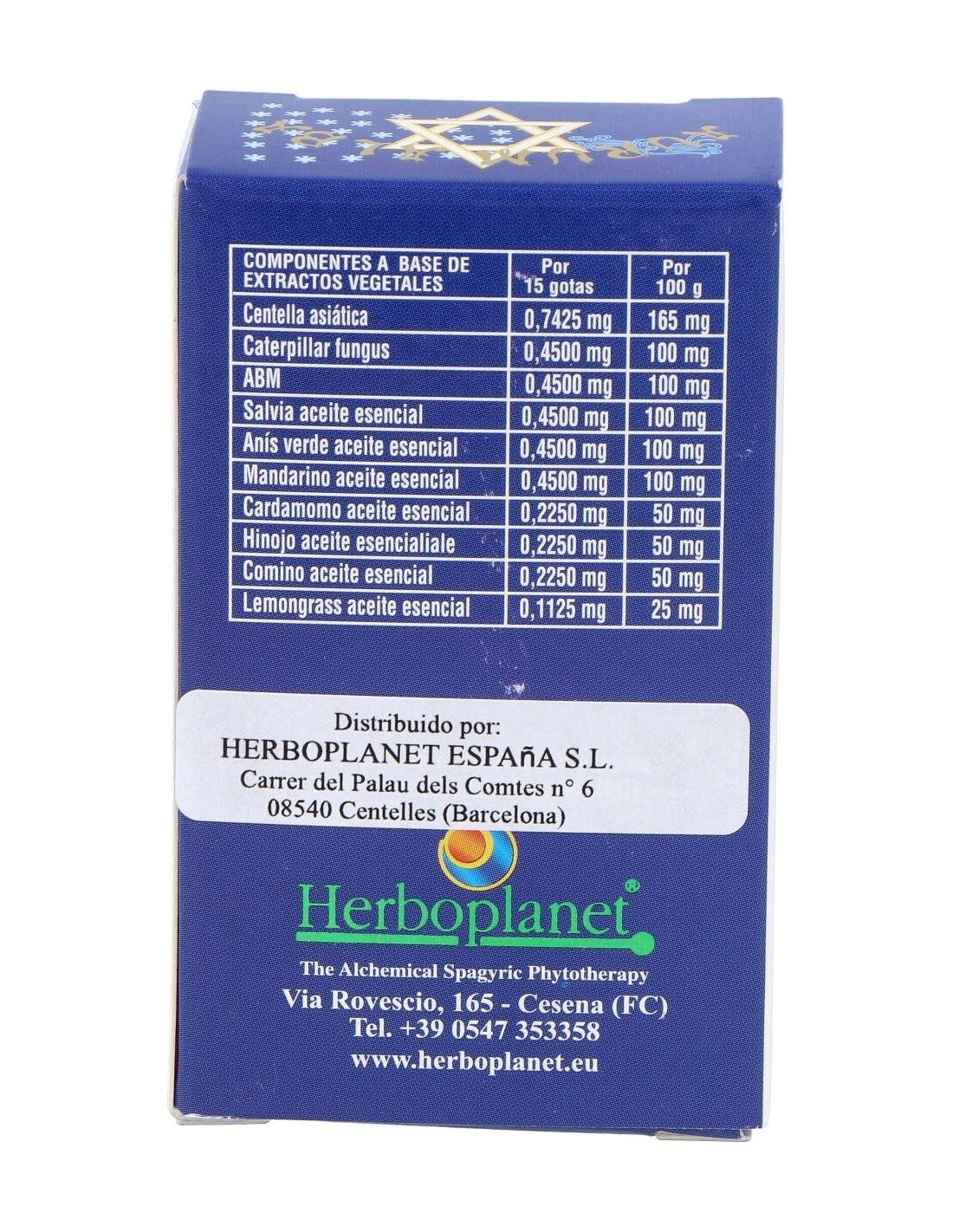 Ingredientes:Alcohol, agua, carbonato de potasio vegetal carbonato de potasio vegetal. Soluciónes hidroalcohólicas de: Centella asiática (Centella asiatica L.) hojas, Caterpillar fungus (Cordyceps sinensis) carpophorus, ABM (Agaricus blazei murill) carpophorus. Aceites esenciales de: Salvia (Salvia officinalis L.) hojas, Anís verde (Pimpinella anisum semillas. Mandarino (Citrus reticulata L.) corteza, Cardamomo (Elettaria Cardamomum White Mason) semillas. Hinojo (Foeniculum vulgare Mill.) frutos, Comino (Cuminum Cyminum L.) frutos, Lemongrass (Cymbopogon Citratus Stapf.) hojas.Alcohol 50% vol.Modo de empleo:Tomar 5 gotas, 2 veces al día, directamente sobre la lengua.Presentación:Envase de 10 ml.