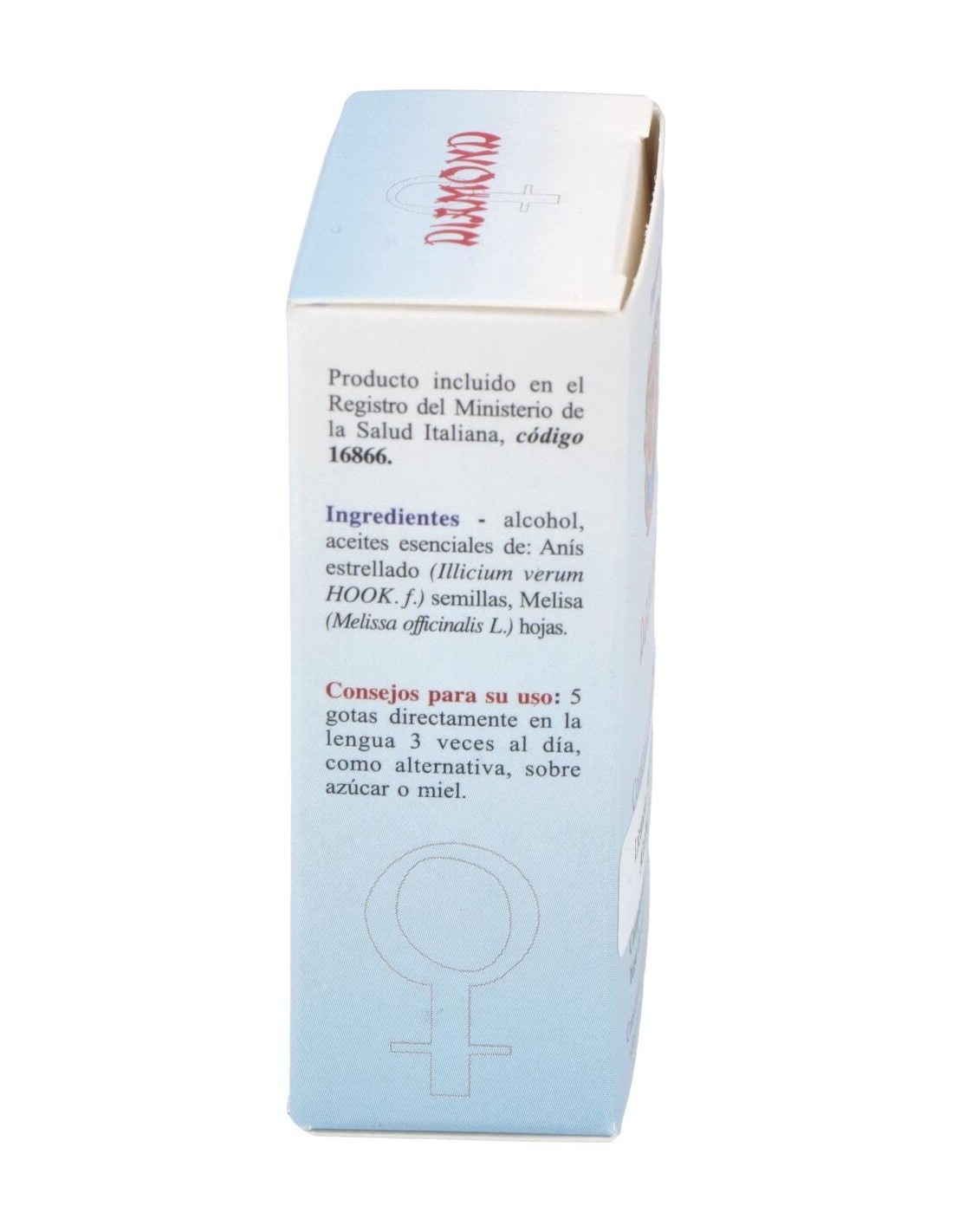 Ingredientes por 10 ml:QSA (Quintaesencia Espagírica Alquímica de Solanimus) de Anís estrellado ((Illicium verum HOOK. f.) 41,77 mg, QSA (Quintaesencia Espagírica Alquímica de Solanimus) de Melisa (Melissa officinalis L.) 38,02 mg. Cobre alquímico. Diamante alquímico.Modo de empleo:Tomar 5 gotas directamente en la lengua 3 veces al día, como alternativa, sobre azúcar o miel.Presentación:Envase de 10 ml.