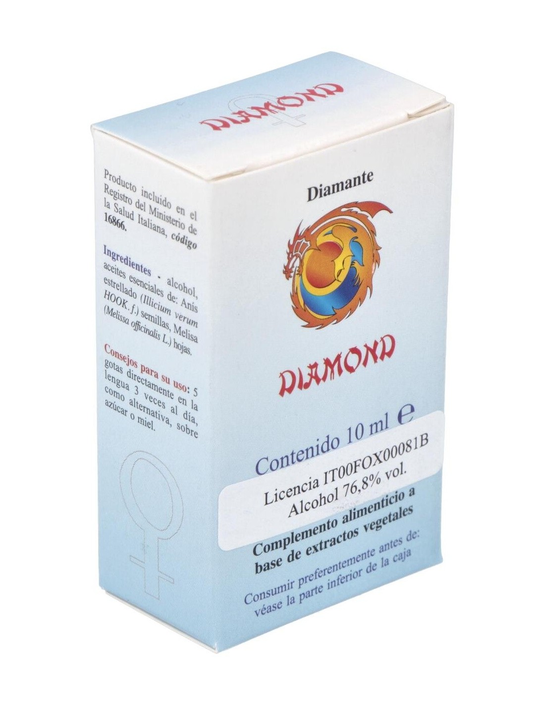 El Diamante es un concentrado de color índigo. El índigo pertenece al planeta benévolo Venus. Así mismo el color índigo y el diamante pertenecen al principio Agua y ambos son fríos y positivos en su naturaleza. Los libros de medicina india opinan que el diamante contiene los seis sabores: dulce, áspero, salado, picante, amargo y astringente.El Anís Estrellado tiene signatura de Júpiter y de Venus y a nivel psicosomático ayuda a digerir las situaciones incómodas. La Melisa tiene signatura Venus y Júpiter participando de la misma fuerza arquetipal del anís. Su acción es específica para la regulación del sistema nervioso autónomo. El estaño alquímico es el metal de Venus también en la tradición india. La piedra con la que se relaciona por analogía es el Diamante para la tradición Hindú mientras que en la tradición occidental la piedra de Venus es la esmeralda.El diamante induce al individuo a analizar las consecuencias de sus propias acciones. Promueve el pensamiento racional, permite comprender la relación entre las cosas más diversas. Estimula la capacidad de aprendizaje y facilita la integración de nuevos conocimientos con los ya adquiridos, permitiendo al sujeto aplicar rápidamente aquellos que ha asimilado. Por último, refuerza la capacidad de tomar decisiones claras precisas y de resolver los problemas.Principios activos: