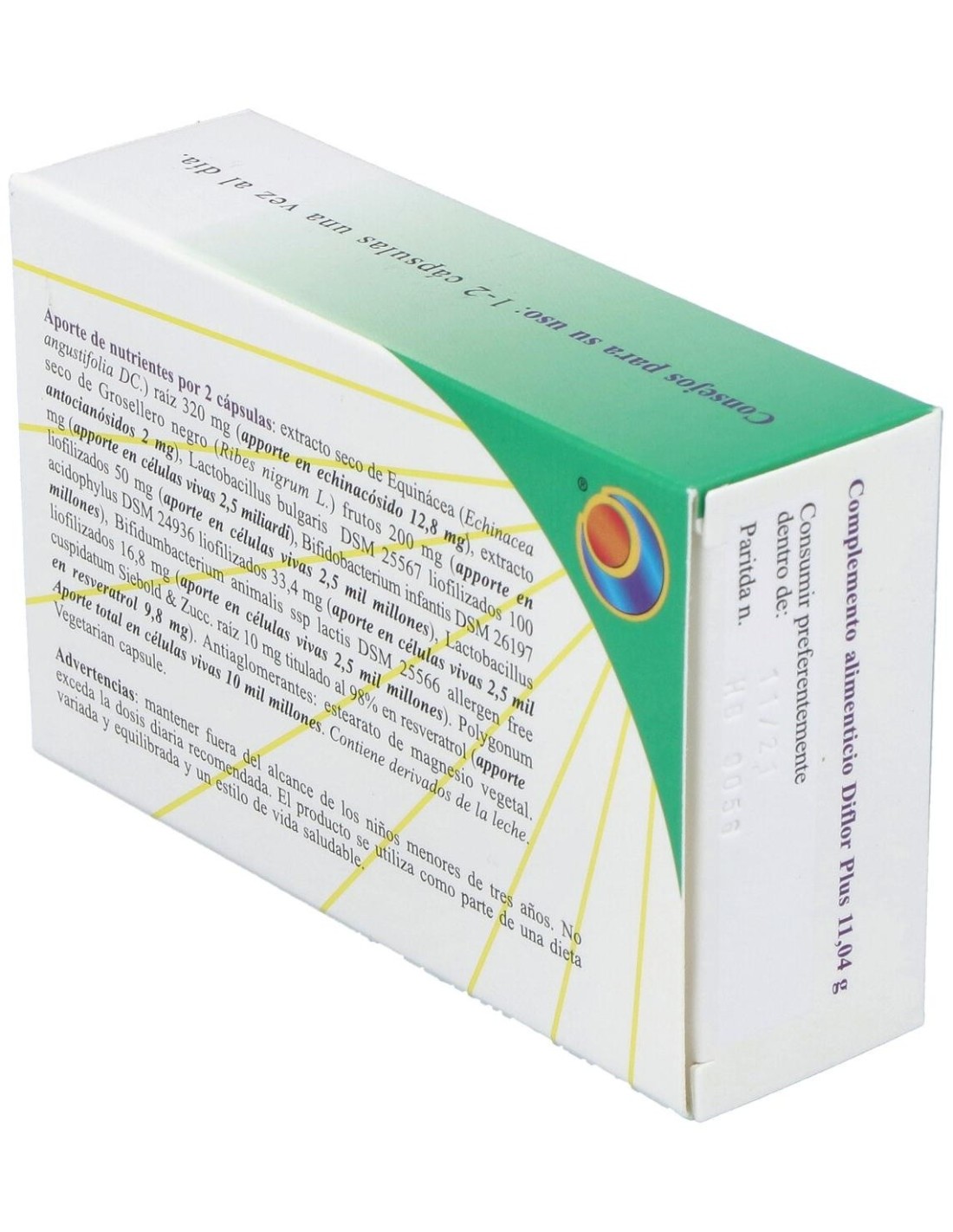 Diflor Plus de Herboplanet es un complemento alimenticio a base de lactobacilos y extractos vegetales. Contribuye a las naturales defensas del cuerpo y a el bienestar de las vías urinarias. Y a la regularidad de las deposiciones.Diflor Plus de Herboplanet es un complemento alimenticio recomendado en los siguientes casos estimulante del sistema inmunitario, preventivo de las infecciones intestinales, diarrea asociada a los antibióticos, diarrea de los viajeros, diarreas infantiles, enfermedades inflamatorias intestinales, síndrome del colon irritable, colitis, disbiosis intestinal, inflamacionesurogenital, cándida albicans, helicobacter pylori, intolerancia a la lactosa, mejora la absorción de minerales y vitaminas.Ingredientes por 2 cápsulas:Extracto seco de Equinácea (Echinacea angustifolia DC.) raíz 320 mg (aporte en echinacósidos 12,8 mg), extracto seco de Arándano (Ribes nigrum L.) frutos 200 mg (aporte en antocianósidos 2 mg), Lactobacillus bulgaricus DSM 25567 liofilizado 100 mg (aporte en células vivas 2,5 mil millones), Bifidobacterium infantis DSM 26197 liofilizado 50 mg (aporte en células vivas 2,5 mil millones), Lactobacillus acidophilus DSM 24936 liofilizado 33,4 mg (aporte en células vivas 2,5 mil millones), Bifidumbacterium animalis ssp lactis DSM 25566 liofilizado libre de alérgenos 16,8 mg (aporte en células vivas 2,5 mil millones). Resveratrol titulado al 98% desde raíz de Poliganum cuspidatum Siebold & Zucc.10 mg. (aporte en resveratrol 9,8 mg). Antiaglomerante: sales de magnesio de ácidos grasos. Aporte total de células vivas 10 mil millones.Modo de empleo:Tomar 1 - 2 cápsulas al día.Presentación:Envase de 24 cápsulas.