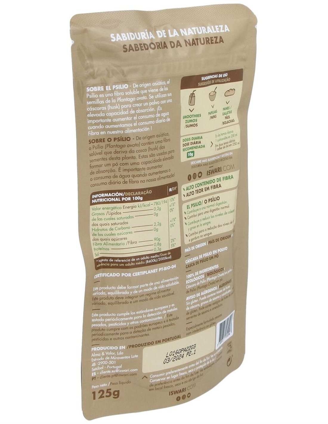 El Cáscara De Psyllium 125G Bio Ptes 125G de Iswari es un suplemento natural pensado para personas que buscan incorporar fibra vegetal de origen orgánico en su alimentación diaria. Su formato en polvo facilita su integración en diversas preparaciones, adaptándose a diferentes estilos de vida.