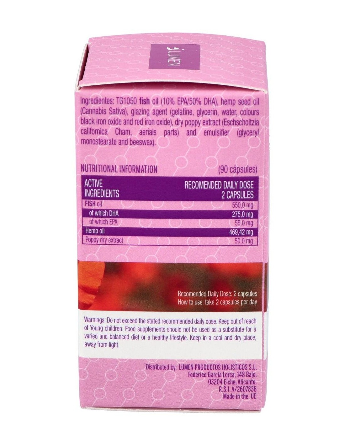 Fórmula a base de aceite de pescado (DHA y EPA), extracto de cáñamo y amapola. Presentada en perlas duras.