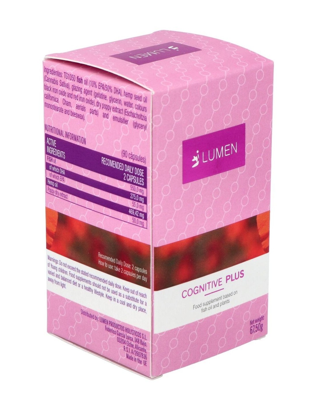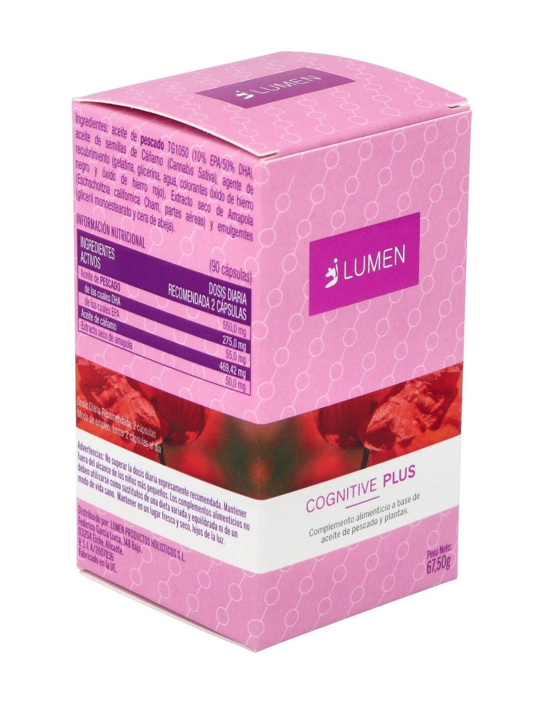 Fórmula a base de aceite de pescado (DHA y EPA), extracto de cáñamo y amapola. Presentada en perlas duras. Elaborada para mejorar las funciones cognitivas.