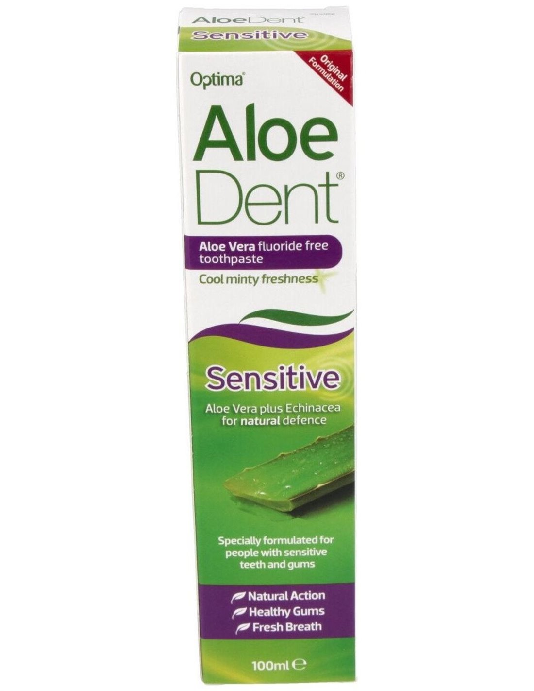 Dentífrico Aloe Dent Sensitive de Evicro es un producto especialmente indicado para dientes y encías sensibles.?Tiene propiedades bactericidas y un efecto calmante instantáneo. Limpia y protege los dientes.Ingredientes (INCI):Glycerin (origen vegetal), Sorbitol (origen vegetal), Hydrated Silicia (origen mineral), Aloe Barbadensis, Aqua, Sodium Lauroyl Sarcosinate (derivado proteico), Mentha Piperita (aceite de hierbabuena), Xanthal Gum (origen natural) Mentol (origen natural), Phytonadione (vitamina K), Echinacea Angustifolia, Escin (Castaño de Indias), Melaleuca Alternifolia (Aceite de árbol de té), Xylitol (origen vegetal), Sodium Hydroxymethylglycinate (de origen proteico), Ácido cítrico , Cl 75810 (Clorofina-Colorante natural).Modo de empleo:Cepillar los dientes meticulosamente, preferiblemente después de cada comida, o al menos dos veces al día, o según indique el dentista. A continuación enjuagar adecuadamente.Presentación:Envase de 100 ml.Recomendaciones y advertencias:No contiene flúor ni SLS.