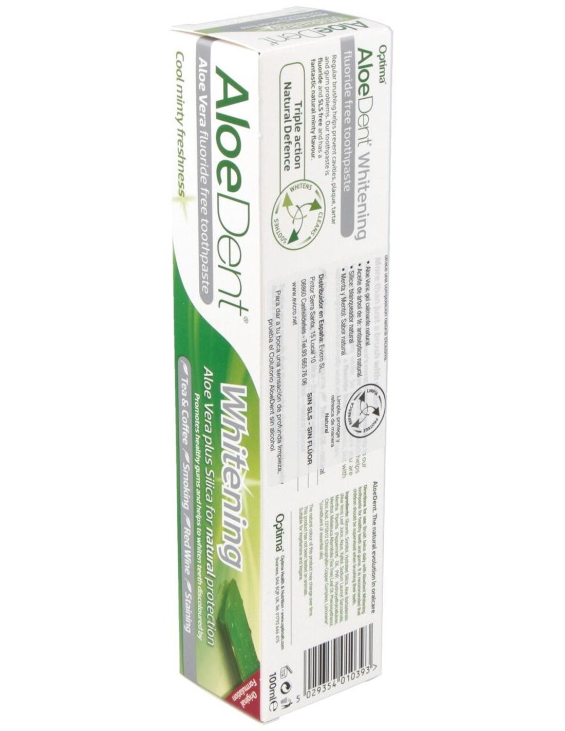 Dentífrico Aloe Dent Blanqueante de Evicro es un producto indicado para dientes con manchas formadas por té, café, tabaco, etc. Ayuda a mantener las encías sanas y tiene un efecto calmante instantáneo. Limpia y protege los dientes. Ingredientes (INCI):Glicerina (origen vegetal), Sorbitol (de maicena), Sílice (hydrated silica-mineral origin), Agua (Aqua), Xylitol (hidratos de carbono a partir de abedul), Sodium lauroyl sarcosinate (de glicina - n- derivado de metilo de glicina (aminoácido) y ácidos grasos vegetales), Hidroxietilcelulosa (hydroxyethylcellulose), Mentol (costituyente de menta), Sodio hidroximetilglicinato (Sodium hydroxymethylglycinate) (de la glicina-aminoácido) , Citric acid ácido cítrico (de Aspergillus niger - derivado de maíz, pero ausente en el producto terminado), CI75810- Clorofila (chlorophyll-complejo de cobre Color- Natural).Modo de empleo:Cepillar los dientes meticulosamente, preferiblemente después de cada comida, o al menos dos veces al día, o según indique el dentista. A continuación enjuagar adecuadamente.Presentación:Envase de 100 ml.Recomendaciones y advertencias:No contiene flúor ni SLS.