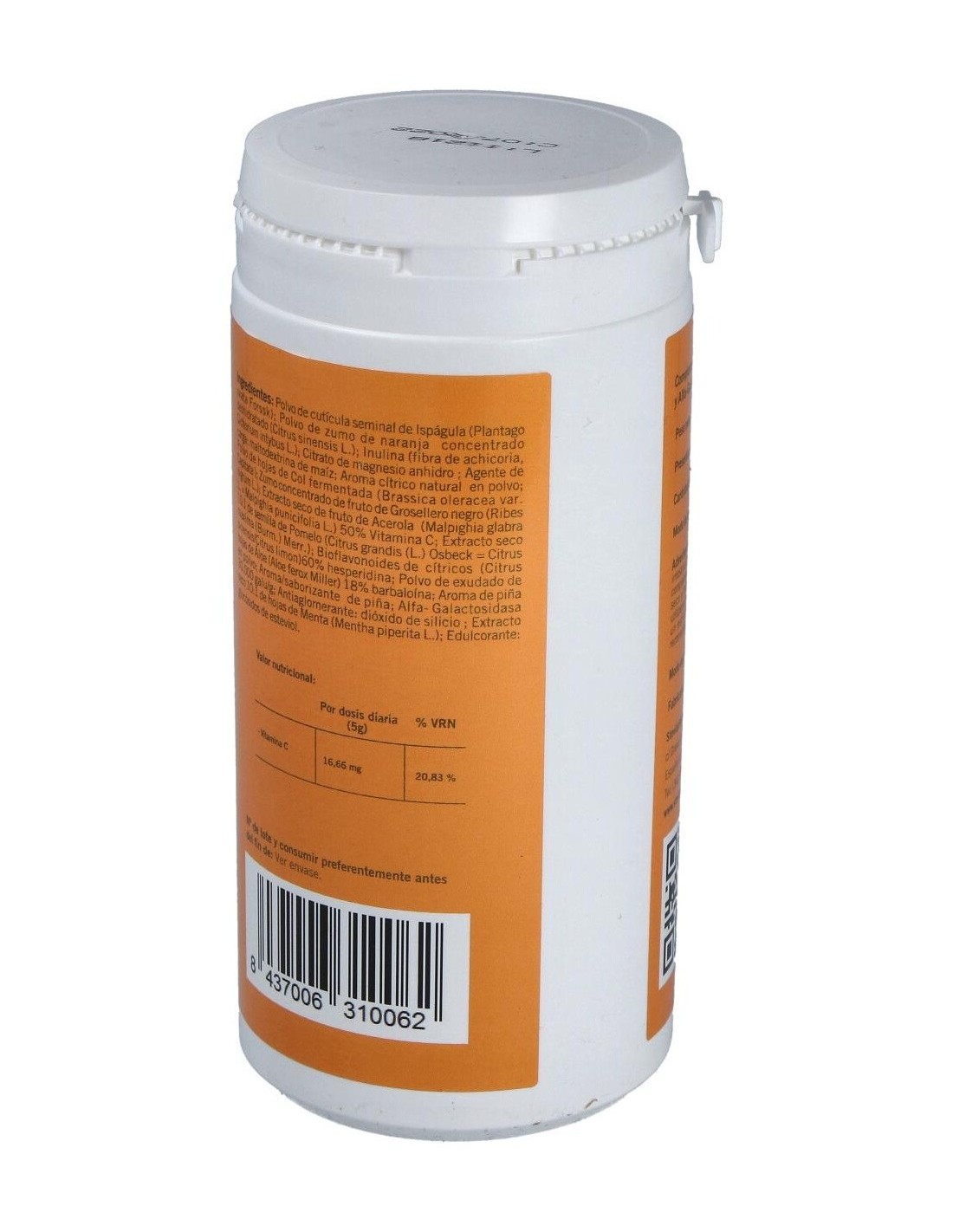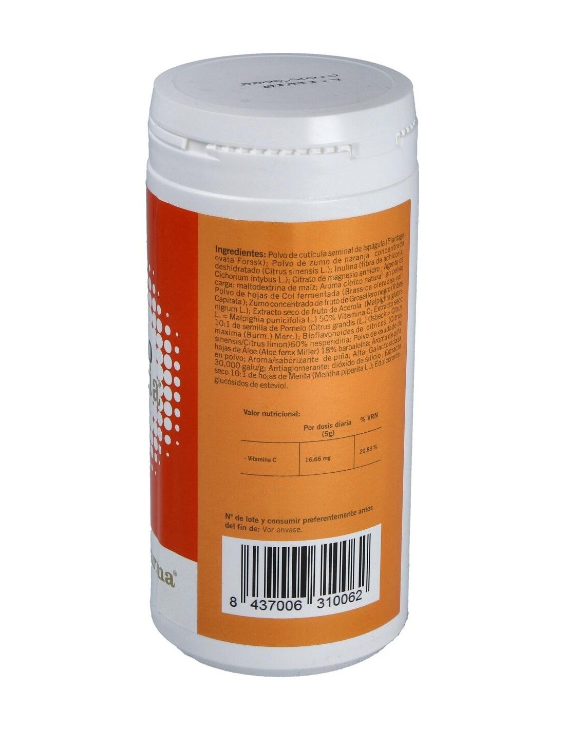 Ispágula cutícula (plantago ovata forssk): inulina (fibra de achicoria), col fermentada liofilizada, (brassica oleracea var. capitata:): grosellero negro fruto zumo concentrado: acerola fruto esn 50% vit. c (malpighia glabra l.): aloe acibar polvo hojas 18% barbaloína (aloe ferax miller), menta hojas esn ratio 10:1 (mentha piperita l.): pomelo semilla esn (citrus grandis l. osbeck). alfa-galactosidasa 30.000 galu/g.: bioflavonoides cítricos 60% hesperidina (citrus sinensis): aroma cítrico natural polvo, piña, naranja polvo zumo concentrado (citrus sinensis l.) agente de carga: maltodextrina de maíz.