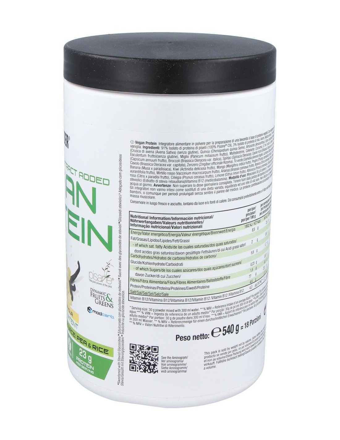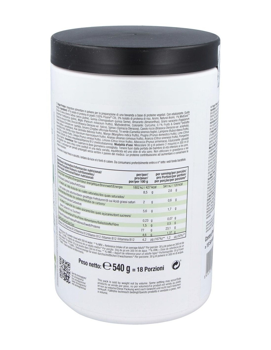 91% Aislado de proteína de guisante (100% Pisane® C9), 3% aislado de proteína de arroz, 2% ModCarb (salvado de avena (sin gluten), quinoa, amaranto, alforfón (sin gluten), mijo), aroma natural, colorante: cúrcuma: 0,1% Fruit & Greens extract (paprika, jengibre, brócoli, espinaca, col rizada, col, té verde, frambuesa, plátano, kiwi, mango, ciruela, lima, arándano, piña, naranja, pomelo rosa, cereza, limón, coliflor, trigo germinado (sin gluten), alfalfa, spirulina, chlorella, maltodextrina, goma arábiga, almidón de maíz), edulcorante: glucósidos de esteviol (extracto de stevia): cloruro de sodio.