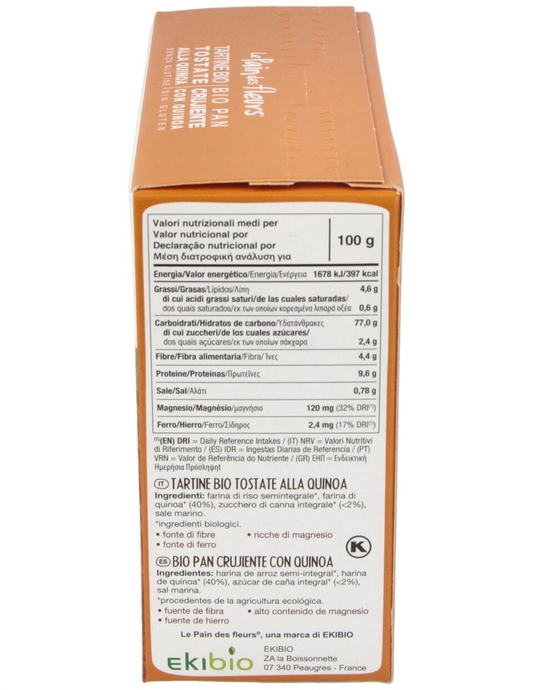Ingredientes:Harina de arroz semi-integral*, harina de quinoa* (40%), azúcar de caña integral* (<2%), sal marina. (*) Ingredientes procedentes de la agricultura ecológica.Valor nutricional por 100 gramos: