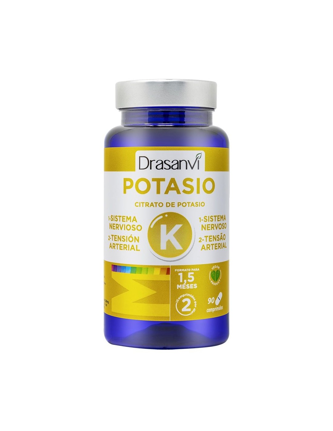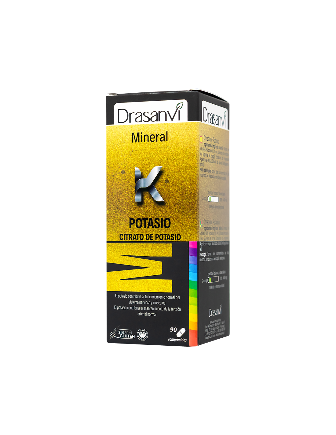 El potasio es un mineral esencial para nuestro cuerpo, por ello se ha seleccionado la forma de citrato, ya que aumenta la biodisponibilidad, por parte de nuestro organismo.Entre las funciones del potasio en nuestro organismo, destacar que contribuye al funcionamiento normal del sistema nervioso, contribuye al funcionamiento normal de los músculos y al mantenimiento de la tensión arterial normal.Composición activa por 2 comprimidos:400 mg de potasio.Ingredientes:Citrato de potasio (36% potasio), Agente de carga (Celulosa microcristalina), Agente de carga (Sal magnésica de ácido graso), Antiaglomerante (Dióxido de silicio).Modo de empleo:Tomar 2 comprimidos al día repartidos en dos de las comidas principales.Presentación:Envase de 90 comprimidos.Recomendaciones y advertencias:Producto vegano.