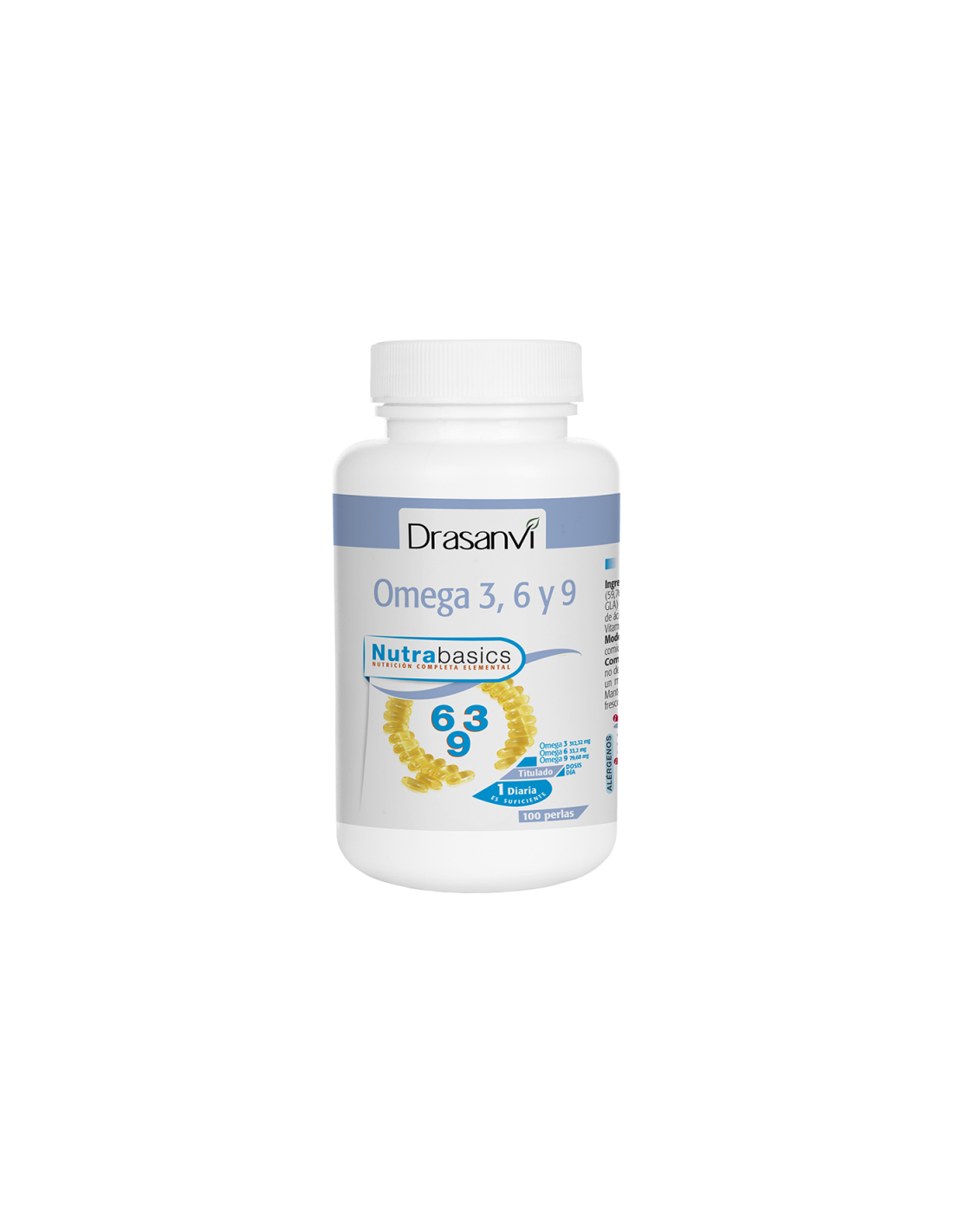 El Omega 3-6-9 1000Mg Bote 100 Perlas Nutrabasicos Drasanvi es un suplemento nutricional para adultos que aporta ácidos grasos esenciales, contribuyendo al mantenimiento del bienestar general mediante una fórmula equilibrada de omega 3, 6 y 9.