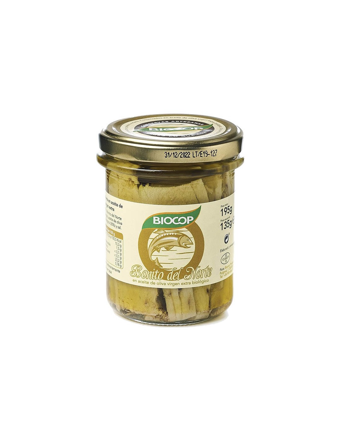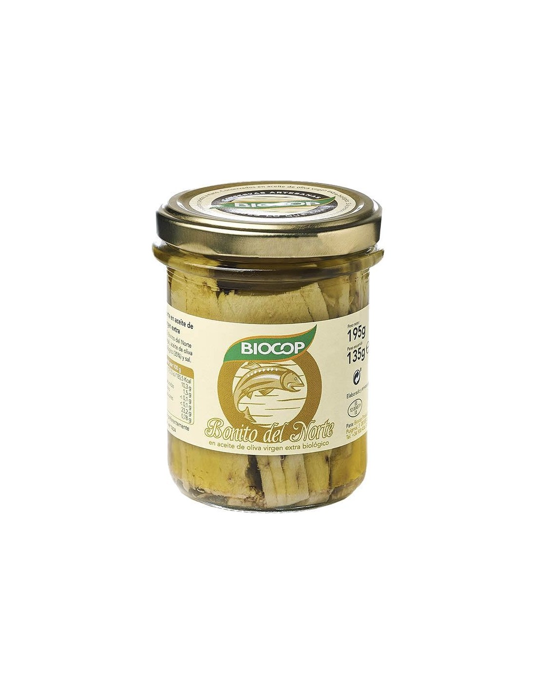Ingredientes:Bonito del Norte (Thunnus Alalunga), aceite de oliva virgen extra* 35%, sal. (*) De cultivo ecológico.Valor nutricional por 100 gramos: