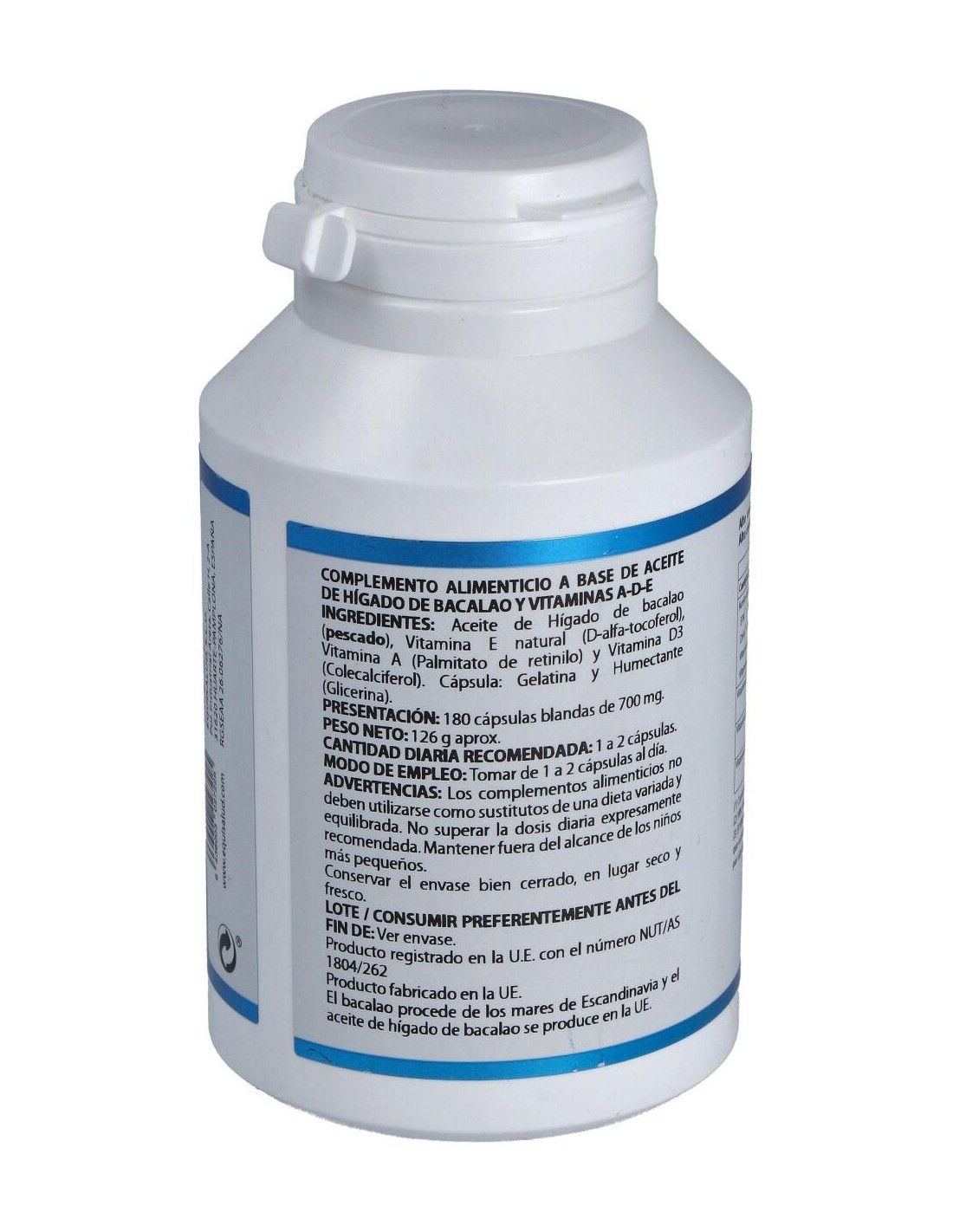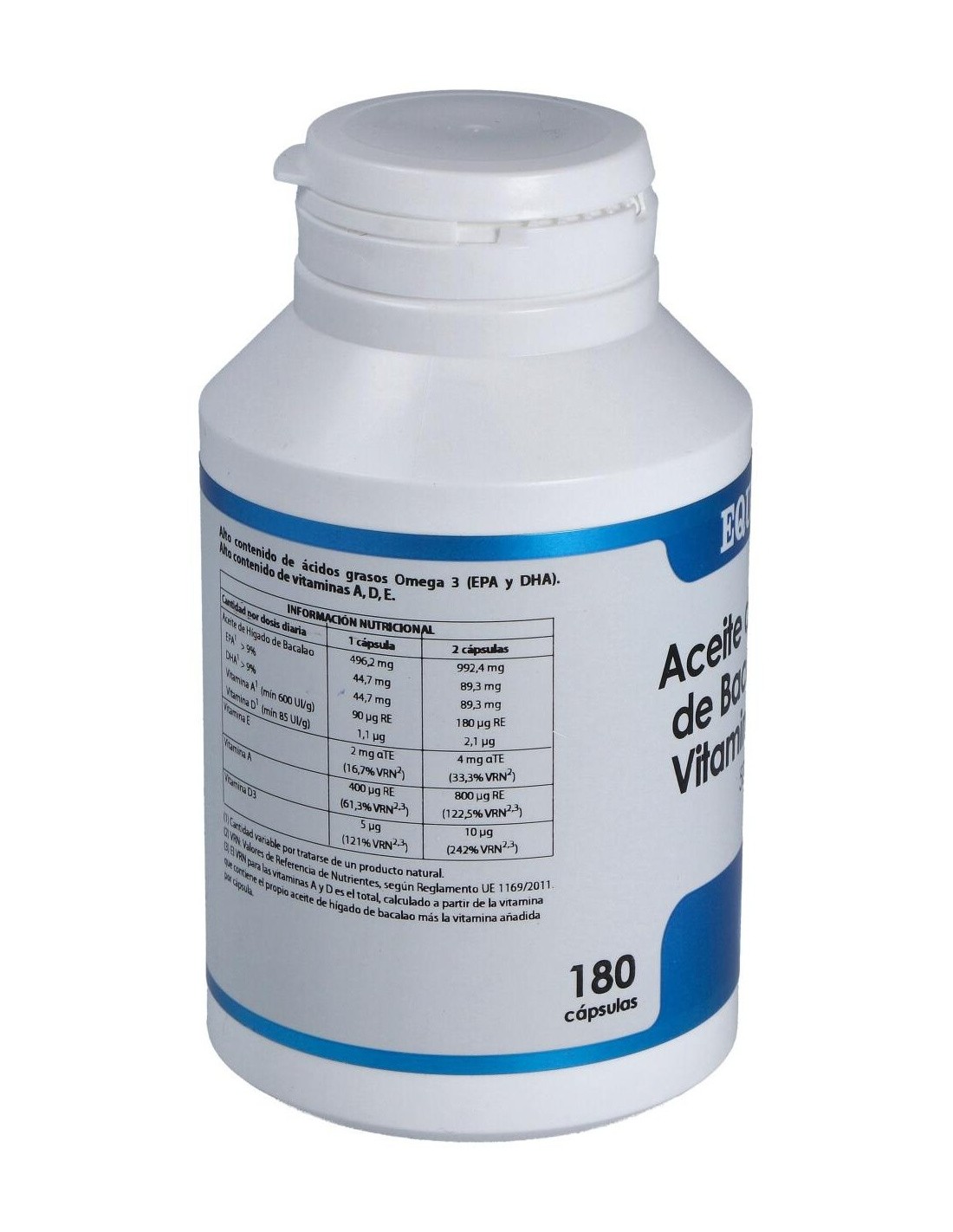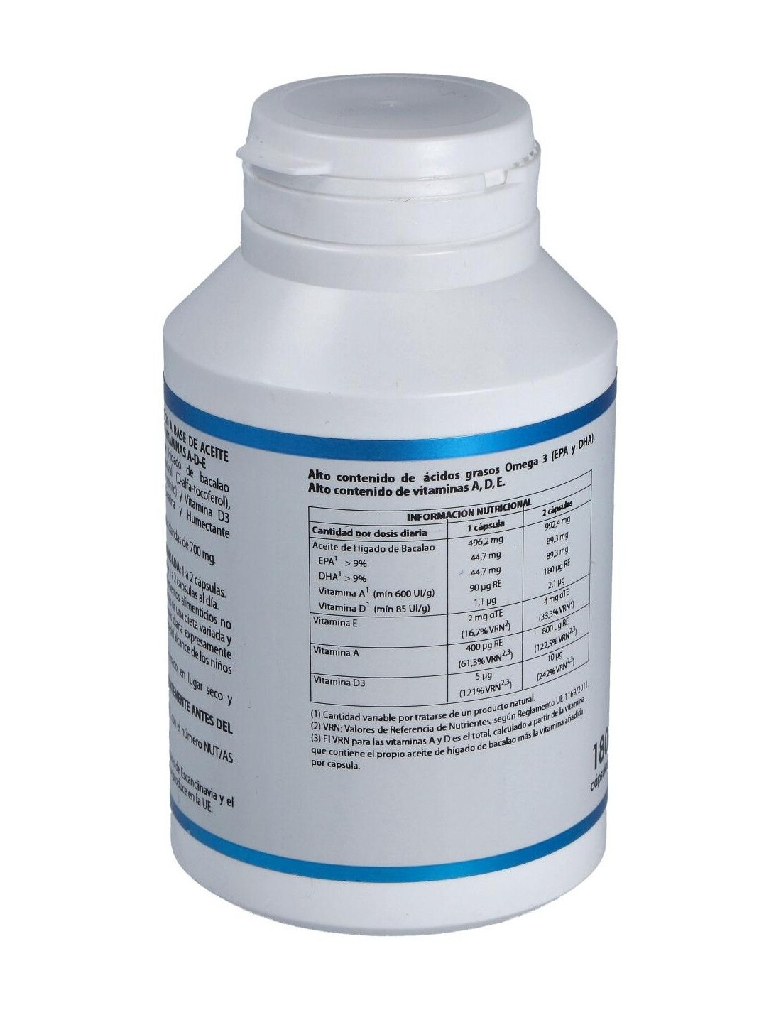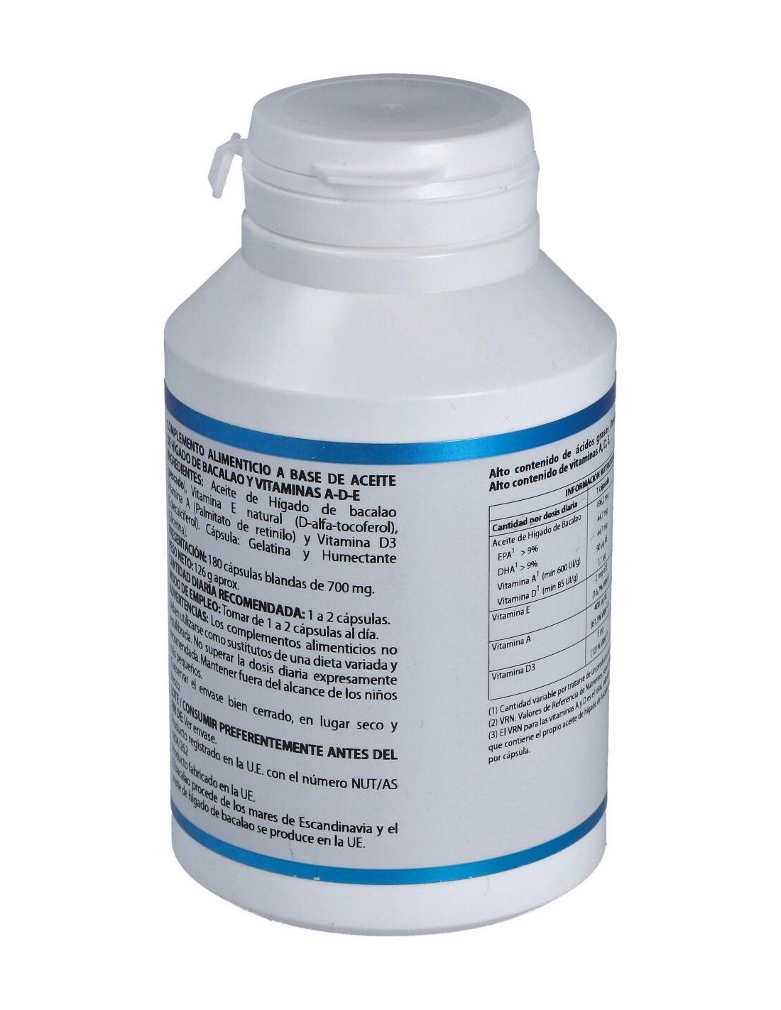 Composición por cápsula: Aceite de hígado de bacalao (EPA 7-16%, DHA 6-18)*, 496,22 mg; vitamina E natural 67% (D-alfa-tocoferol), 3 mg; vitamina A 1,7 MUI/g (palmitato de retinilo), 0,78 mg; vitamina D3 (colecalciferol), 5 µg. Envoltura: cápsula de gelatina blanda. Contiene: gelatina (agente de recubrimiento) y glicerina (humectante). * El bacalao procede de los mares de Escandinavia y el aceite de hígado de bacalao se produce en la U.E.