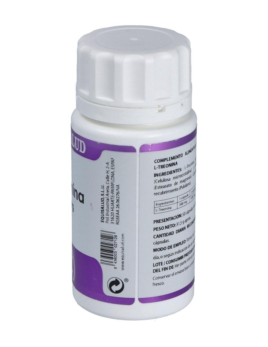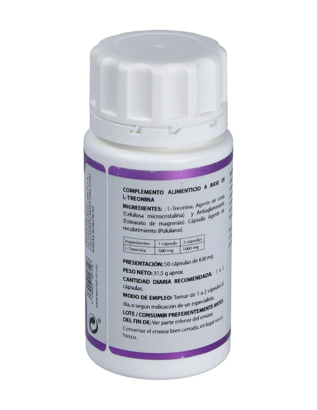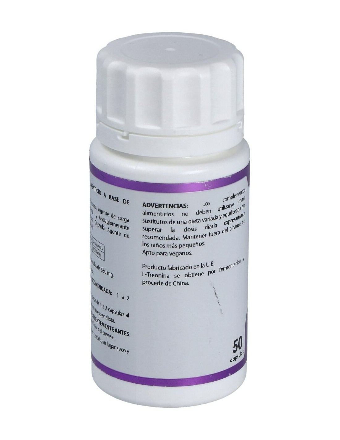 Composición por cápsula: L-treonina*, 500 mg. Envoltura: polisacárido de origen vegetal (pululano). No contiene gluten, ni almidón, ni transgénicos, ni colorantes. Apta para vegetarianos, diabéticos y pacientes con dietas restrictivas. * L-treonina obtenida por fermentación. País de origen: China.