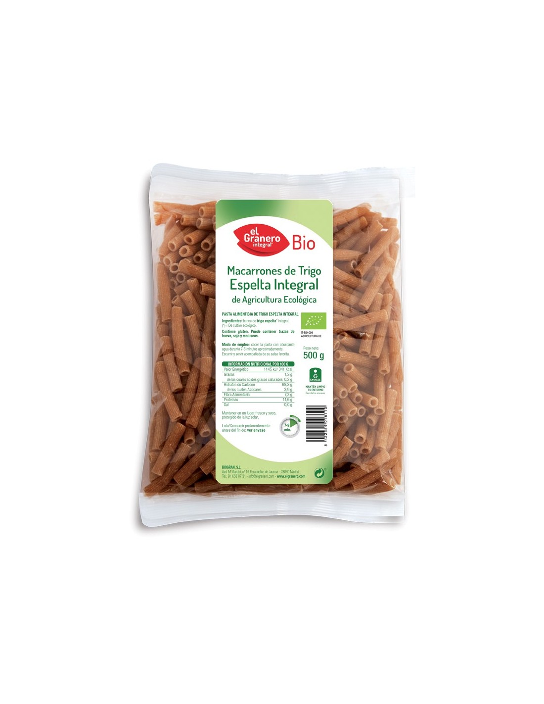 ¡Añade Ahora los Macarrones De Trigo Espelta Integral Bio, 500 G de El Granero Integral a tu Carrito!