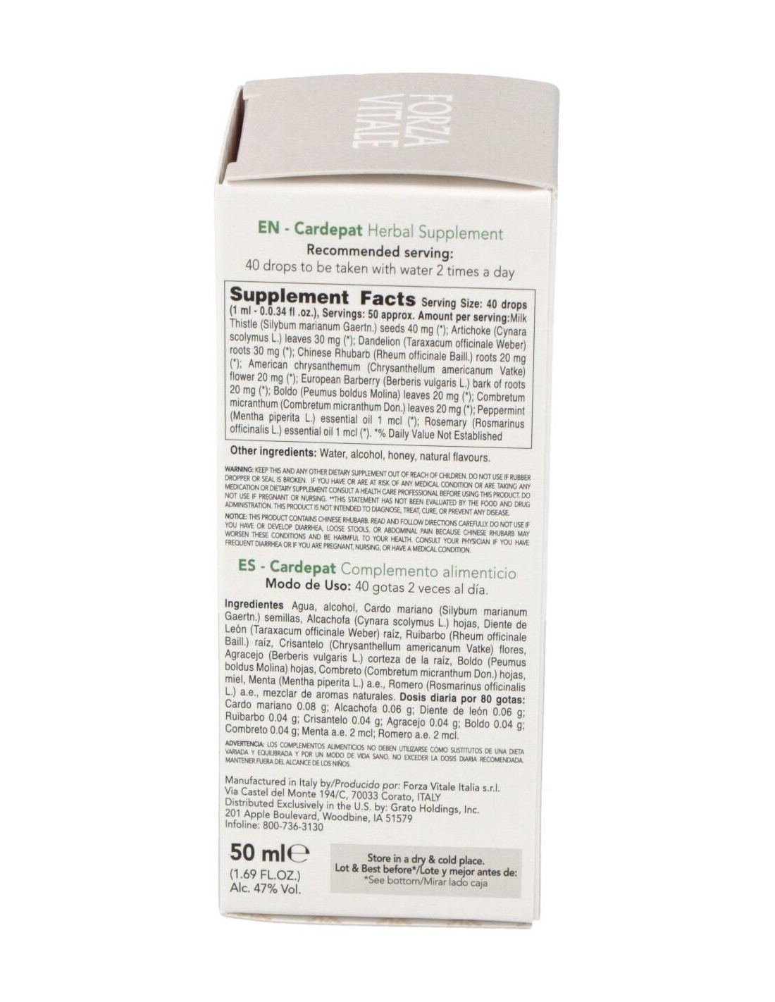 Ingredientes:Agua, Alcohol, Cardo mariano (Silybum marianum) semillas, Alcachofera (Cynara scolymus) hojas, Diente de león (Taraxacum of cinale) raíz, Ruibarbo (Rheum officinale) raíz, Crisantemo americano (Chrysanthellum americanum) flores, Berberis (Berberis vulgaris) corteza, Boldo (Peumus boldus) hojas, Combreto (Combretum micranthum) hojas, miel, Menta (Mentha piperita) a.e., Romero (Rosmarinus officinalis) a.e., mezcla de aromas naturales. Ingredientes activos por dosis diaria (2 ml):
