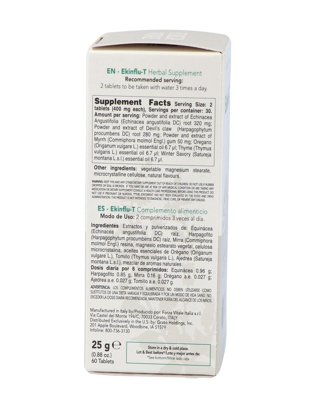 Extractos y Pulverizados de: Equinacea (Equinacea angustifolia) raíz, Harpagofito (Harpagophytum procumbens) raíz, Mirra (Commiphora molmol) resina, magnesio estearato vegetal, celulosa microcristalina, cutina; aceites esenciales de: Orégano (Origanum vulgare), Tomillo (Thymus vulgaris), Ajedrea (Satureja montana), mezcla de aromas naturales.