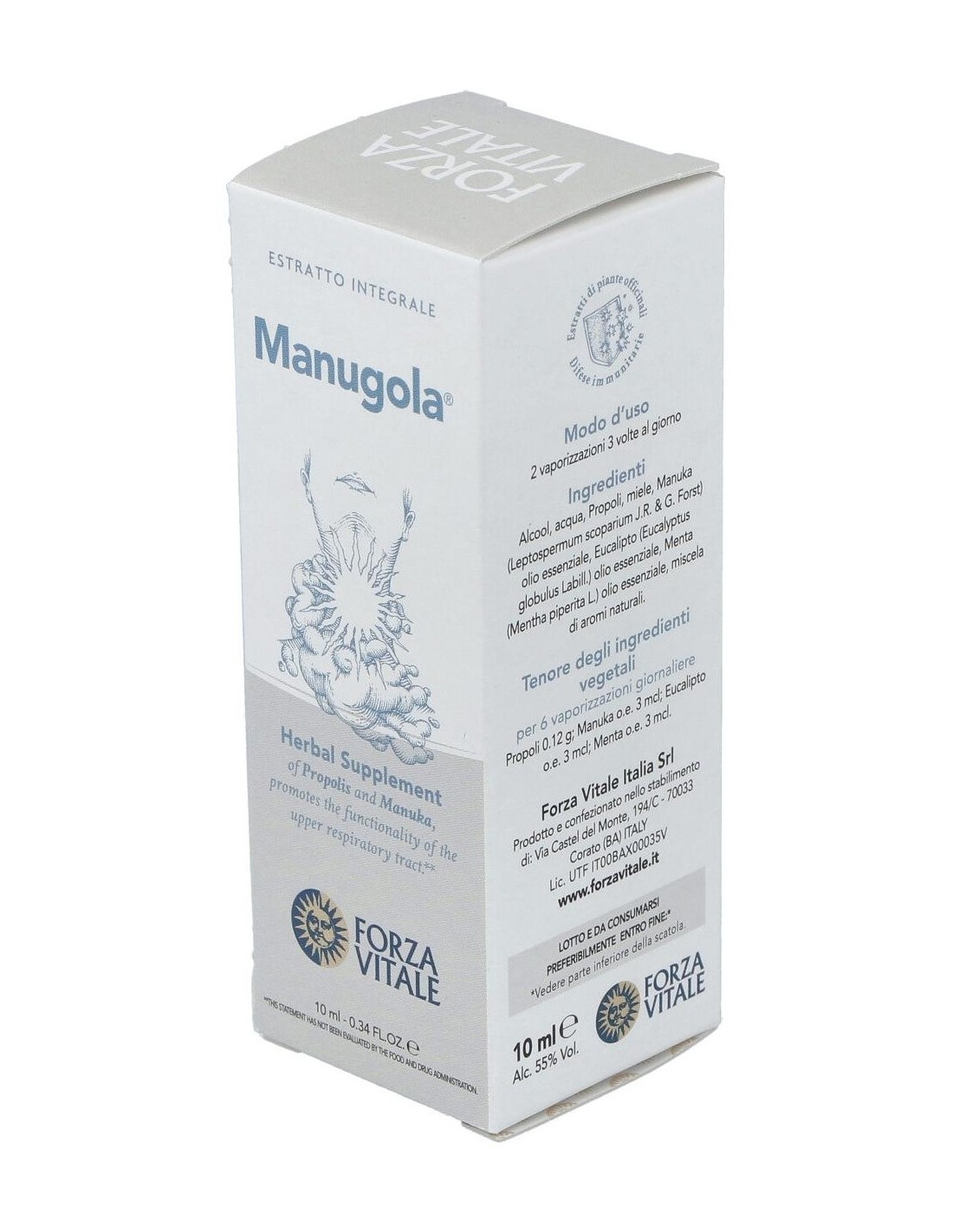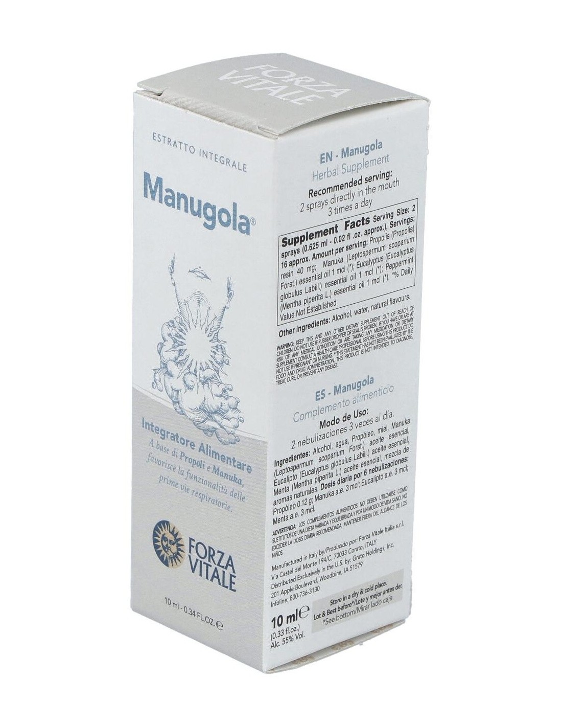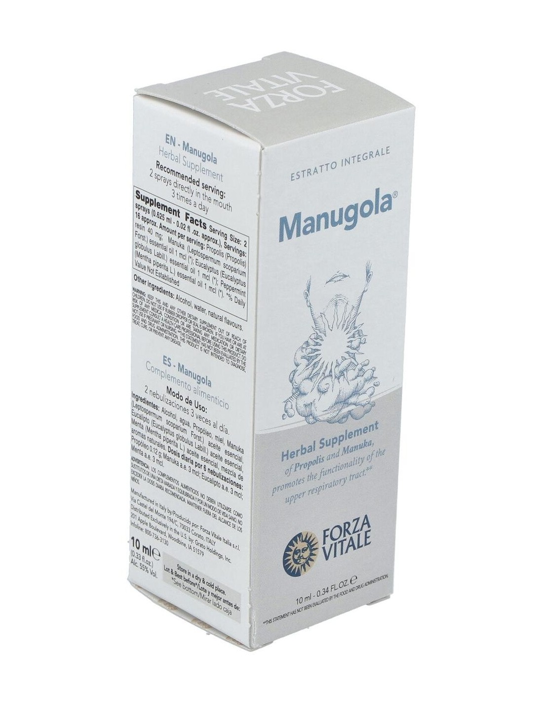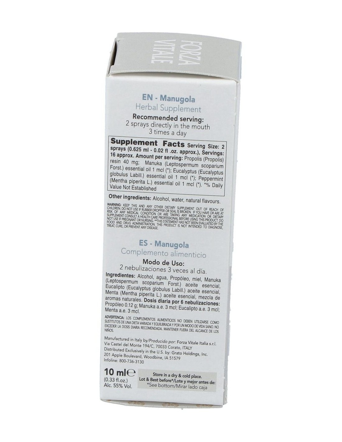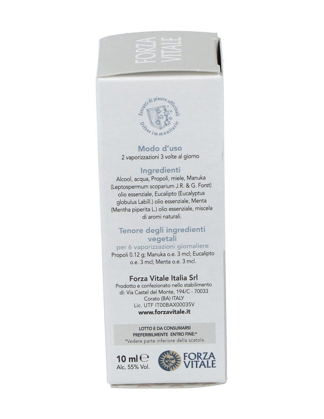 Ingredientes:Alcohol, Agua, Propóleos (Propolis), miel, aceites esenciales de: Manuka (Leptospermum scoparium), Eucalipto (Eucalyptus globulus), Menta (Mentha piperita); mezcla de aromas naturales. Ingredientes activos por dosis diaria (6 vaporizaciones):