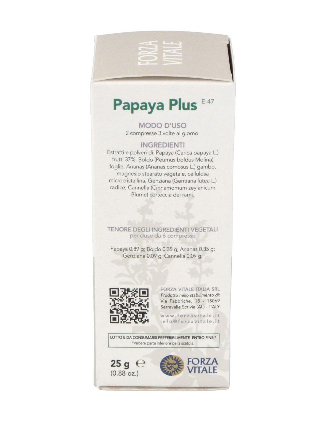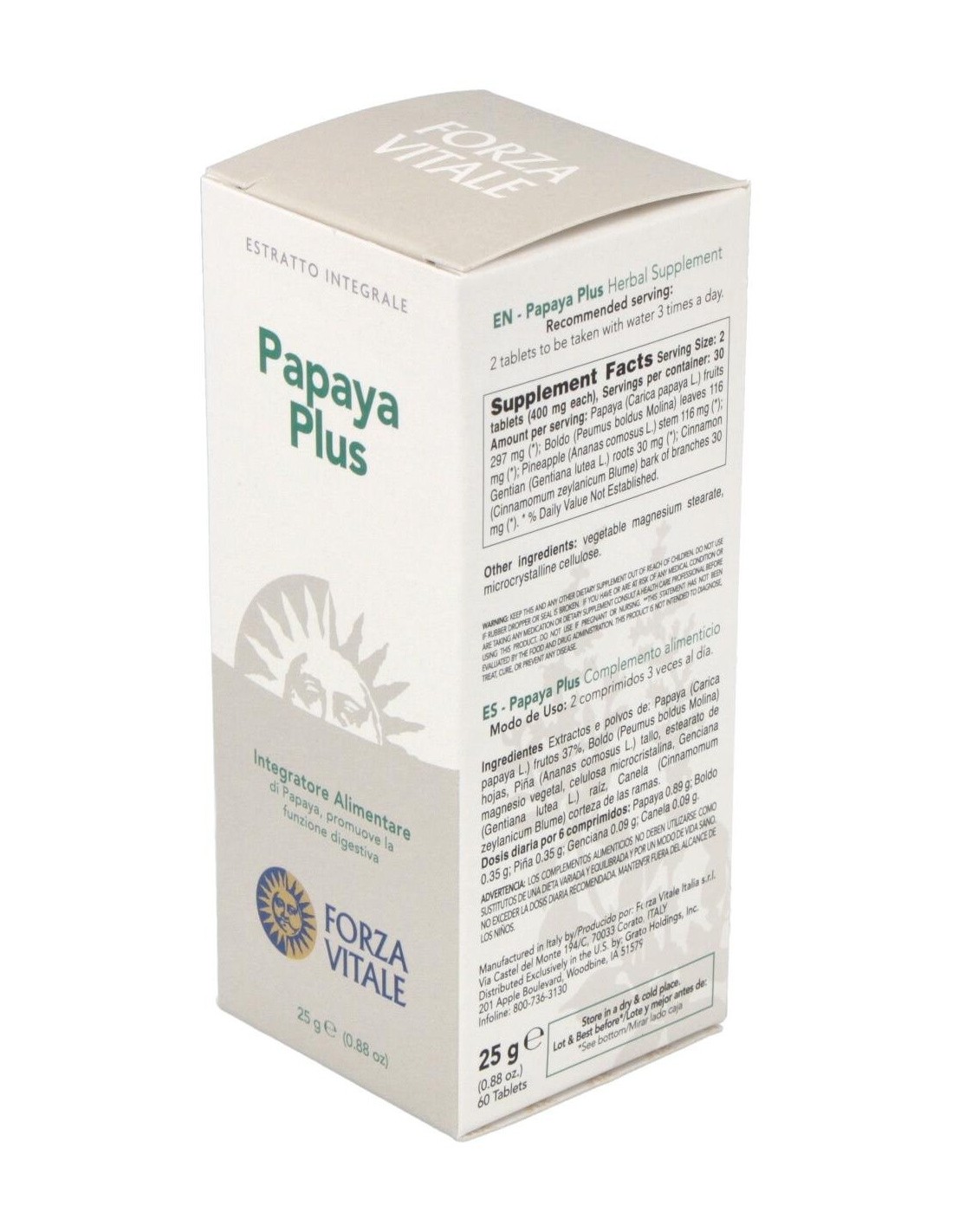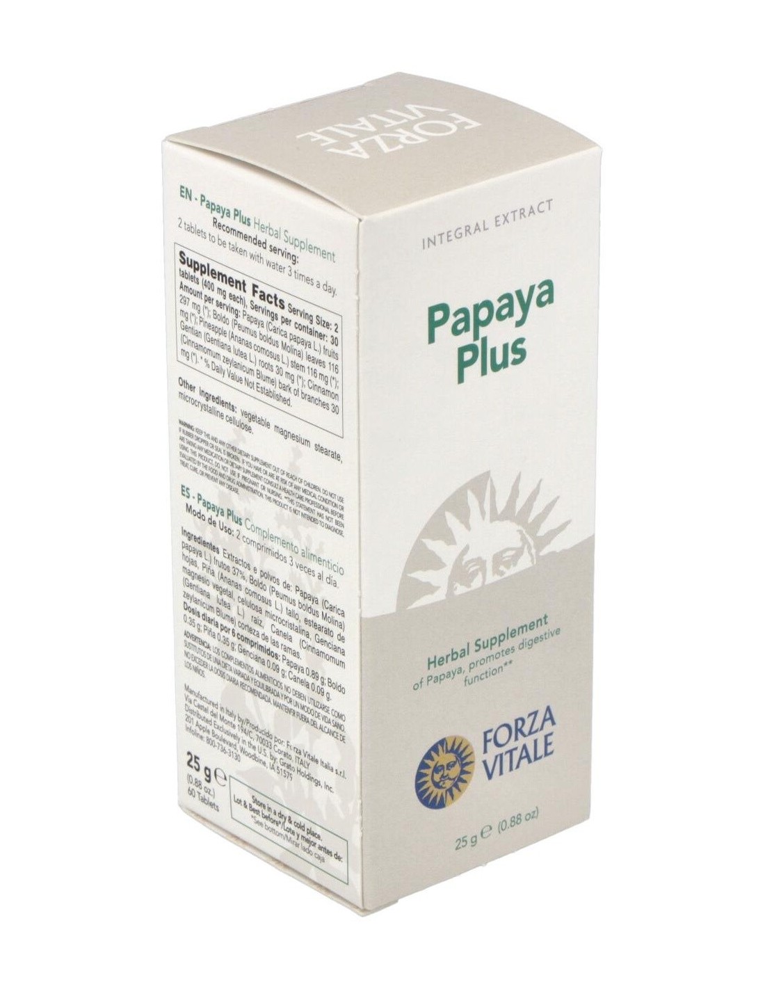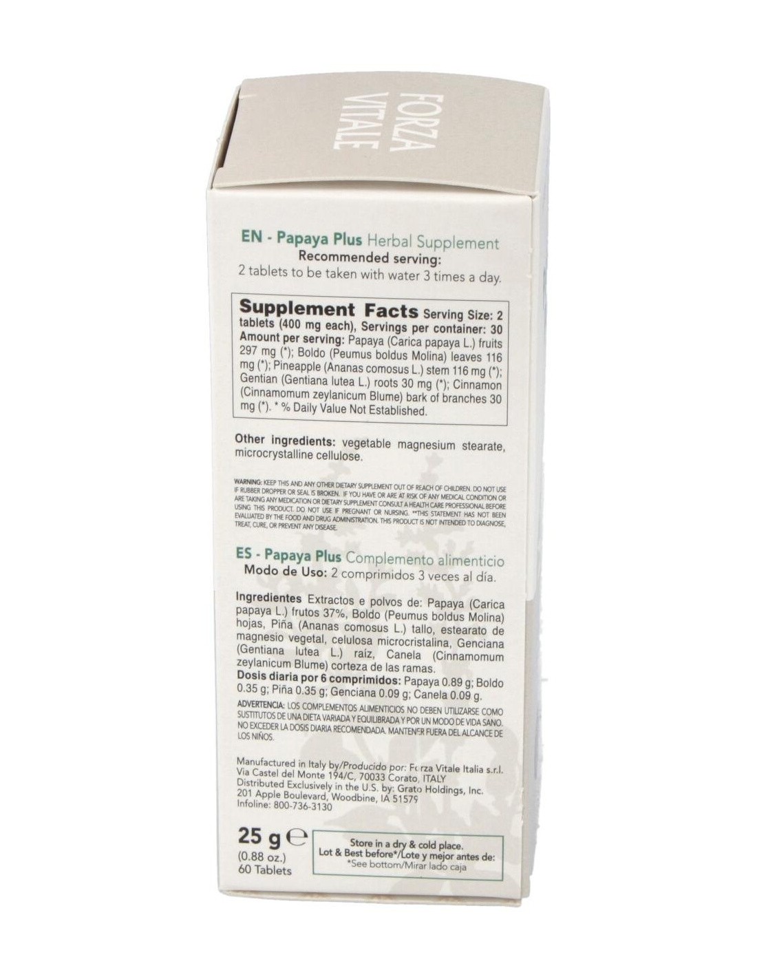 Ingredientes:Extractos y Pulverizados de: Papaya (Carica papaya) frutos 37%, Boldo (Peumus boldus) hojas, Piña (Piña sativus) tallo, magnesio estearato vegetal, celulosa microcristalina, cutina, Genciana (Gentiana lutea) raíz, Canela (Cinnamomum zeylanicum) corteza de las ramas. Ingredientes activos por dosis diaria (6 comprimidos):