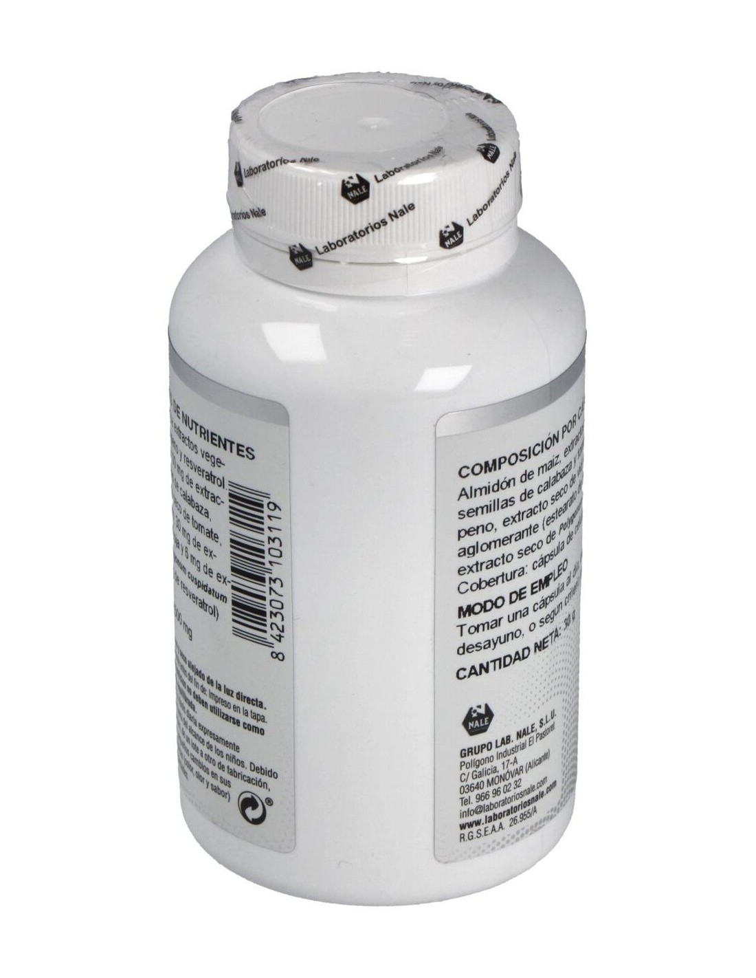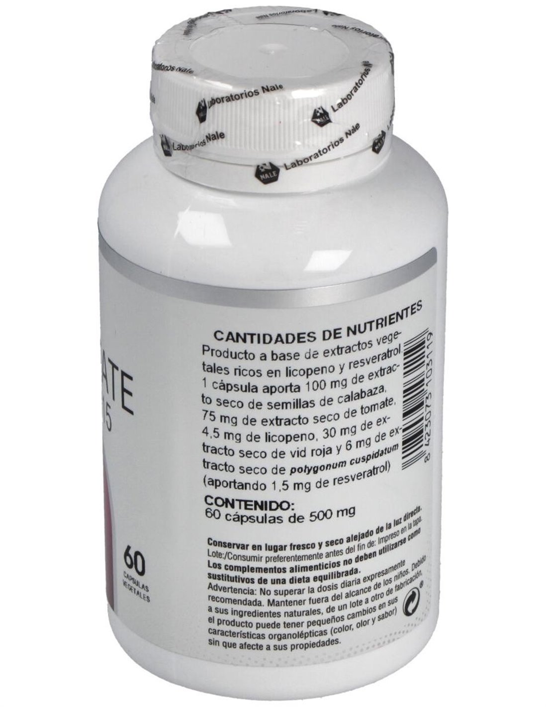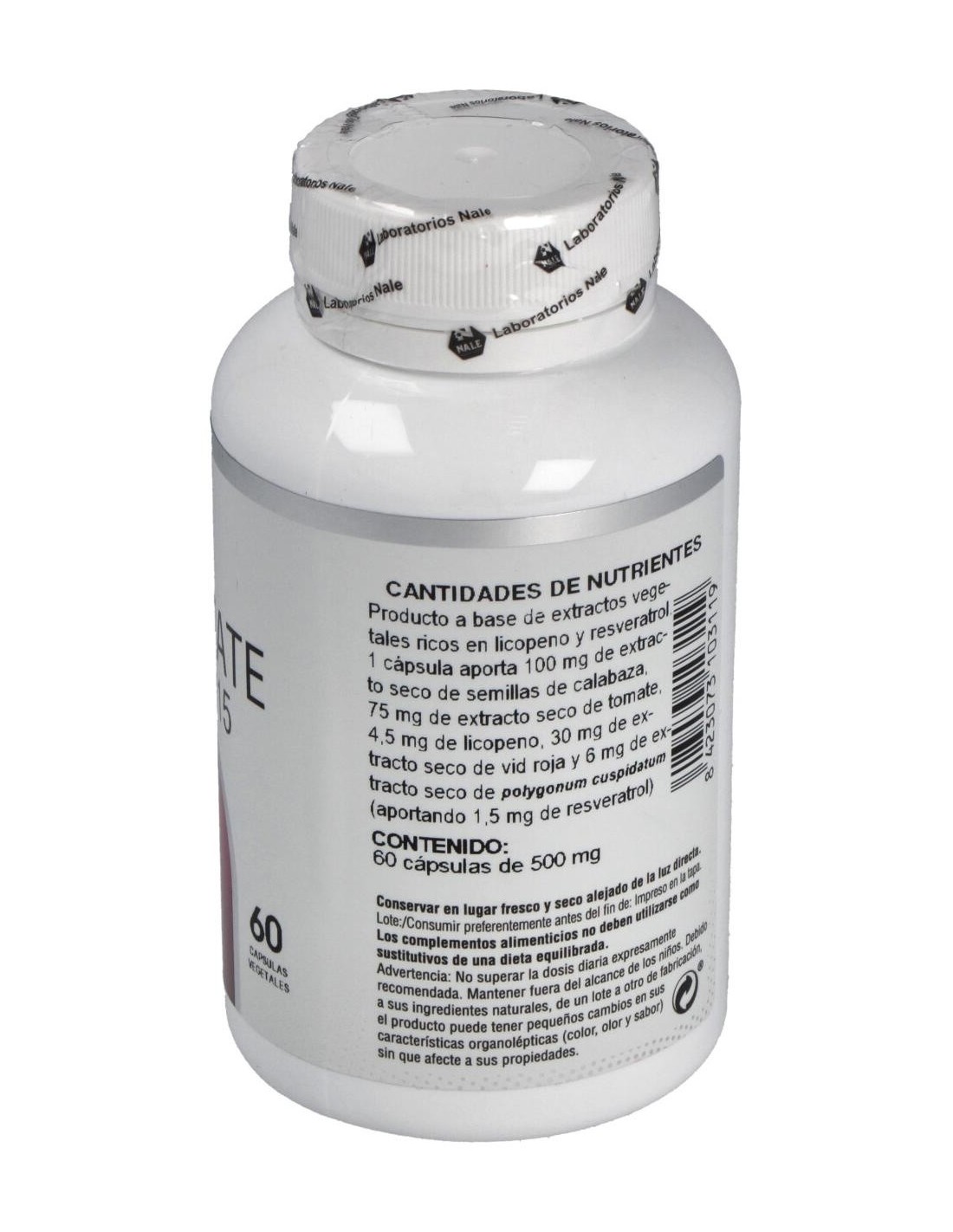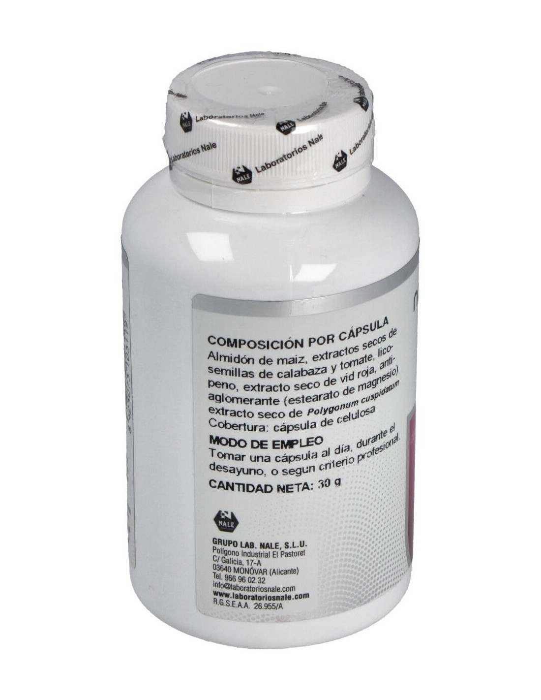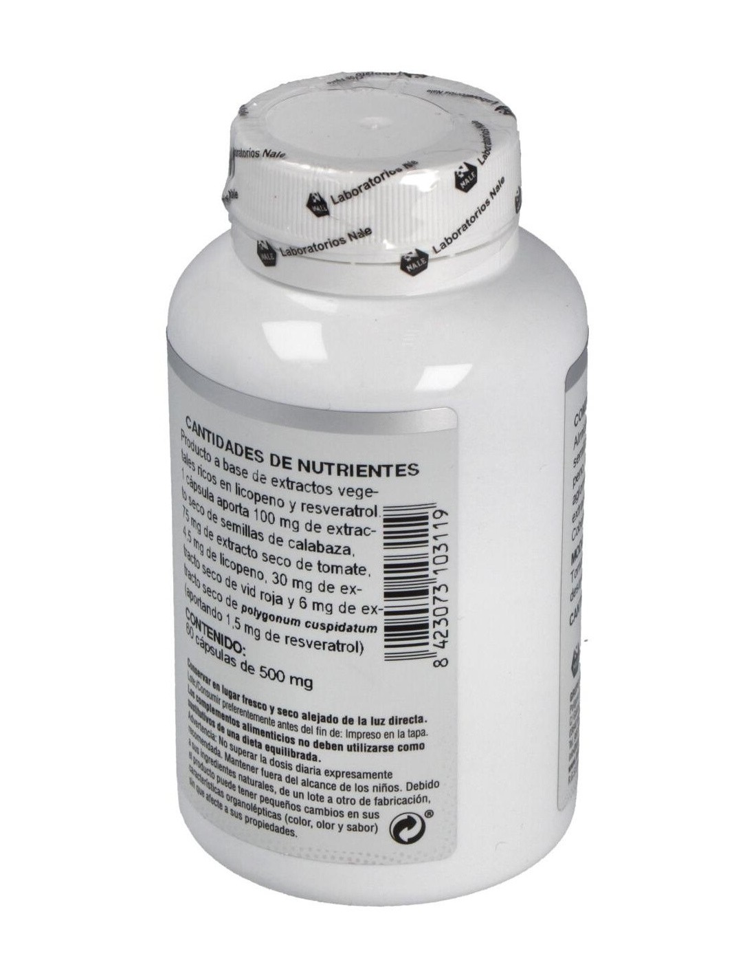Almidón de maíz, extractos secos de semillas de calabaza y tomate, licopeno, extracto seco de vid roja, antiaglomerante (estearato de magnesio),extracto seco de Polygonum cuspidatum. Cobertura: cápsula de celulosa (hipromellosa).