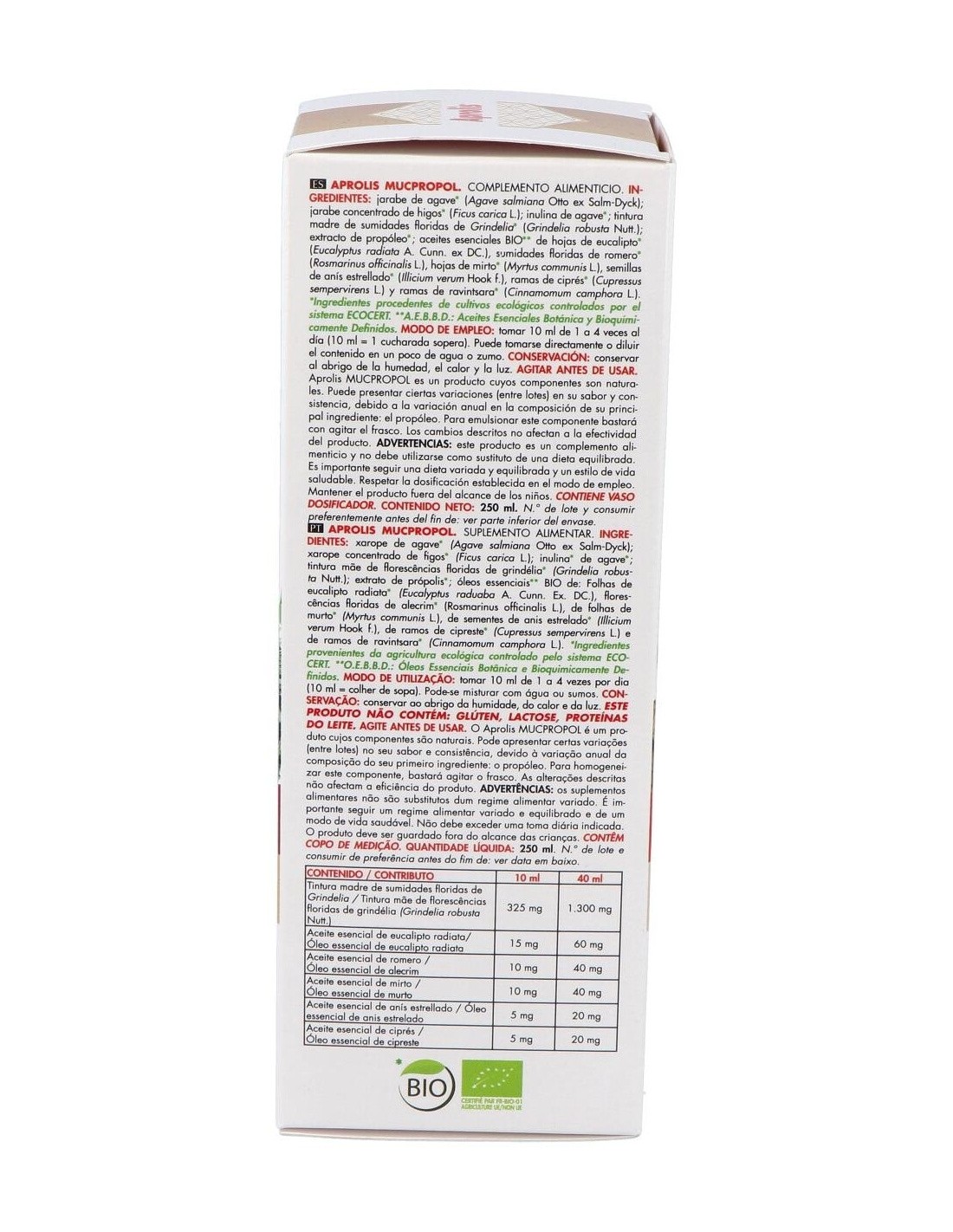 Jarabe de ágave* (Agave salmiana Otto ex Salm-Dyck): jarabe concentrado de higos* (Ficus carica L.): inulina de agave*: tintura madre de sumidades floridas de Grindelia* (Grindelia robusta Nutt.): extracto de propóleo*: aceites esenciales BIO** de hojas de eucalipto* (Eucalyptus radiata A. Cunn. ex DC.), sumidades floridas de romero* (Rosmarinus officinalis L.), hojas de mirto* (Myrtus communis L.), semillas de anís estrellado* (Illicium verum Hook f.), ramas de ciprés* (Cupressus sempervirens L.) y ramas de ravintsara* (Cinnamomum camphora L.).