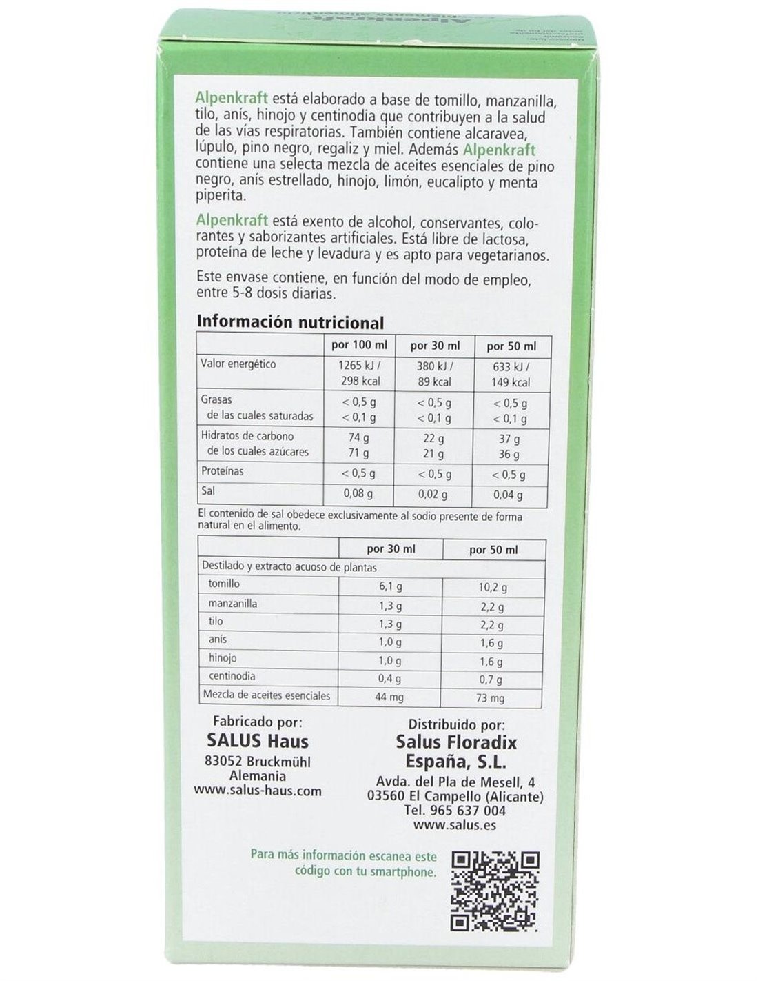 Alpenkraft es un jarabe destinado al cuidado de la cavidad orofaringea, la garganta y el sistema bronquial. Sus aceites esenciales inhiben la proliferación de gérmenes en las sensibles membranas mucosas de los órganos respiratorios, evitando de este modo el riesgo de sufrir infecciones y reduciéndose la vulnerabilidad frente a procesos catarrales, tos, ronquera, resfriados, exceso de mucosidades, garganta irritada, etc. Alpenkraft estimula de forma general la autolimpieza de los órganos respiratorios activando de manera natural las membranas mucosas.